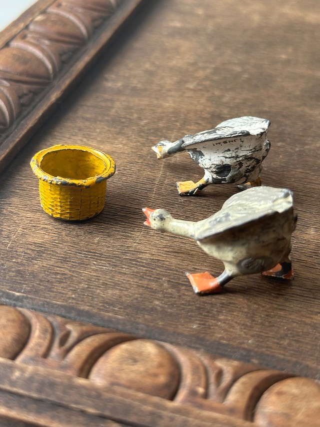 イギリス、ヴィンテージのミニチュア。ガチョウ2羽と餌入れのセットです。 餌をついばむような、前かがみで尾を上げた愛らしいポーズ。小さなサイズながら表情豊かな造形が魅力です。 剥がれたペイントが、長い年月を物語ります。 ヴィンテージならではの風合いとしてお楽しみください。 棚の片隅に、ささやかな英国の情景作り上げると素敵ですね。 買い付け国  イギリス ヴィンテージ 材質     鉛製 サイズ  鳥 全長3.8× 厚み2.3× 高さ2.1 (cm)   餌入れ 直径2.0 × 高さ1.9(cm) 状態     ペイントの剥がれ 汚れ 鳥1つ製造時に付いたと思われる        穴が空いています                 ※ 1枚目の画像が実物に近い色味になると思います。また光の加減で見え方に変化がある為、ゆっくりとご検討の上ご注文くださいませ。 ※ご購入お手続きの前にトップページにありますショップ情報またはABOUTを必ずお読み下さい。