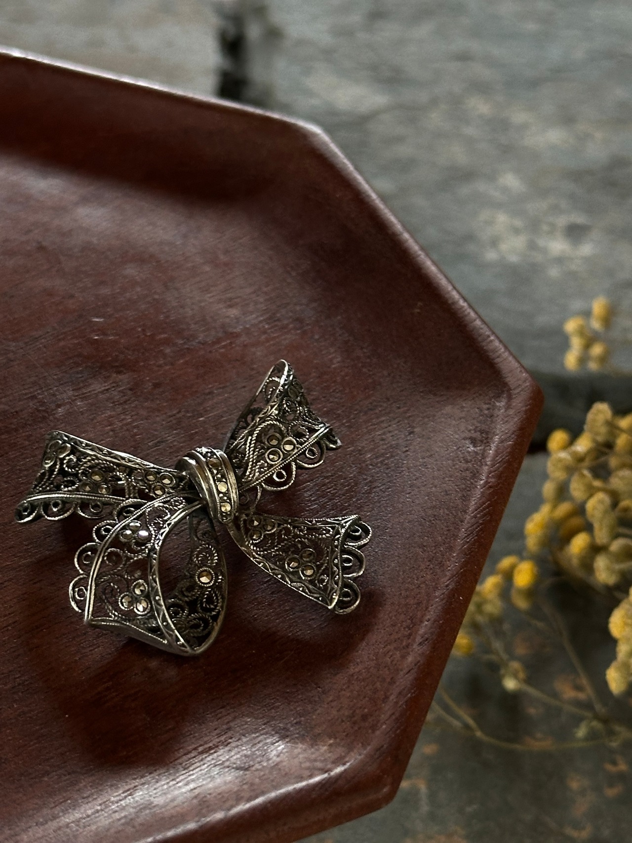 フィリグリー装飾の中にラインストーンが散りばめられており光にかざすとキラキラと美しい輝きが素敵です。
