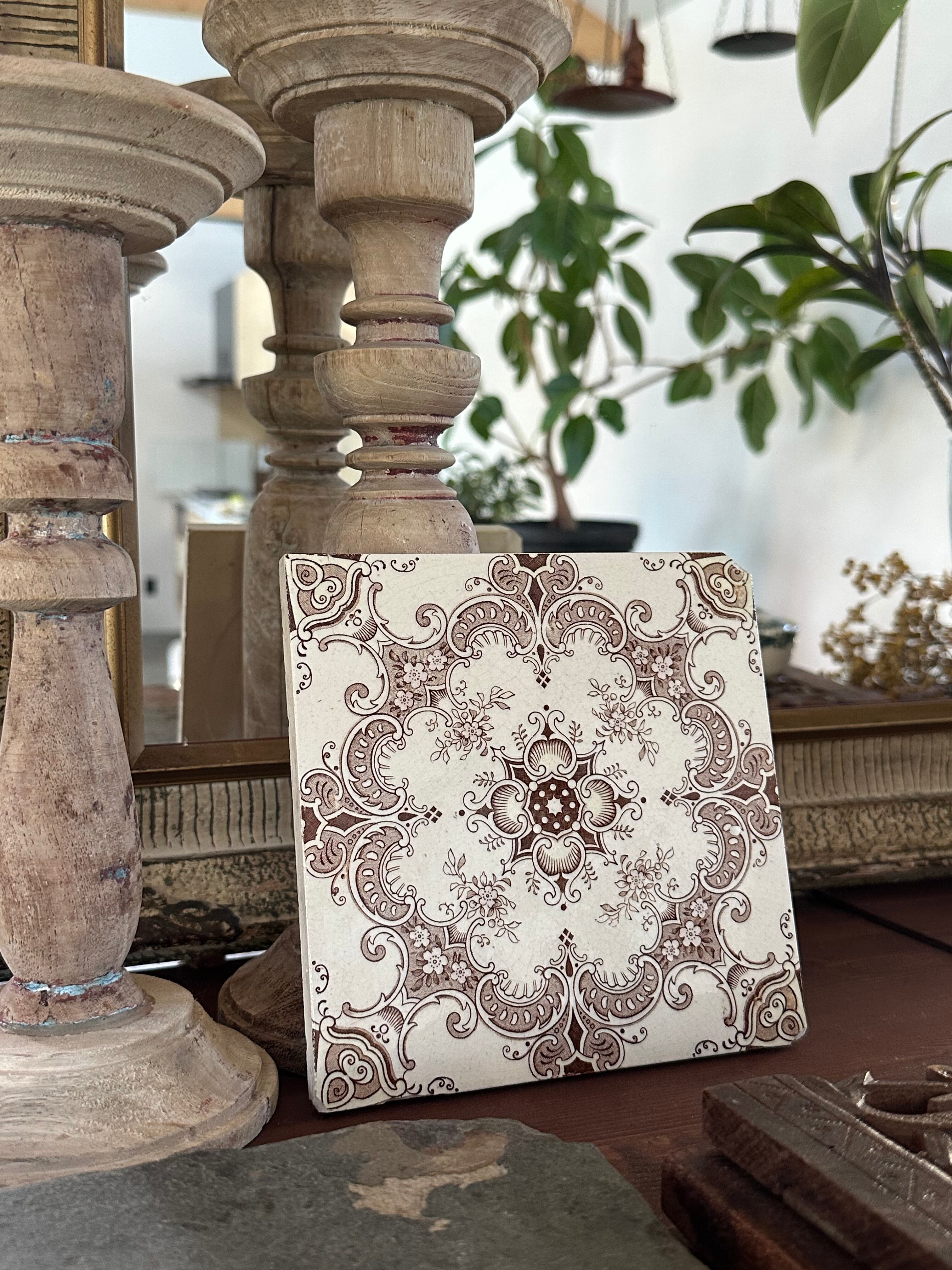 温かみある陶器の質感と、時の流れの中刻まれた貫入、ブラウンの深い色合いが相まった魅力あふれるヴィンテージタイル。