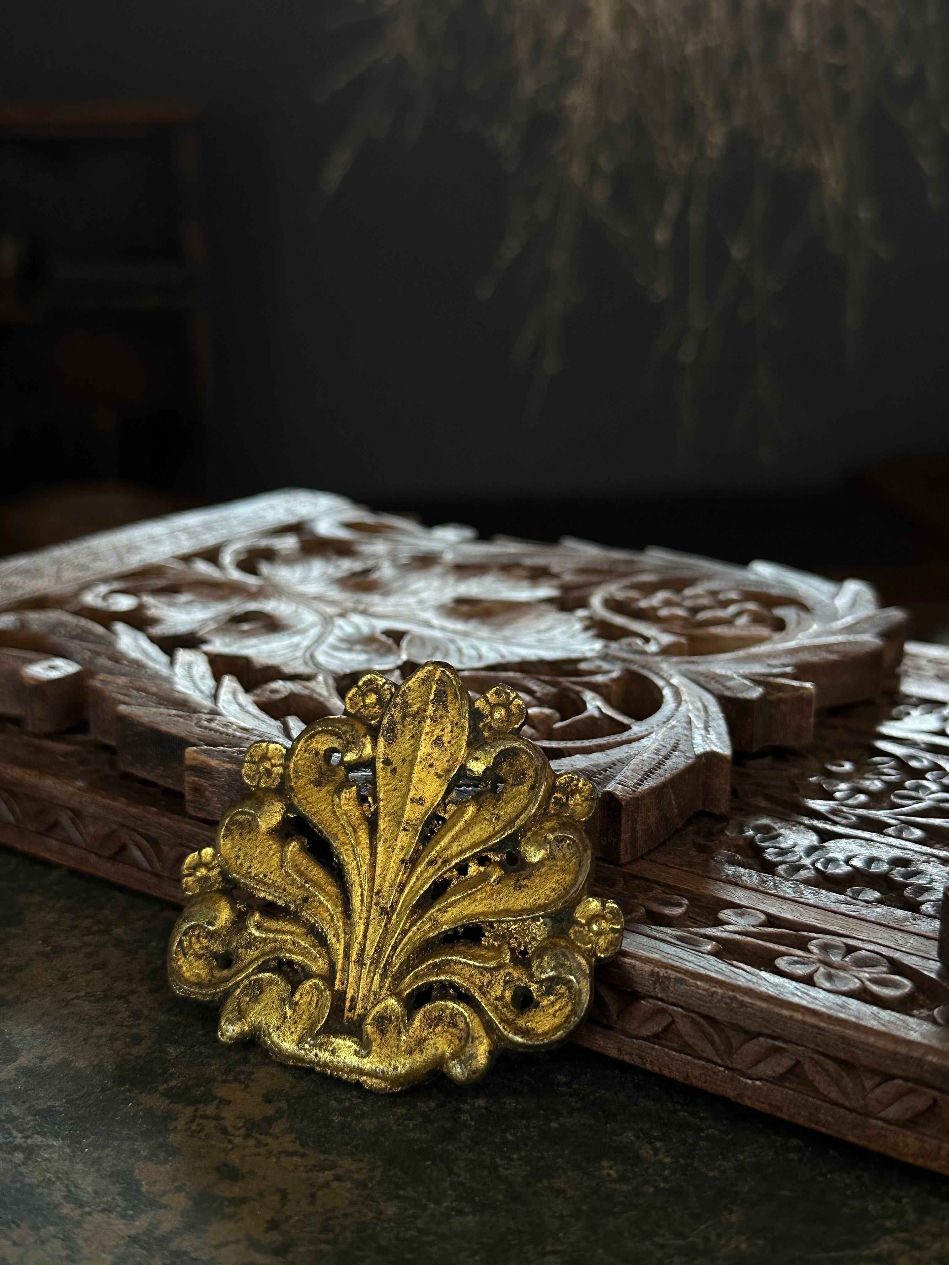 植物模様がが扇状に施された真鍮の古い装飾プレートです。