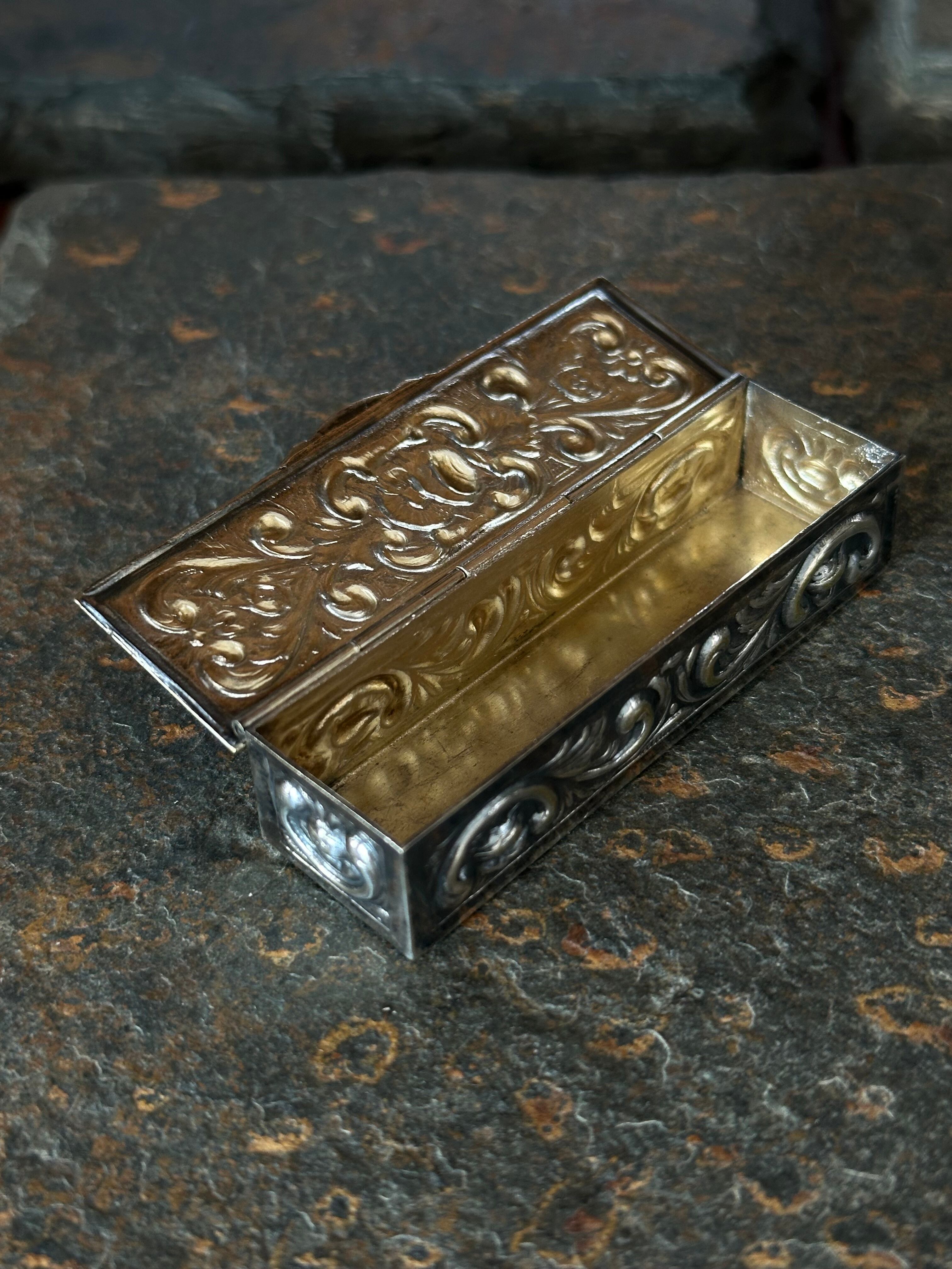 レリーフ装飾が光を受けてきらりと輝く小さな手のひらサイズのケースです。
