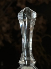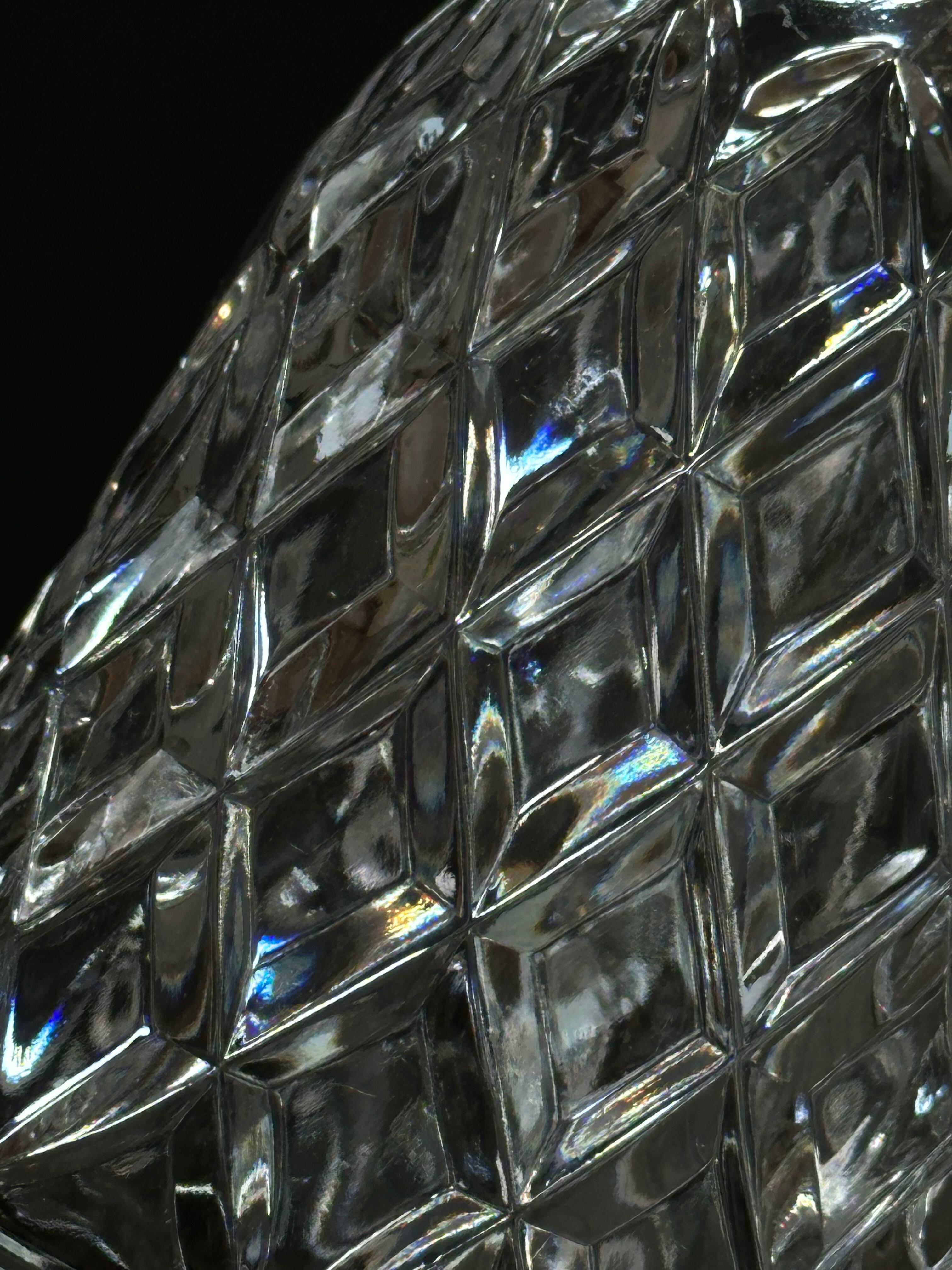 握り手からベル本体まで一体で作られており、側面にはダイヤカットのような立体的な模様が輝くプレスガラスです。