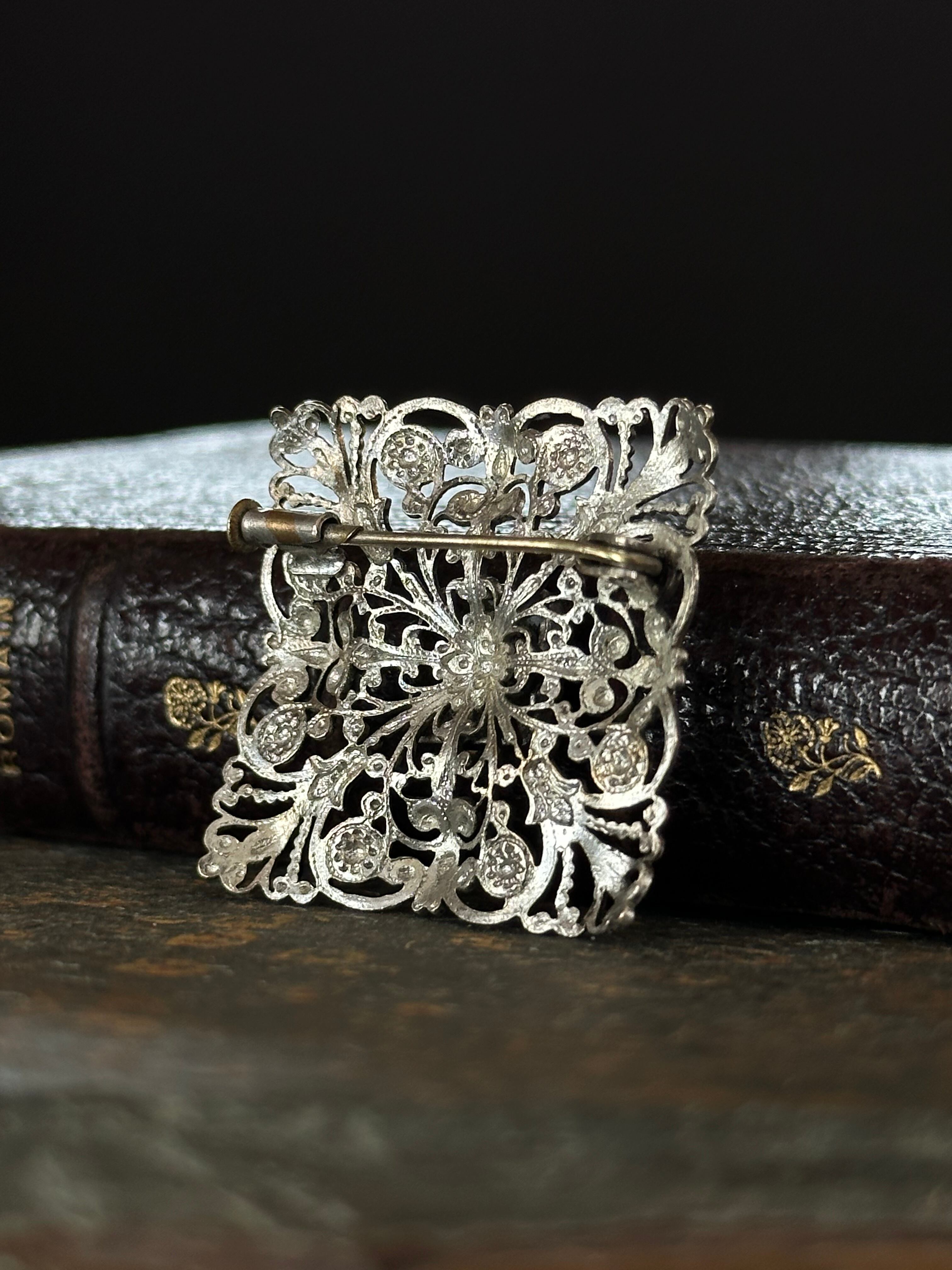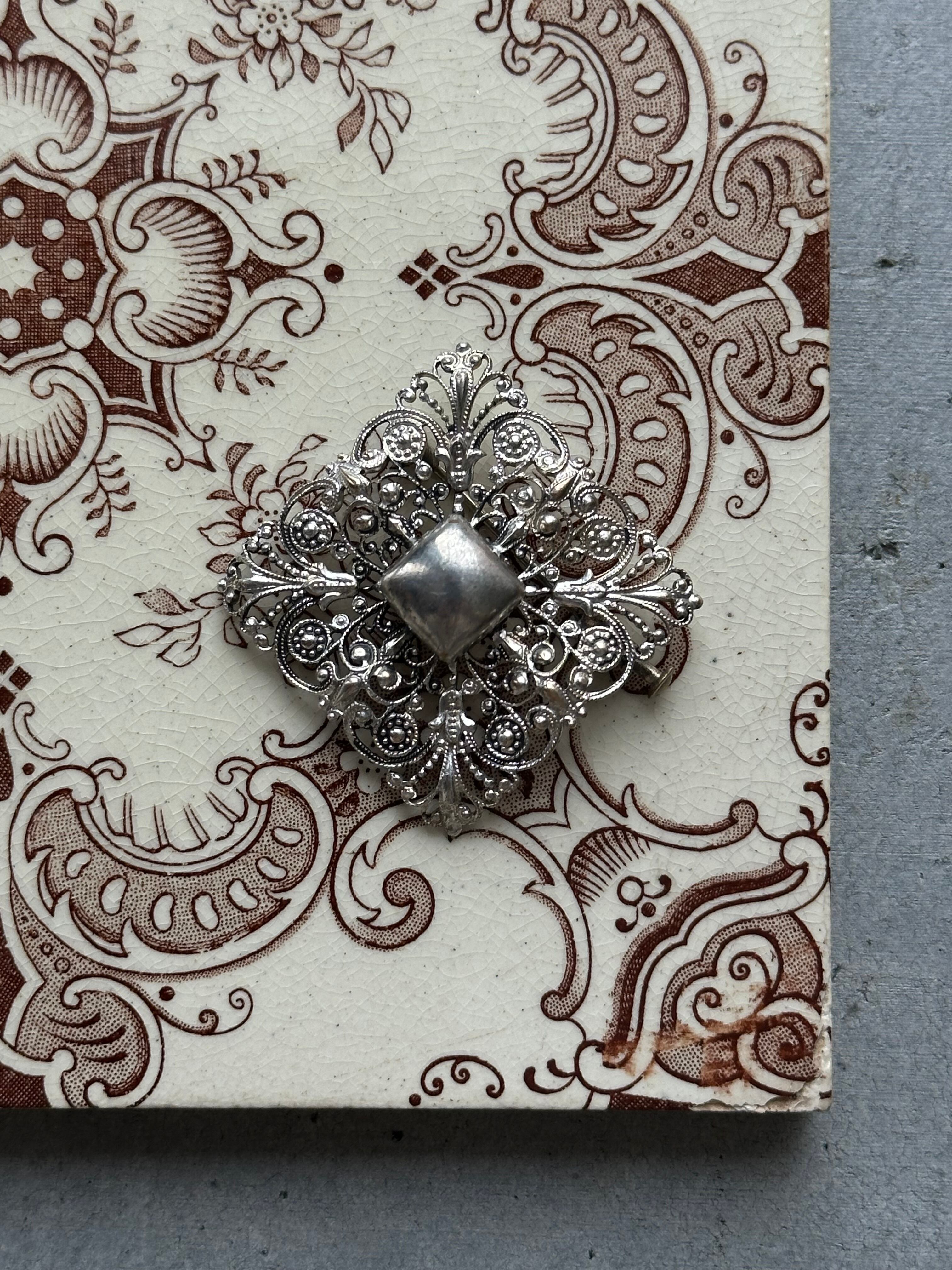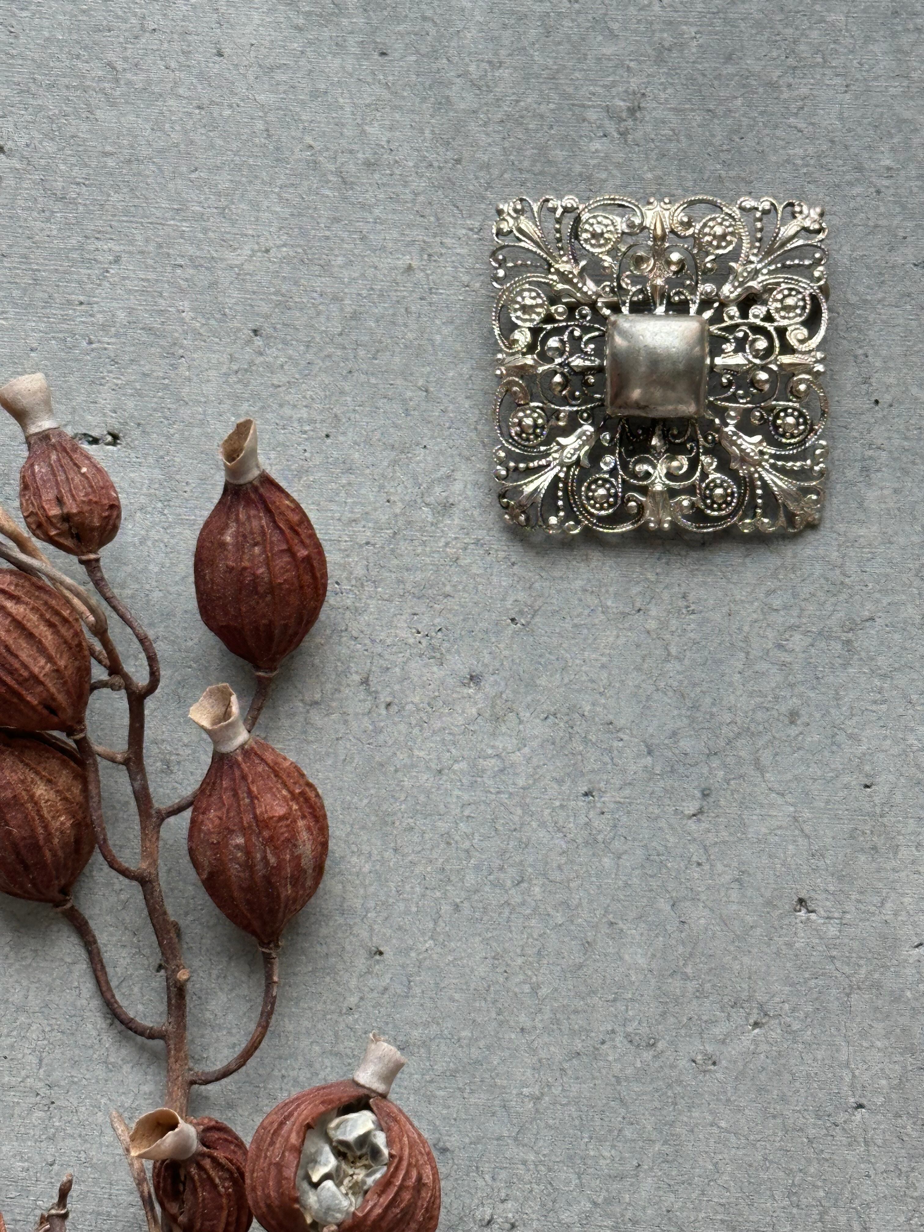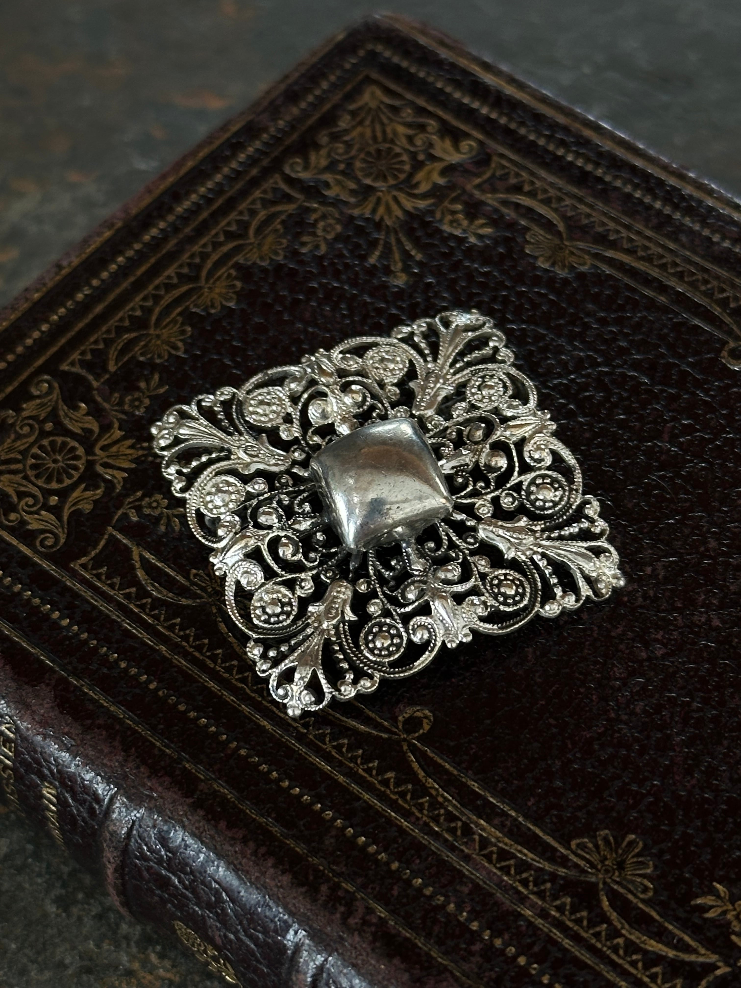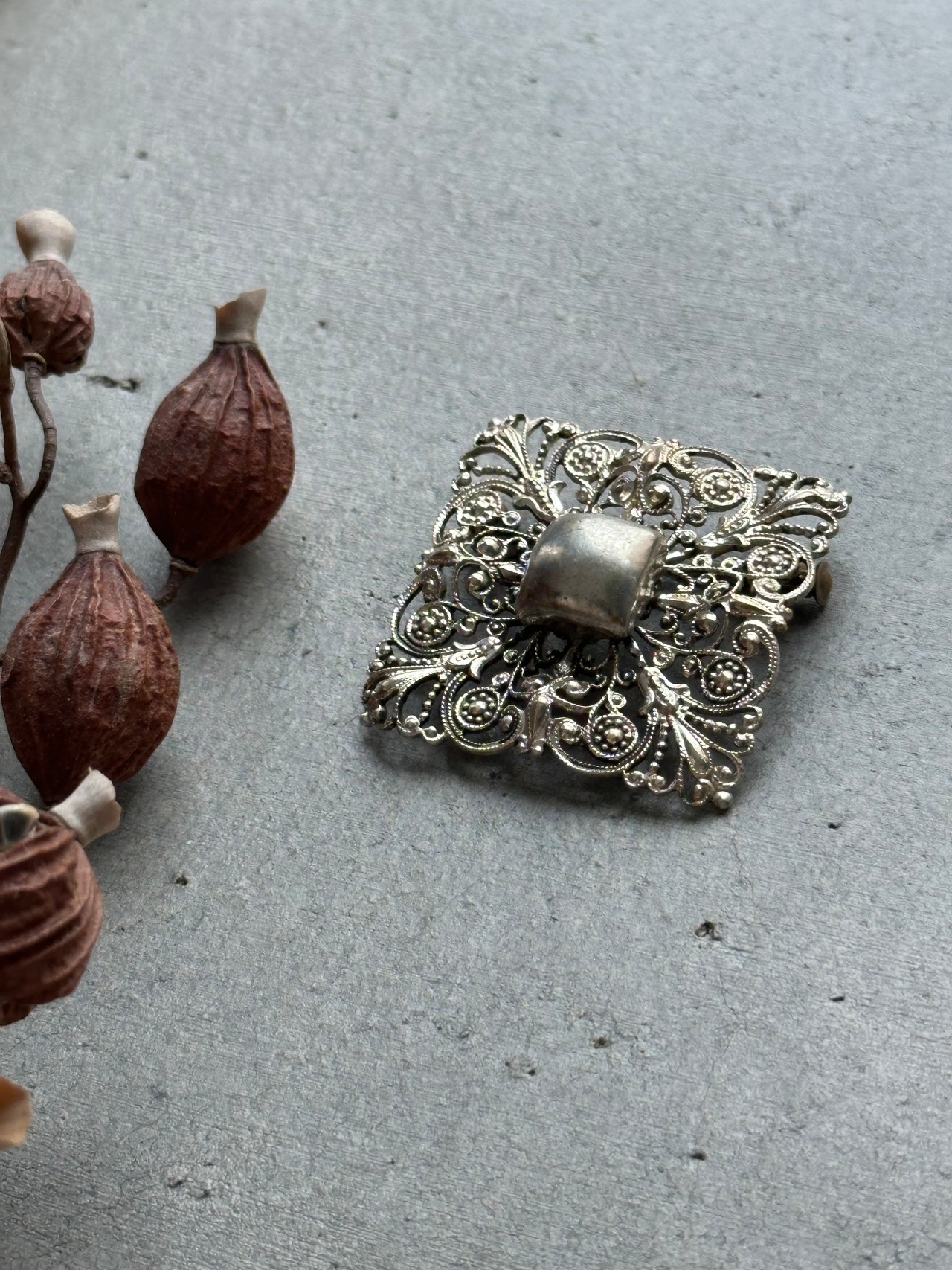 シルバーブローチ スクエアブローチ 透かし装飾 / フランスアンティーク ヴィンテージ アクセサリー 雑貨