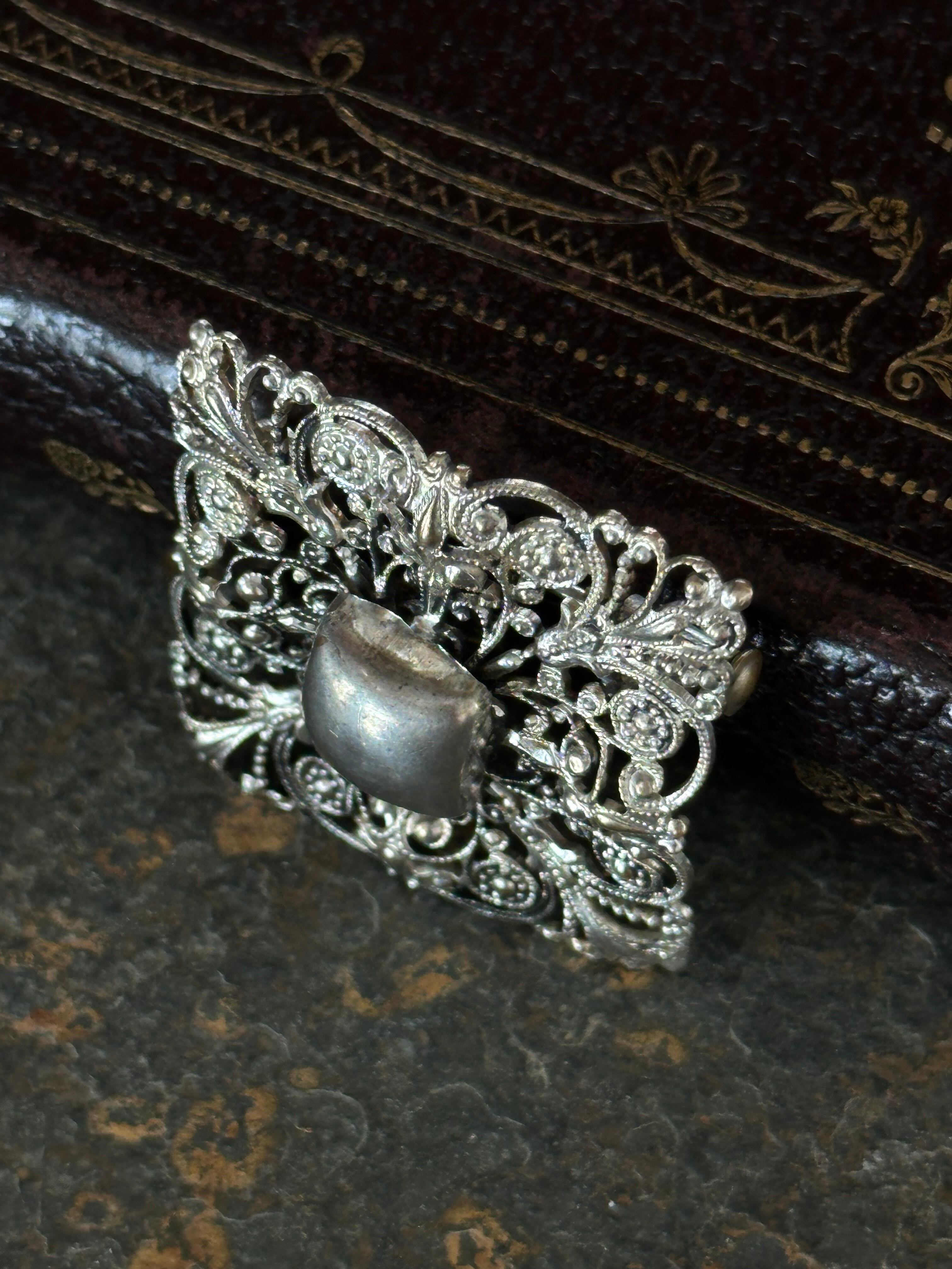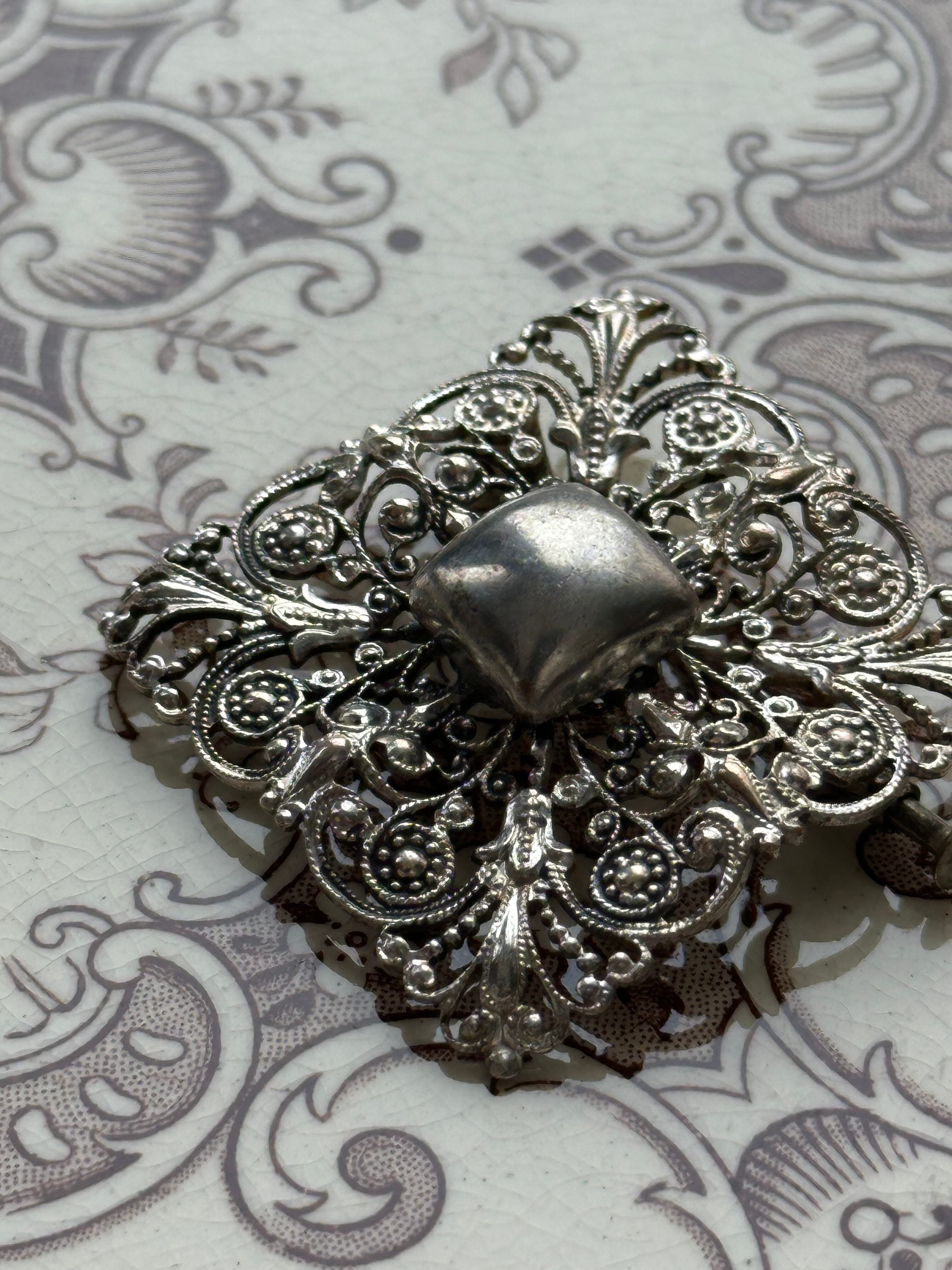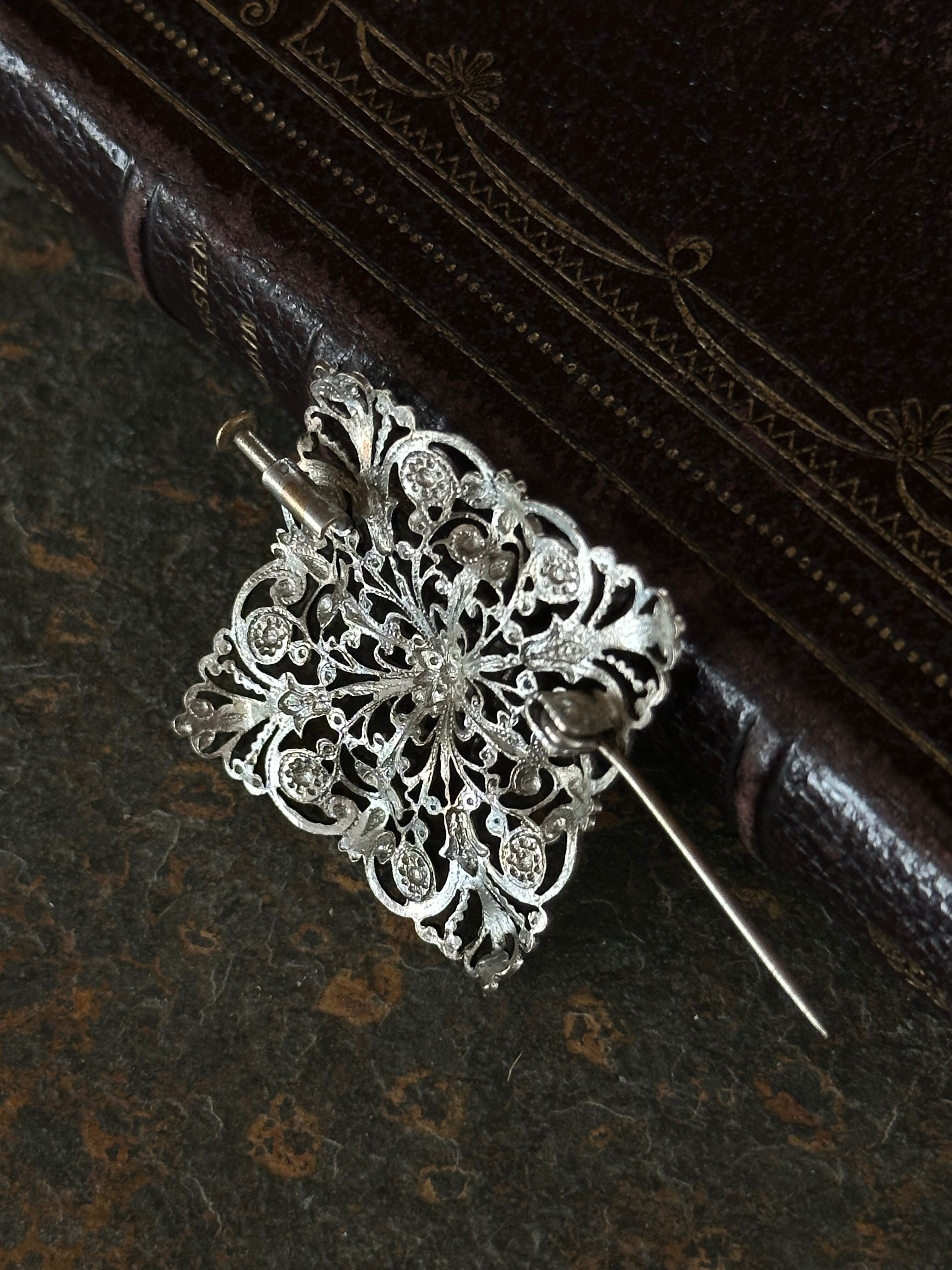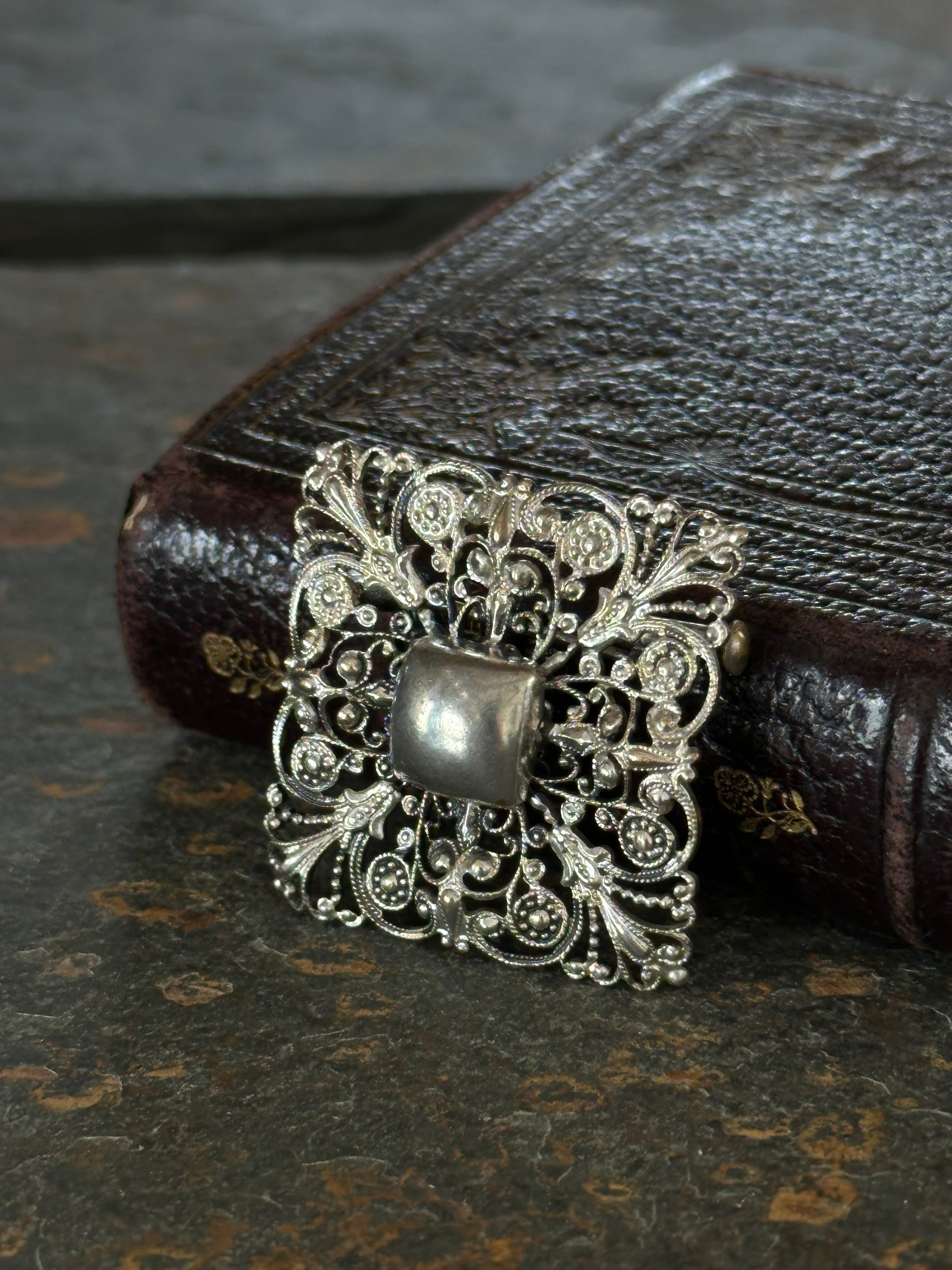 シルバーブローチ スクエアブローチ 透かし装飾 / フランスアンティーク ヴィンテージ アクセサリー 雑貨