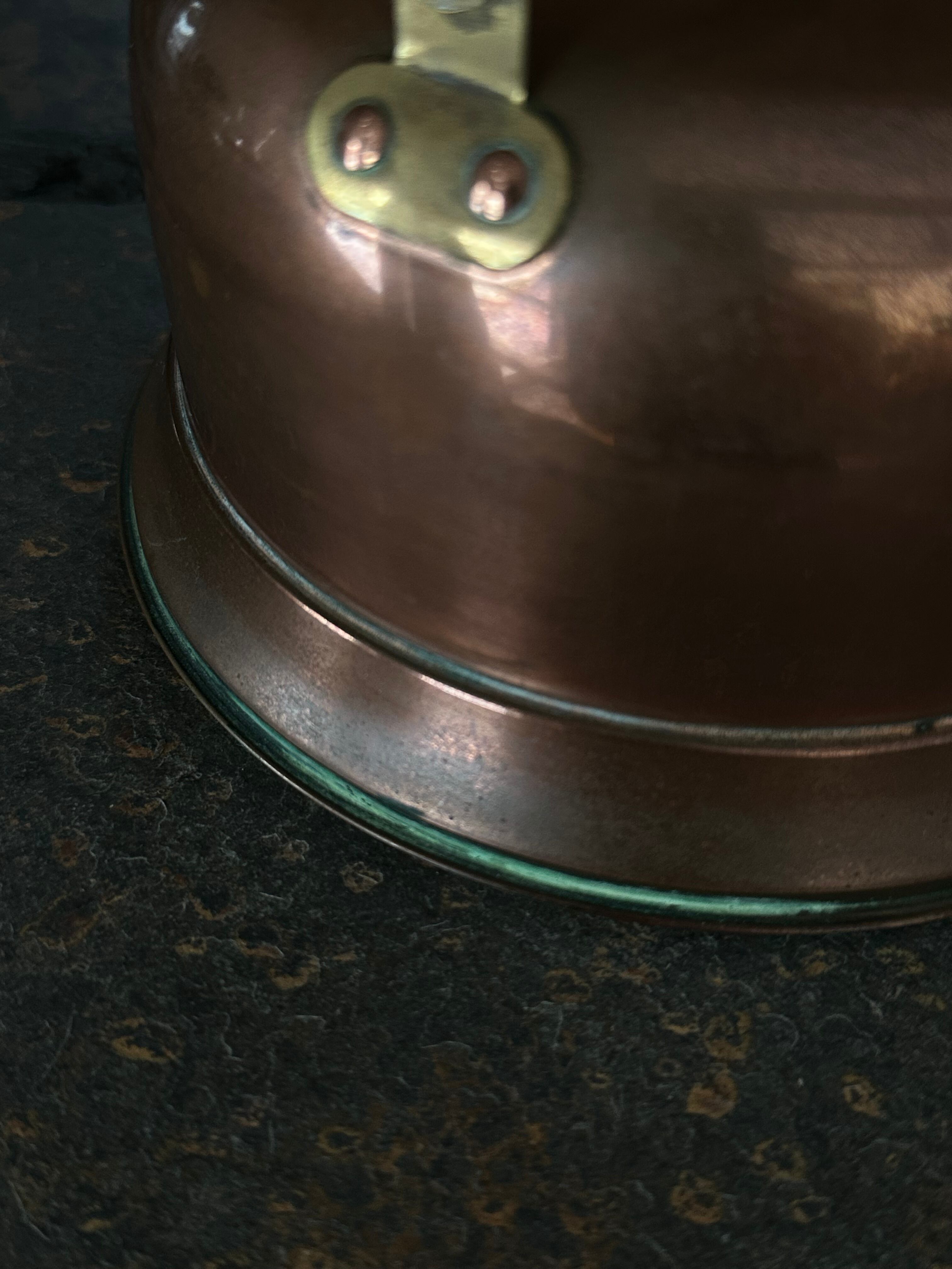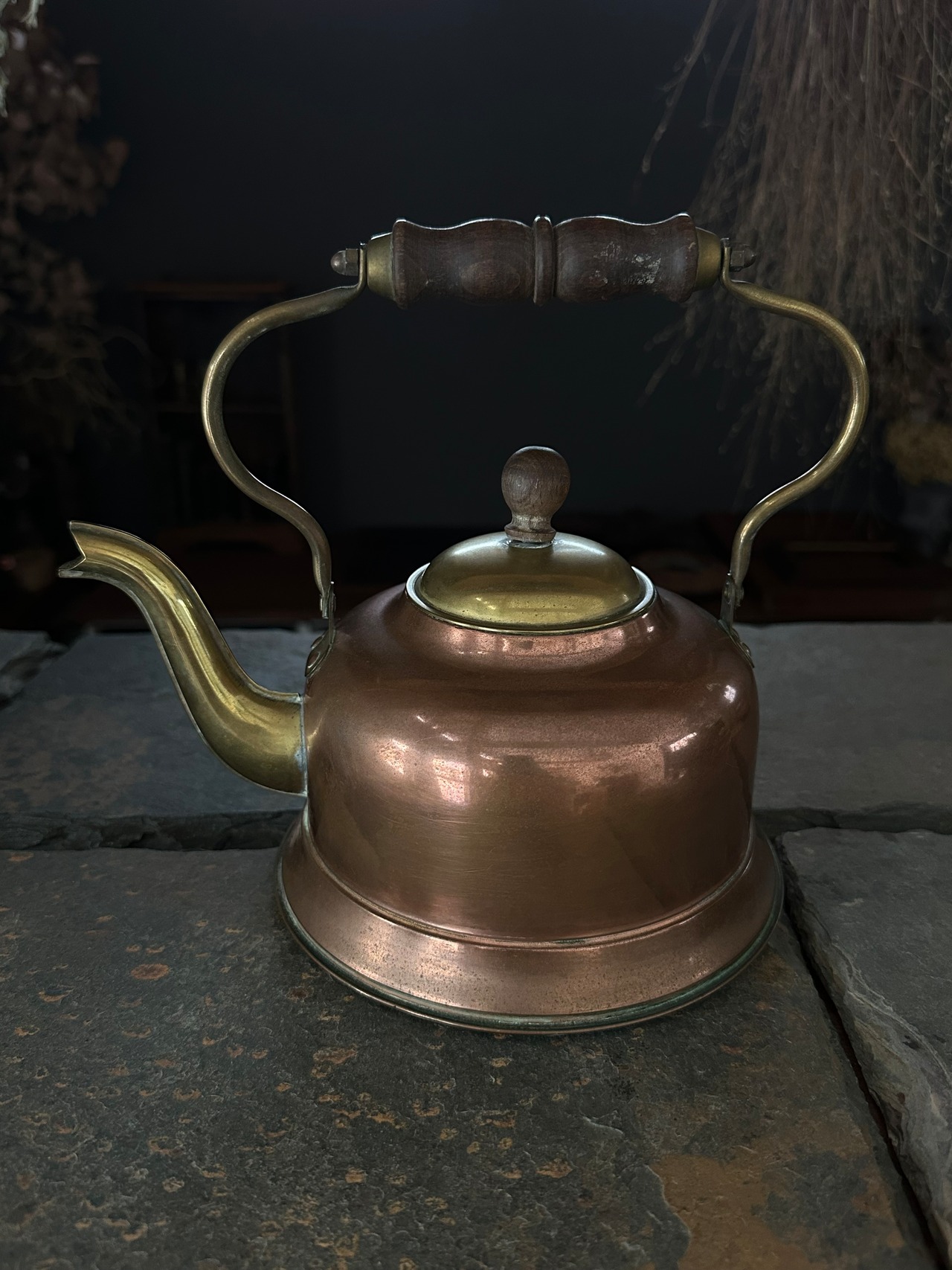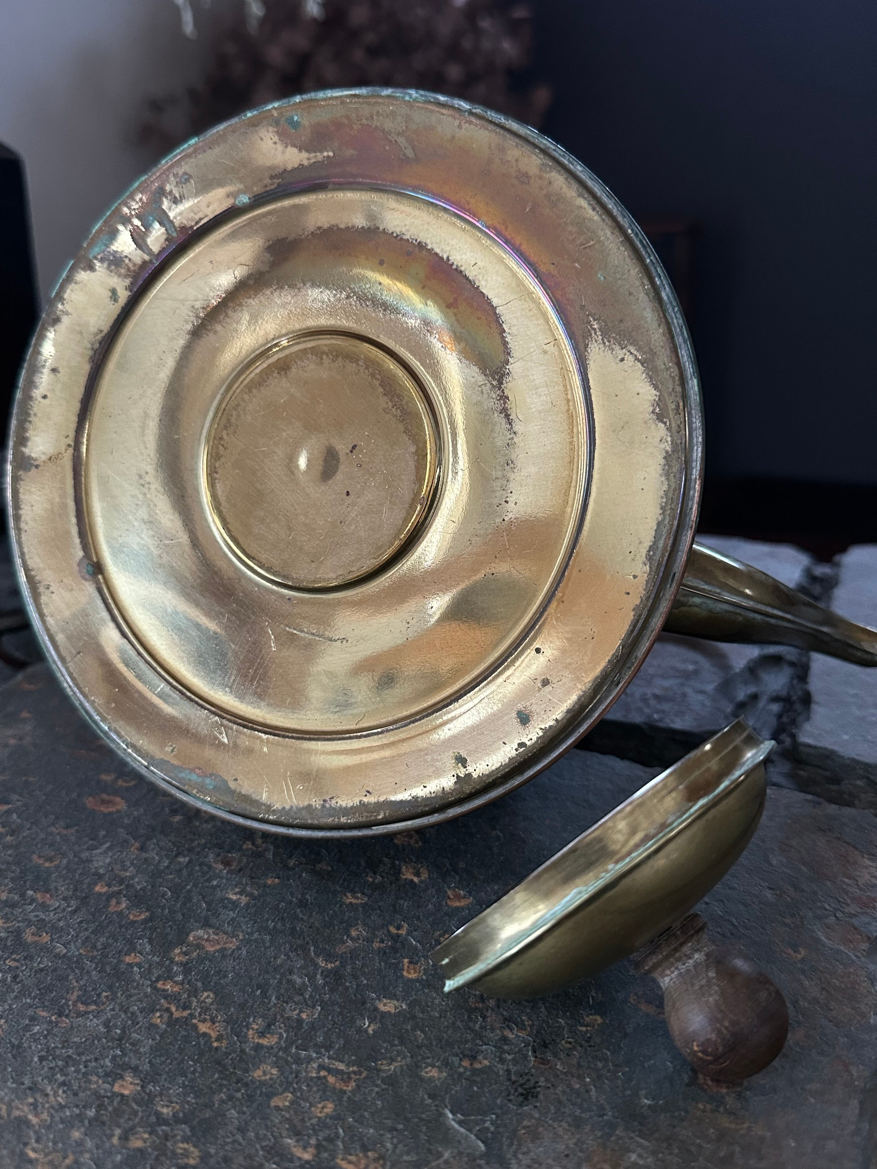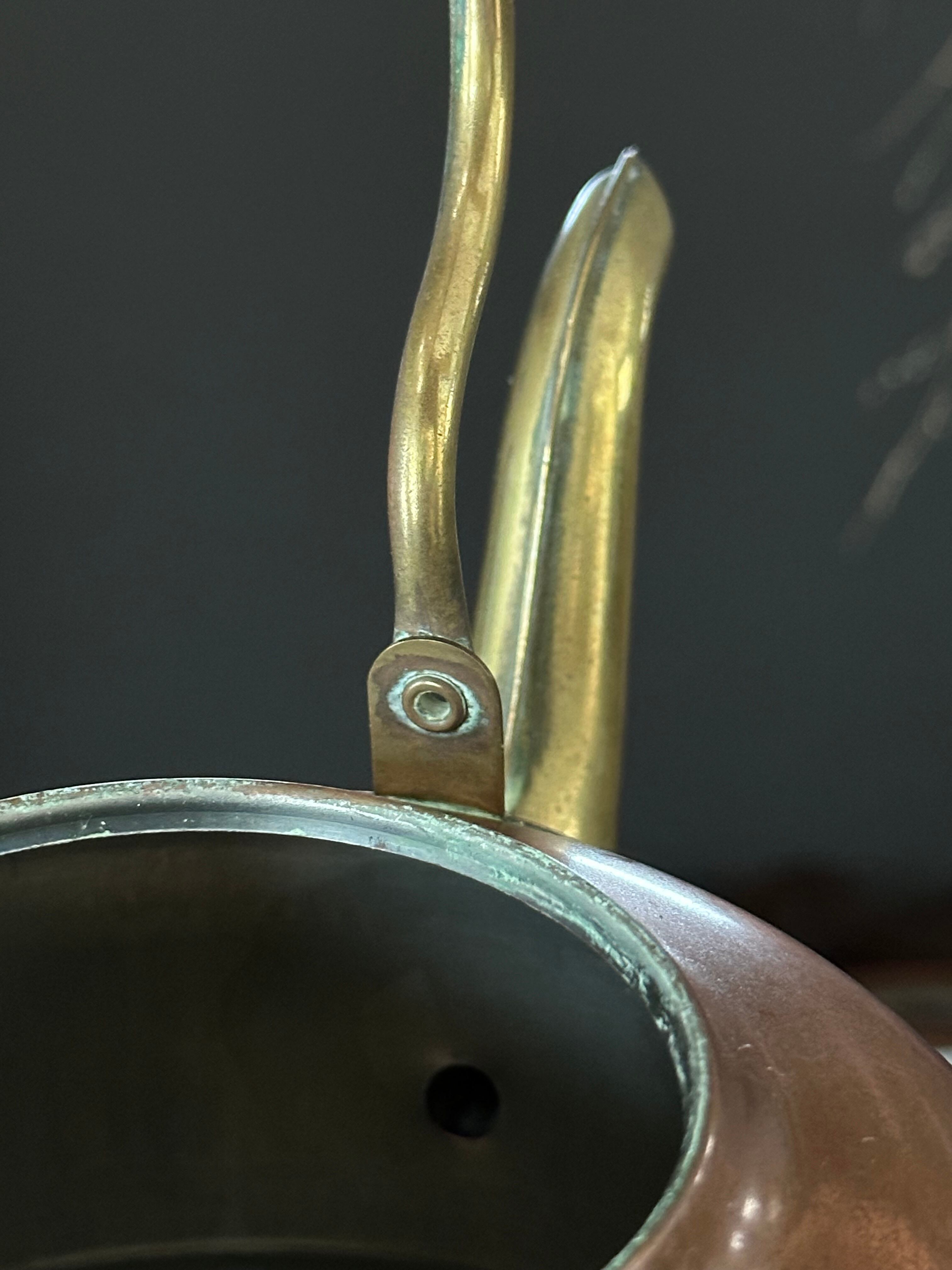 注ぎ口や蓋、持ち手の金具には真鍮が用いられ、銅とのコントラストが美しく、実用と装飾性のバランスが取れた佇まいです。