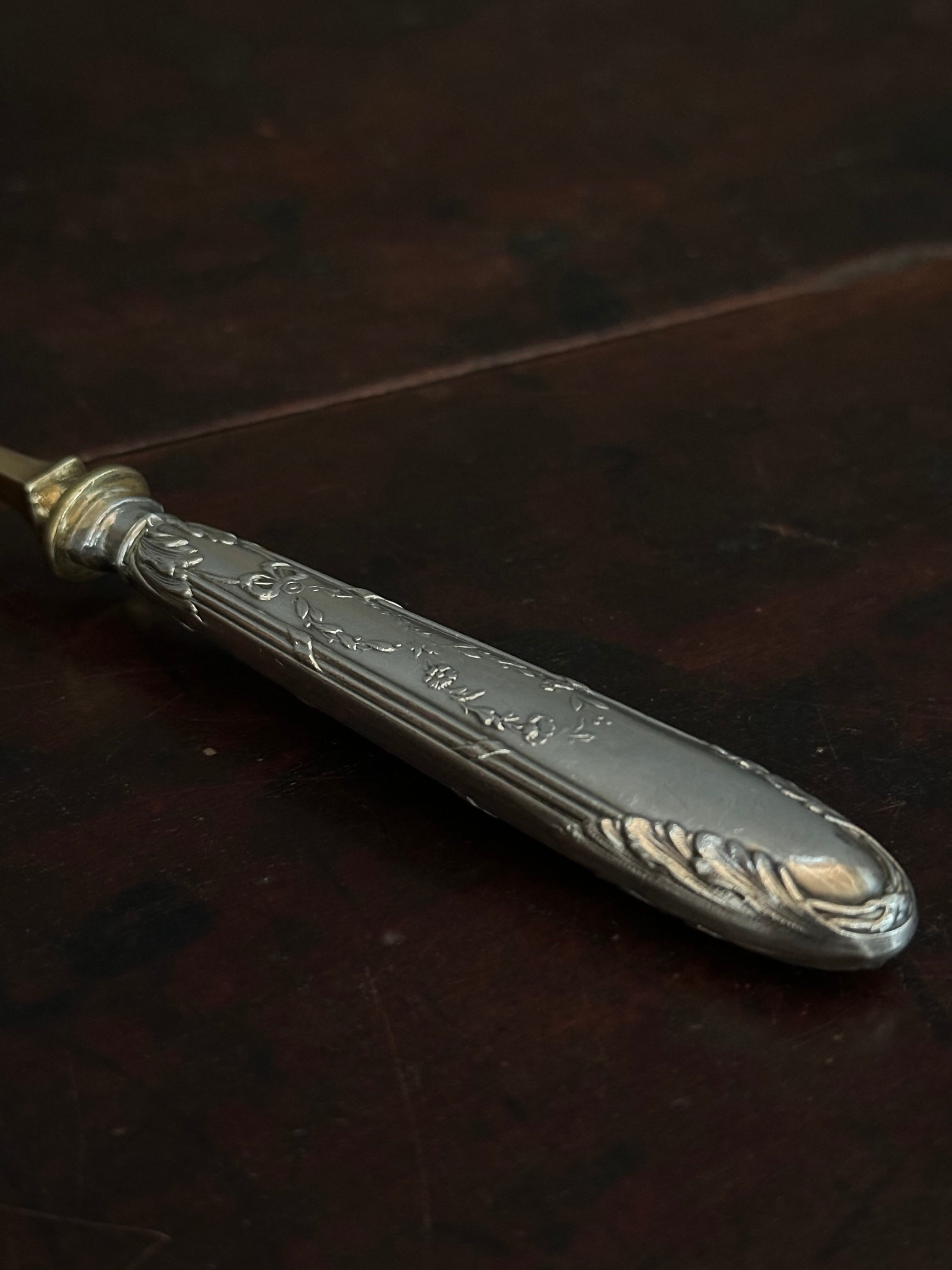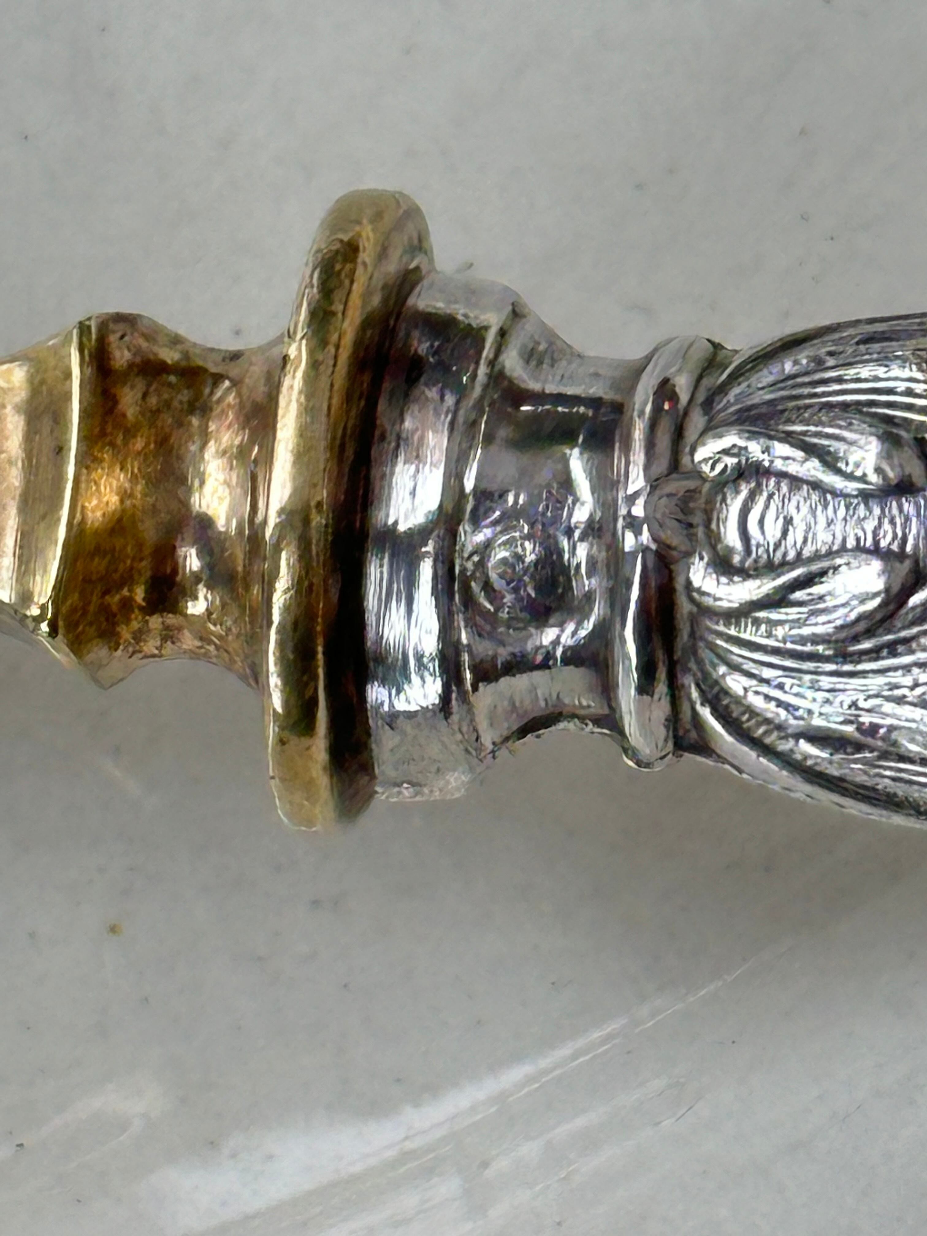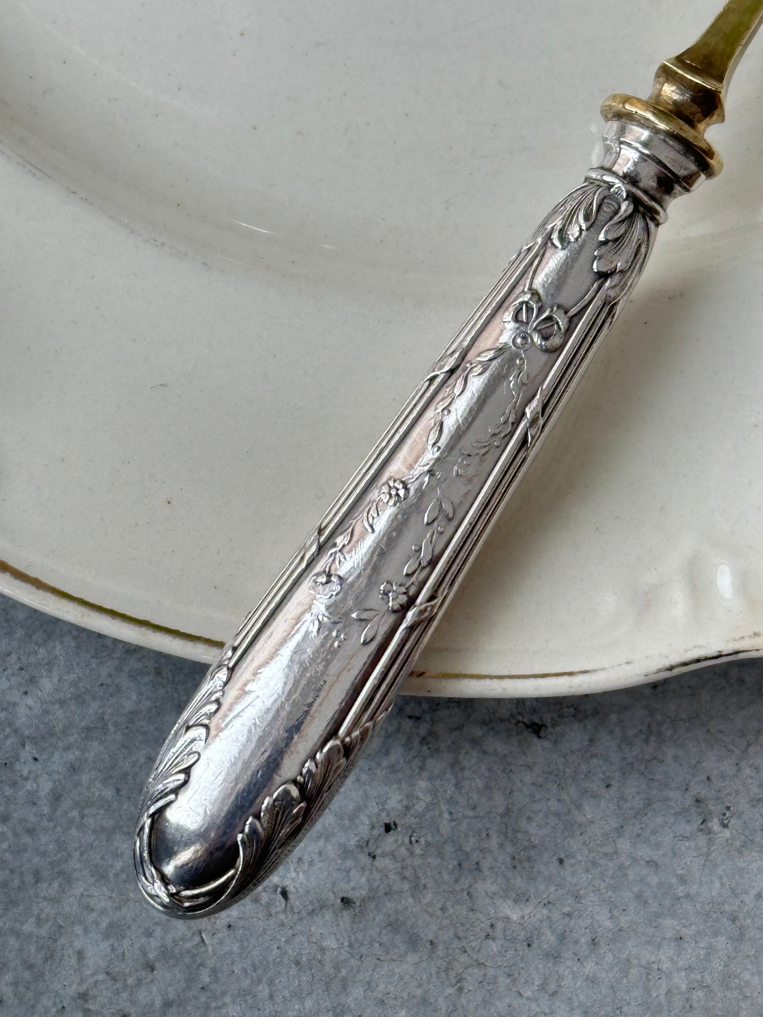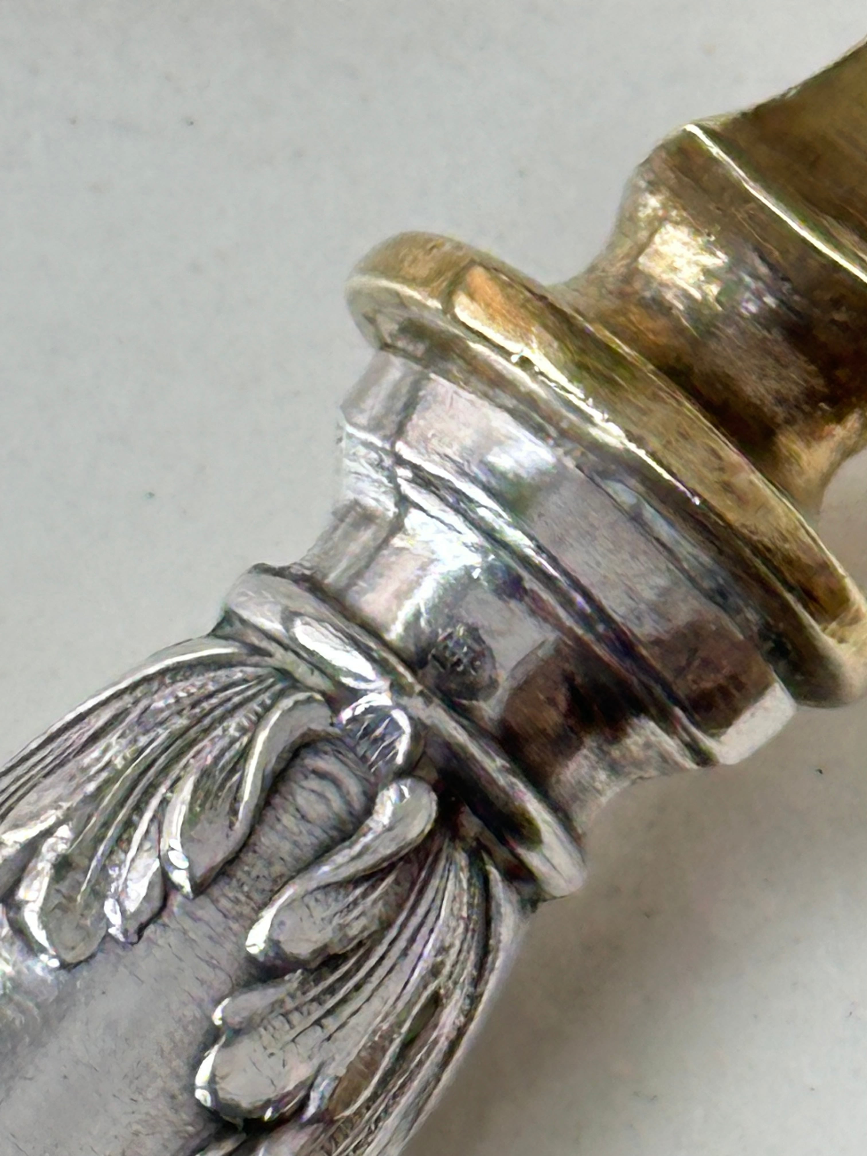 ハンドルの裏には、経年により薄れてはいますがおそらく95%純銀以上のフランスの刻印『ミネルバ1』があり、年代は1838年~1973年のものと思われます。