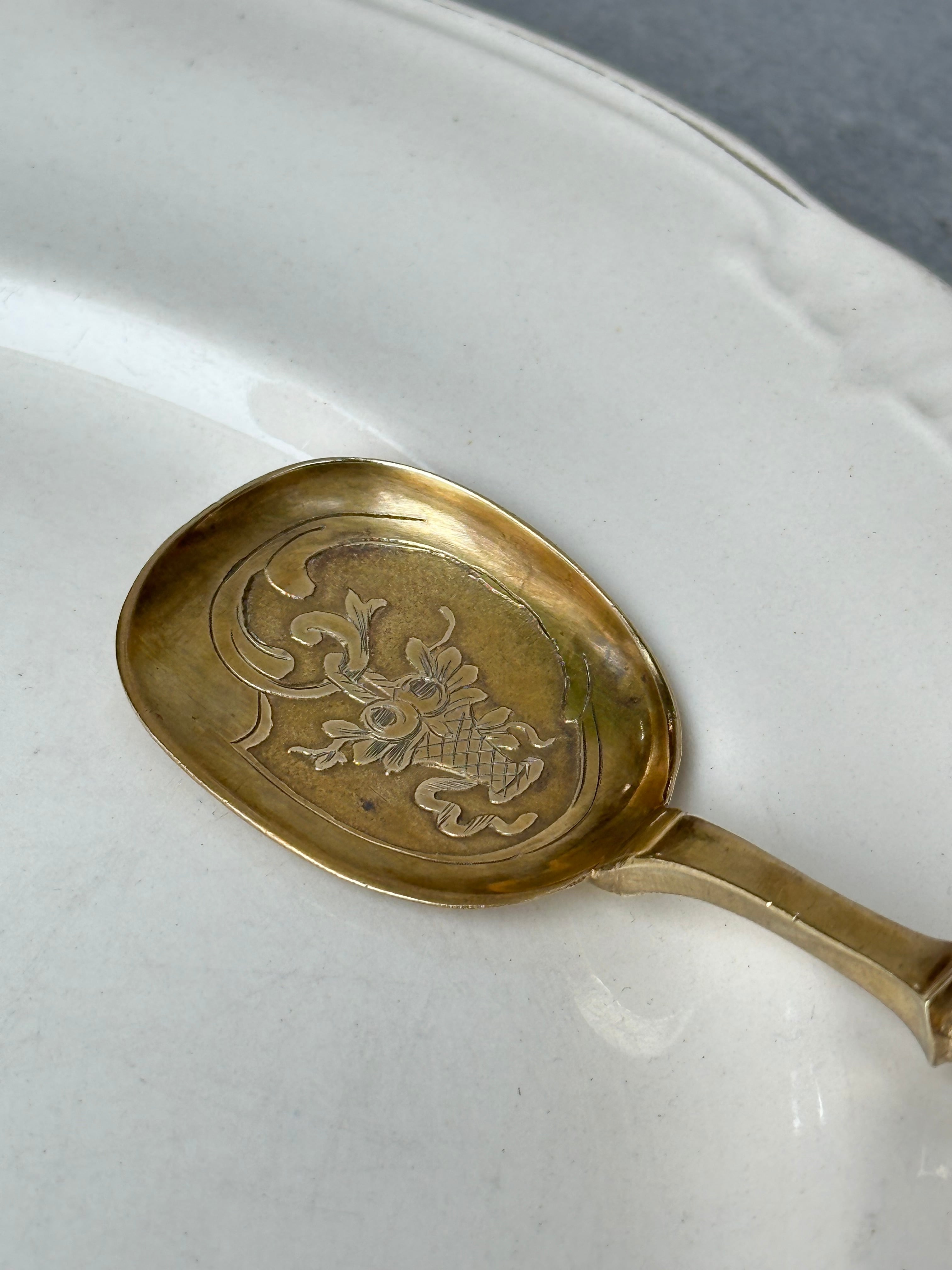デザート用のスプーンであると思いますが、右側の縁に立ち上がりがあるので、シュガースプーンとしてお使いいただくのにも良いのではないでしょうか。