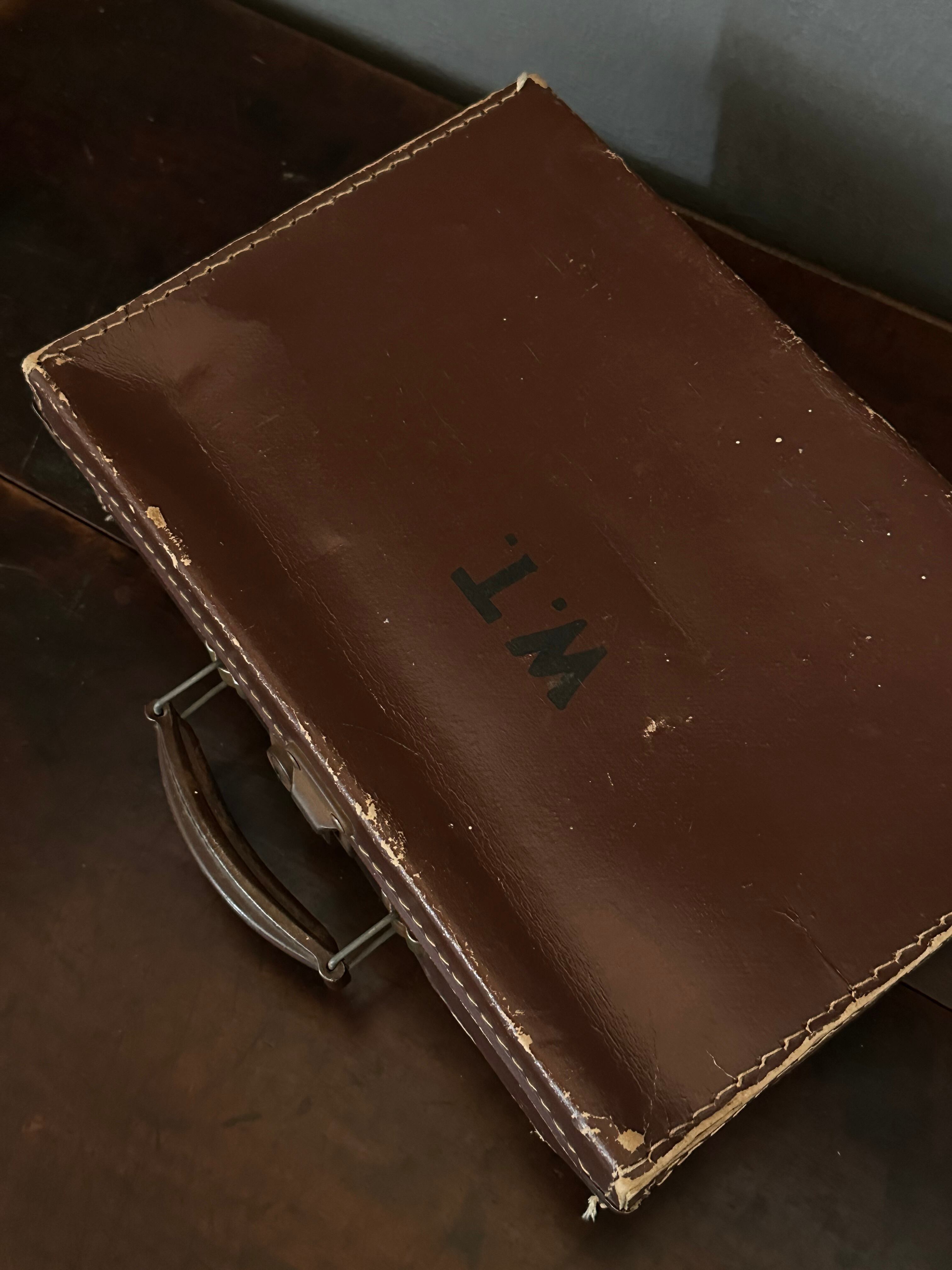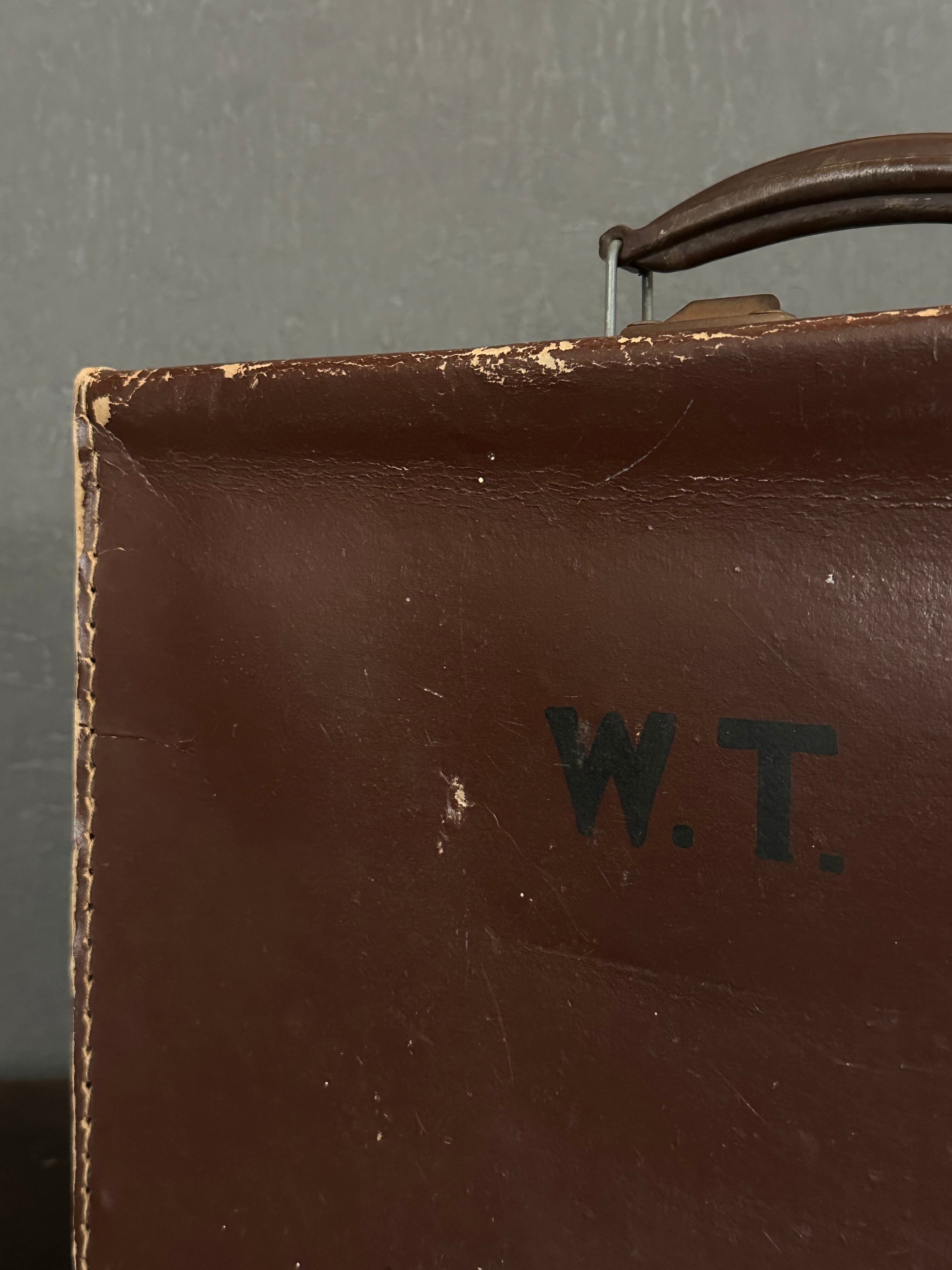 中央には 「W.T.」 のステンシル文字。持ち手は革で仕上げられており、無機質になりがちなケースに、さりげない温もりを添えています。