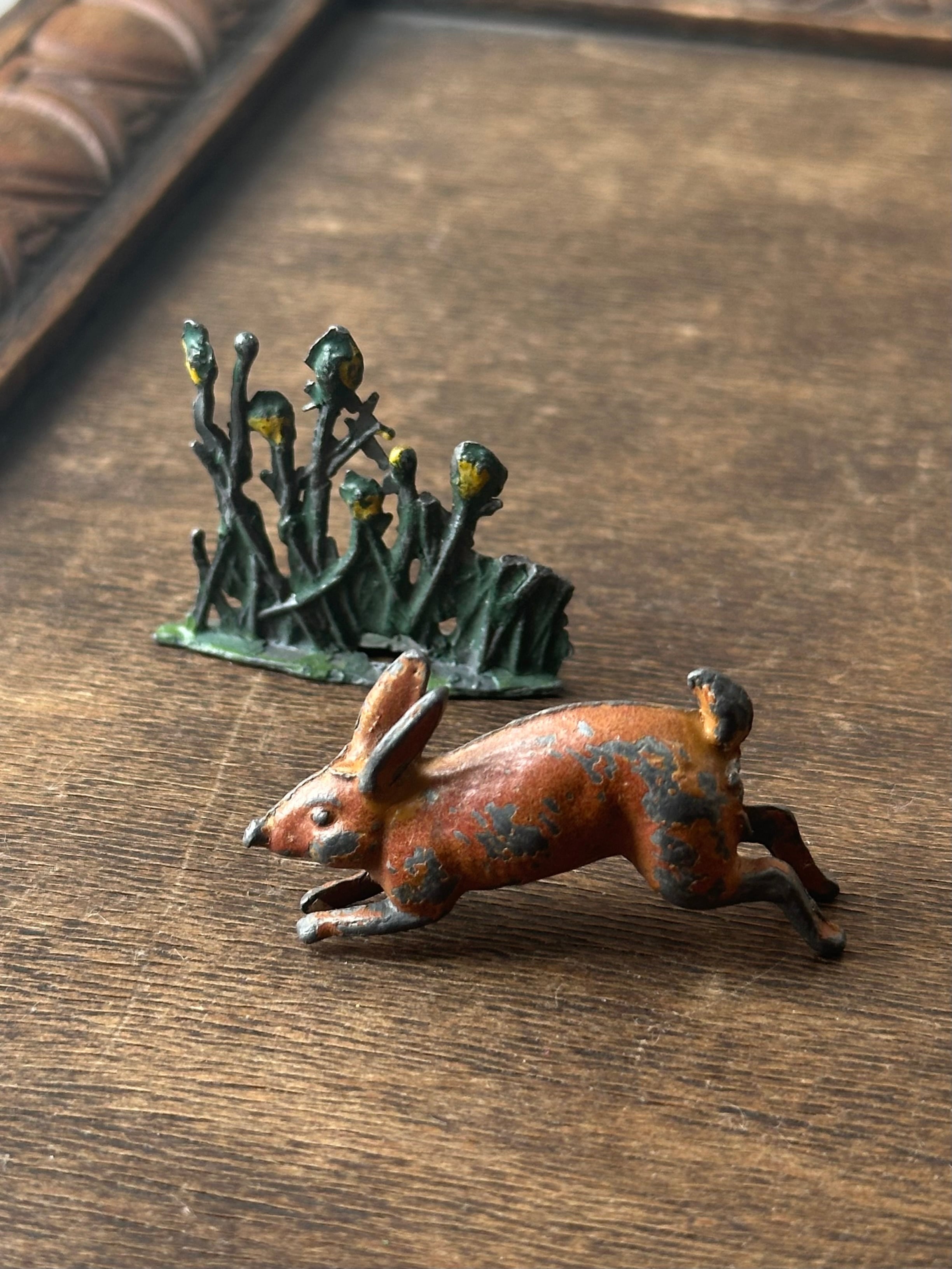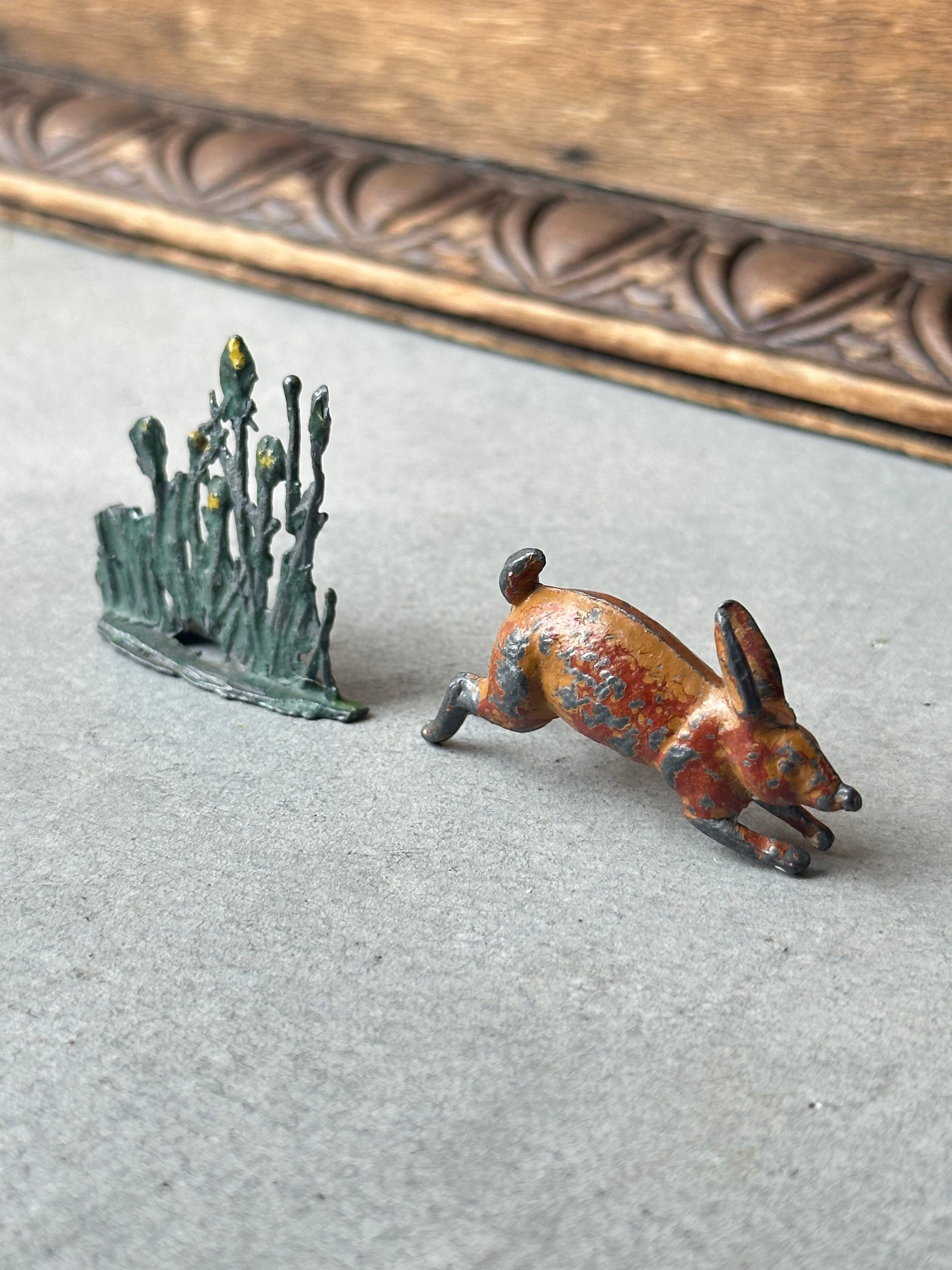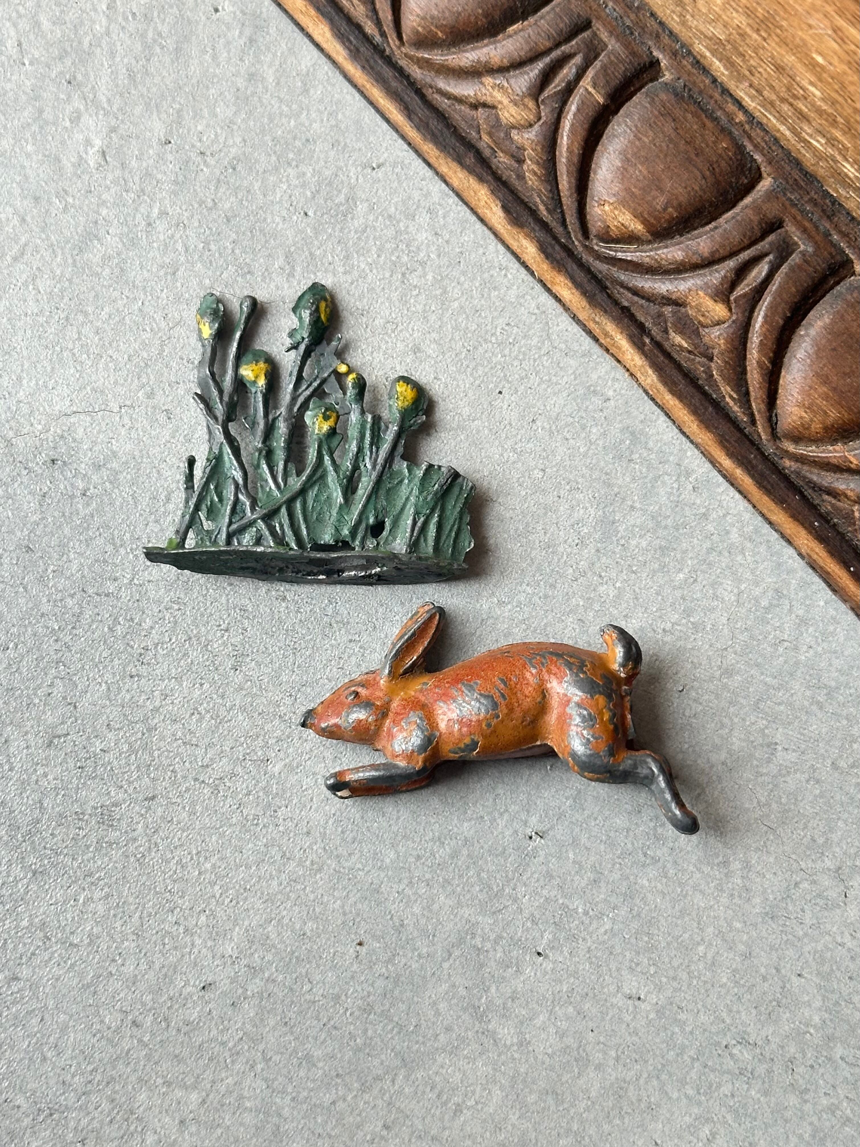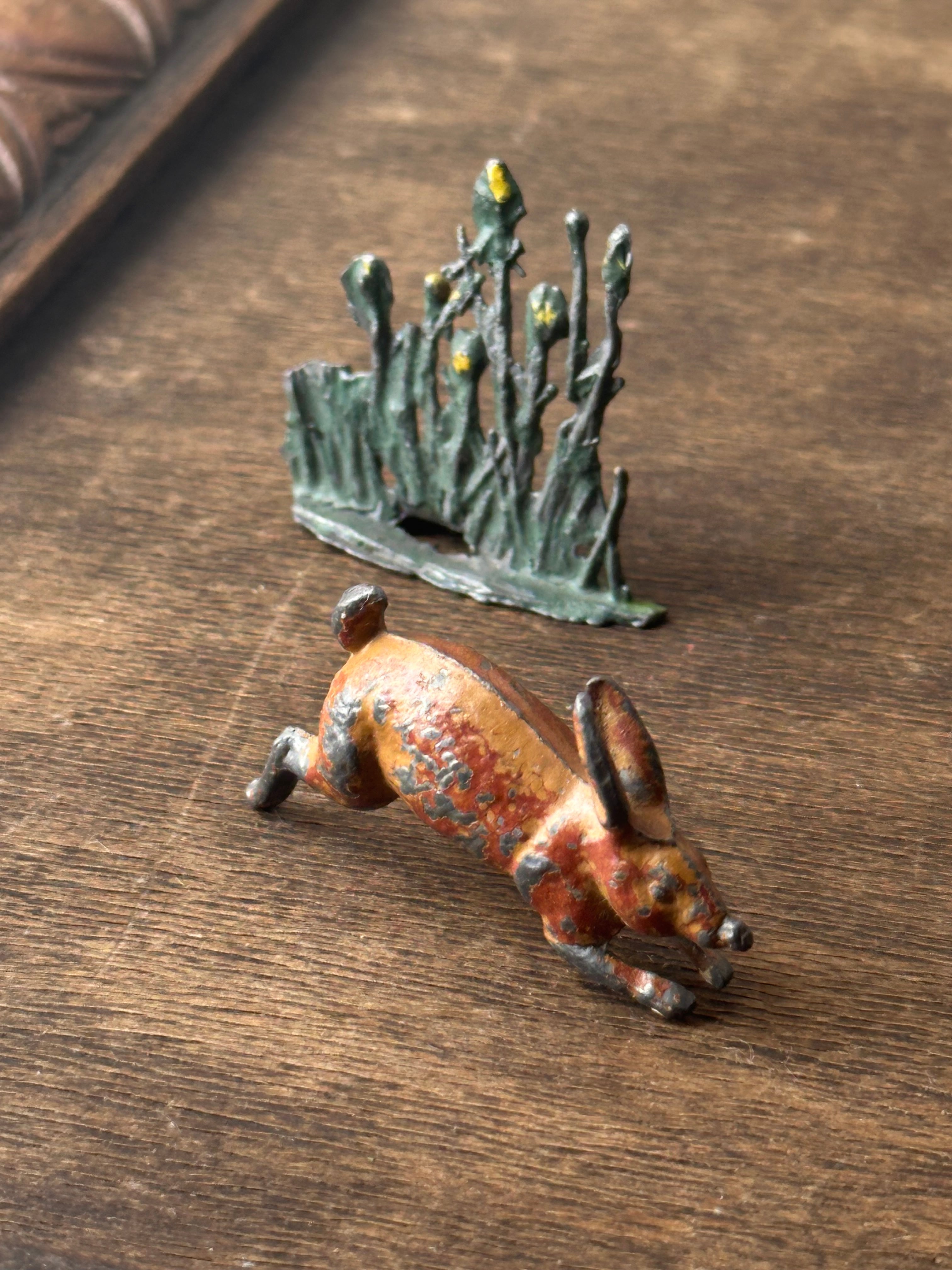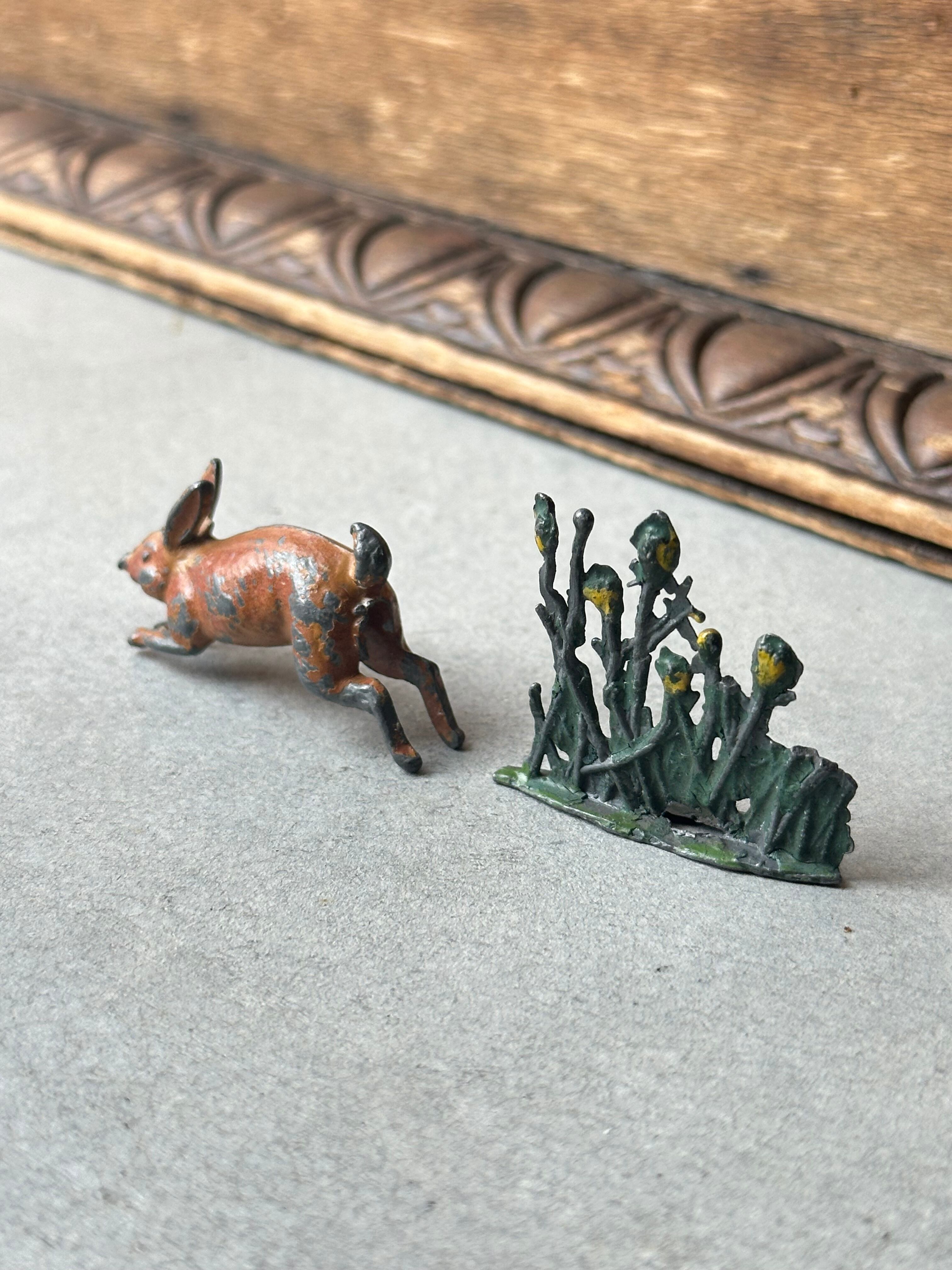 イギリス、ヴィンテージのミニチュア。野を駆けるウサギと草むらのセットです。