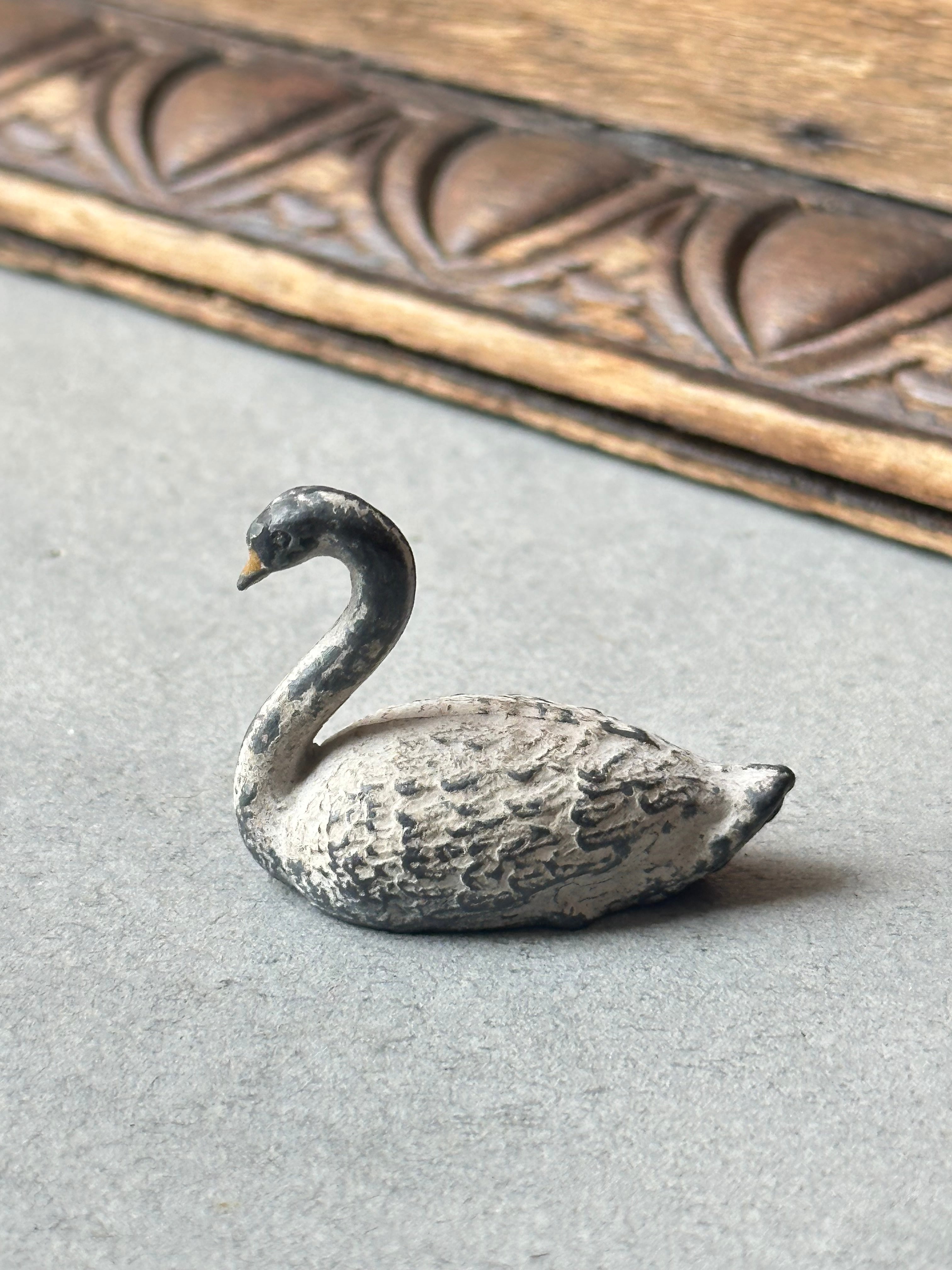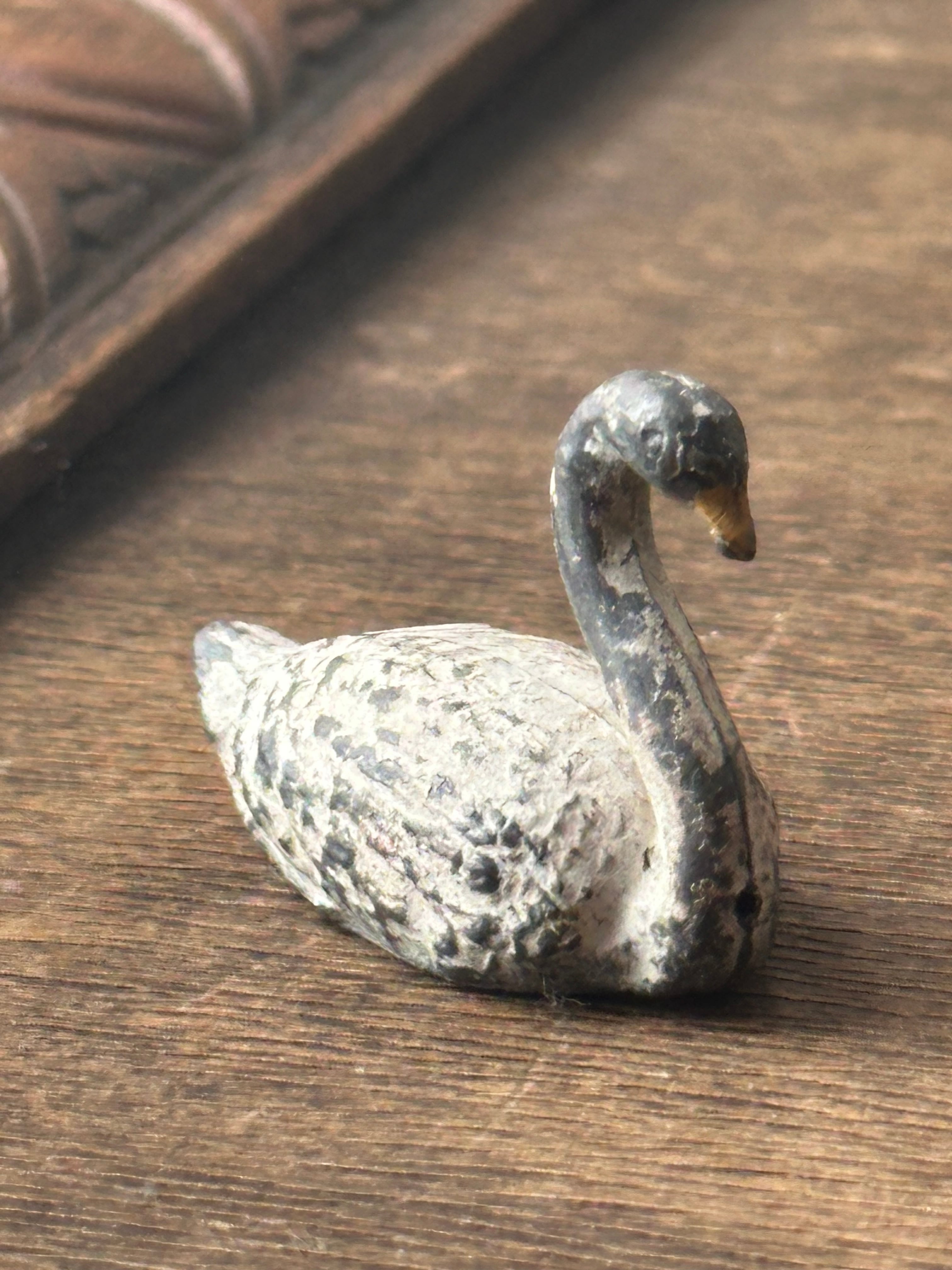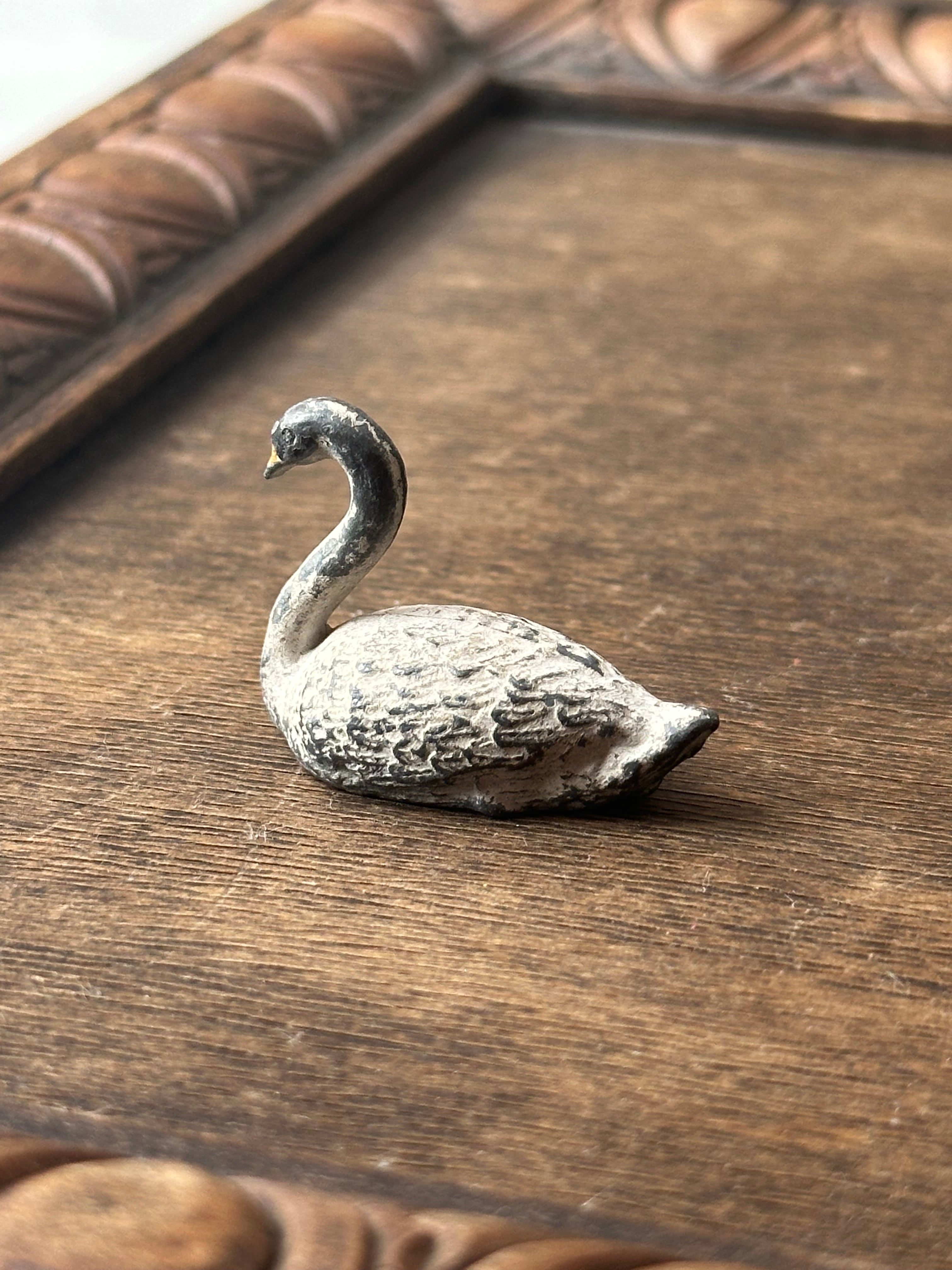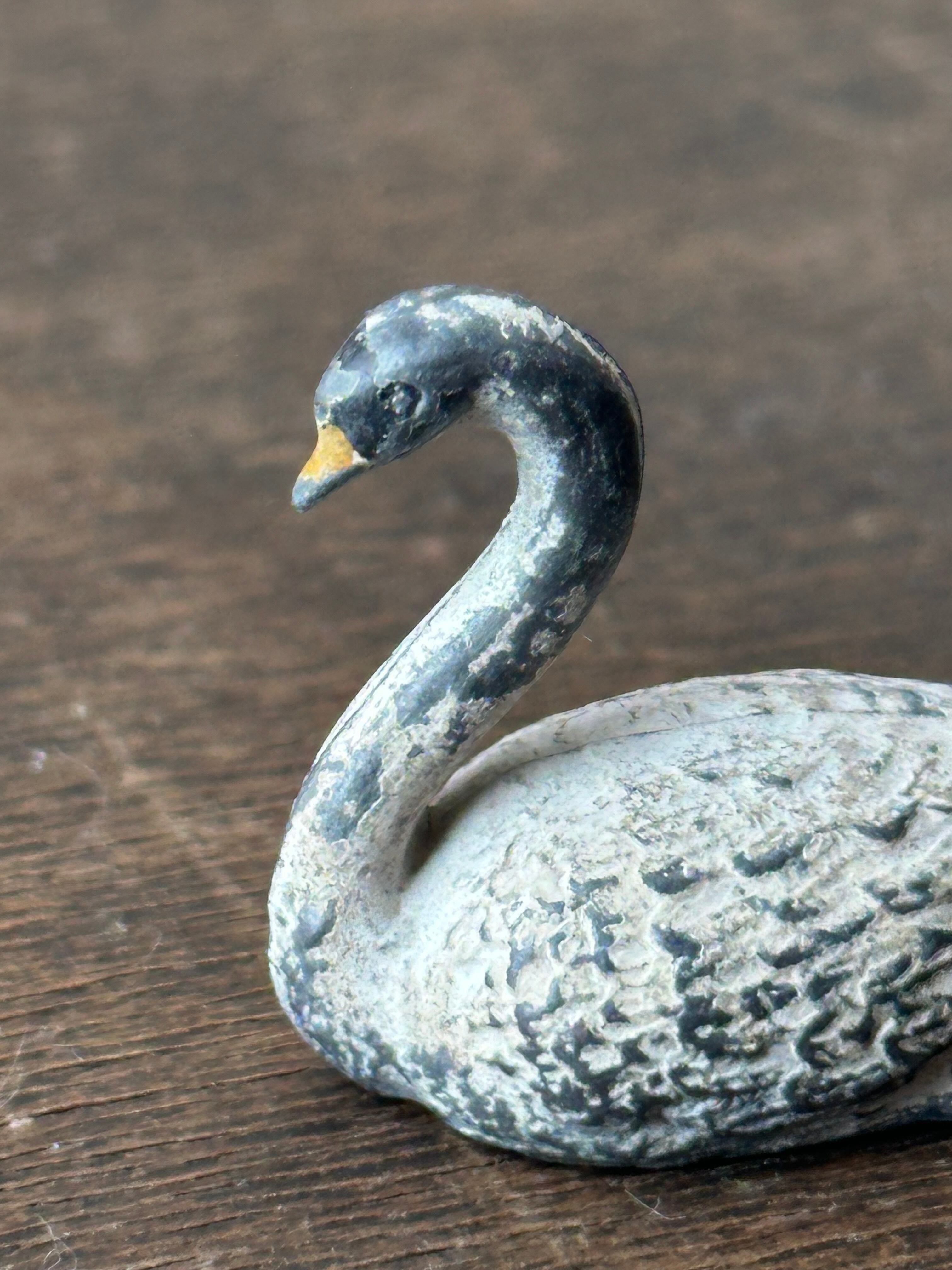 スワンの毛並みが繊細に再現されております。素朴な造形と手彩色の風合い、経年による擦れや色の落ち着きが時を重ねた味わいとして感じられます。