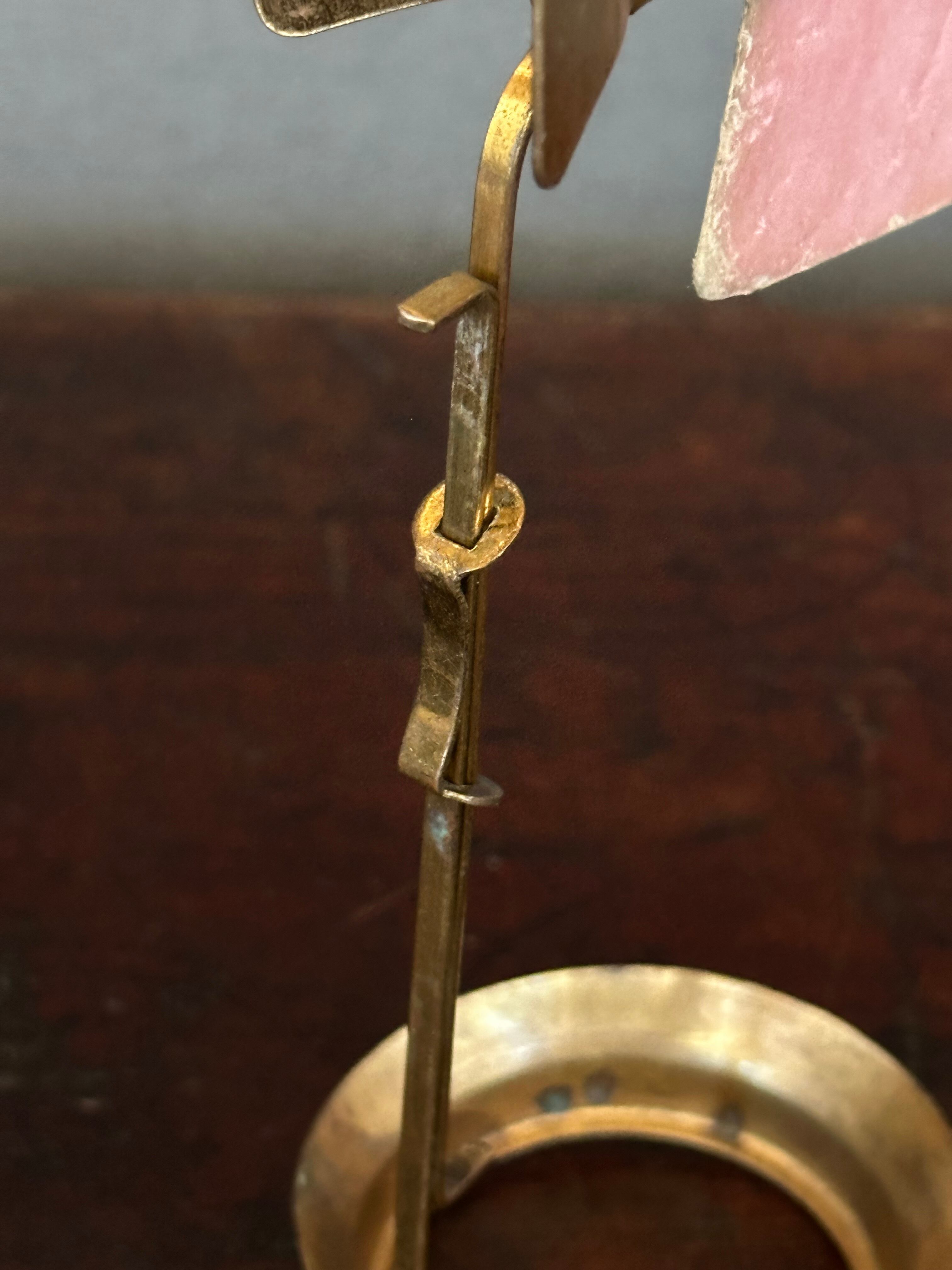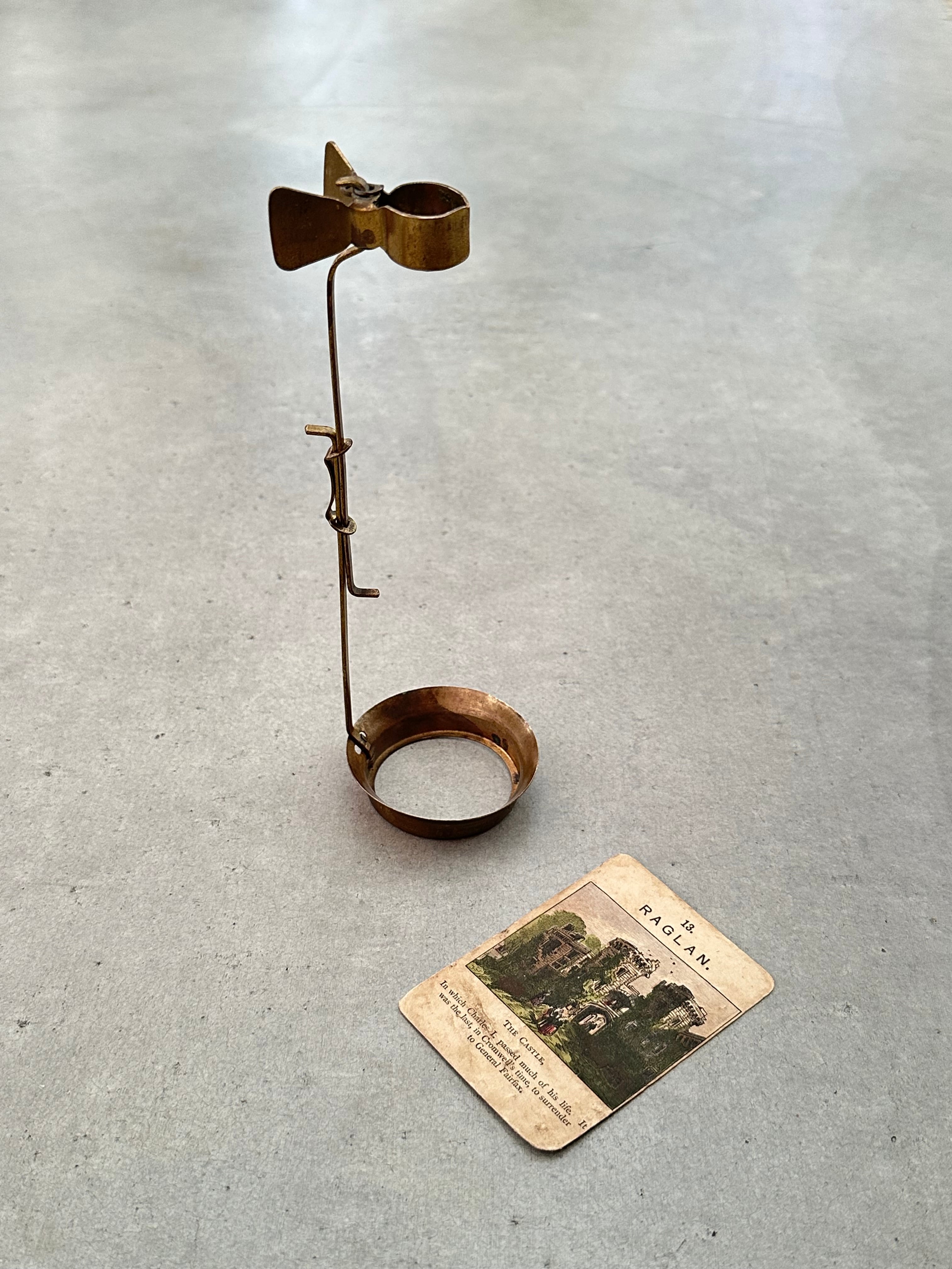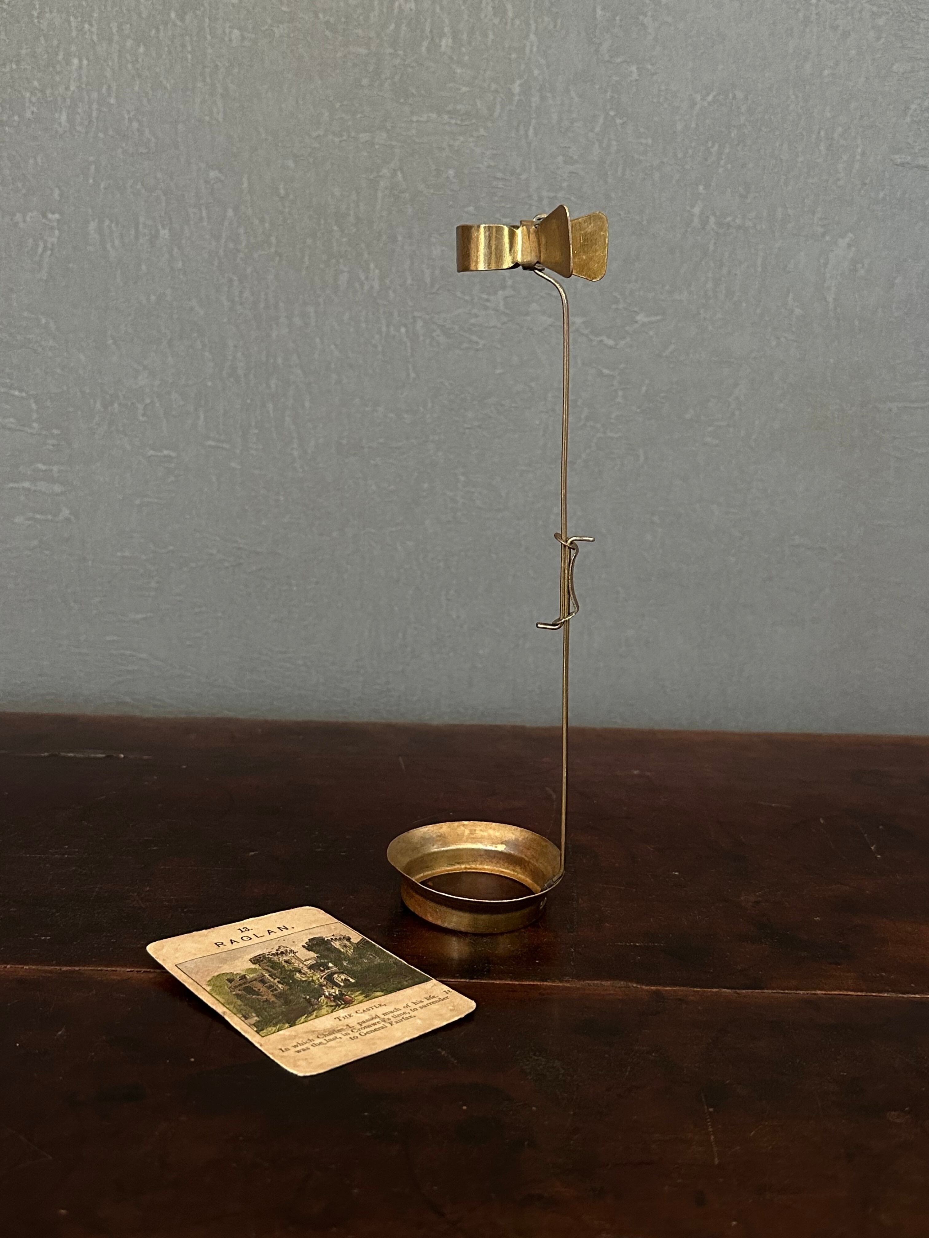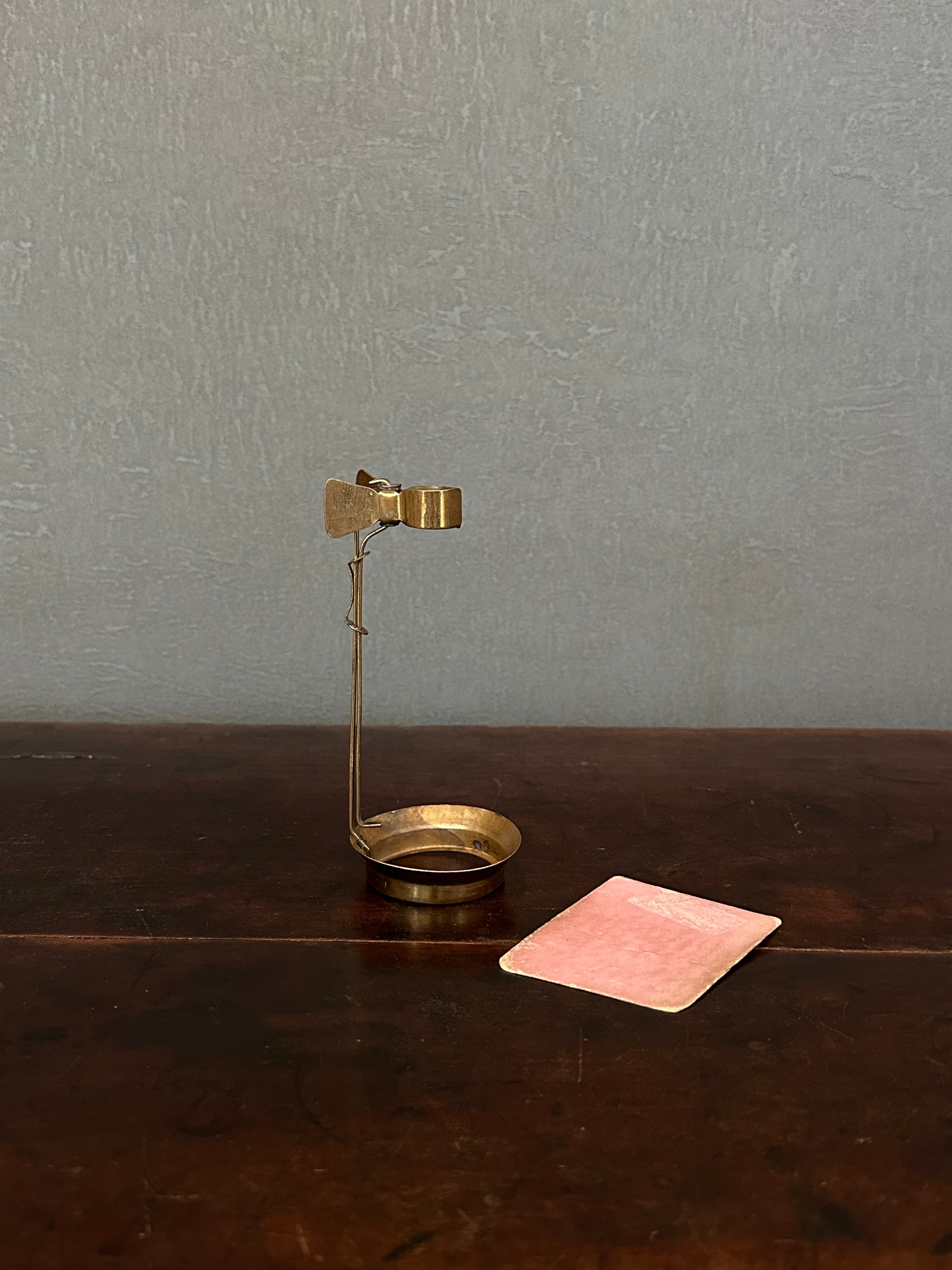真鍮製のスタンドは実験用器具のようでおそらく試験管を挟むためのもの。軸が上下に伸縮します。