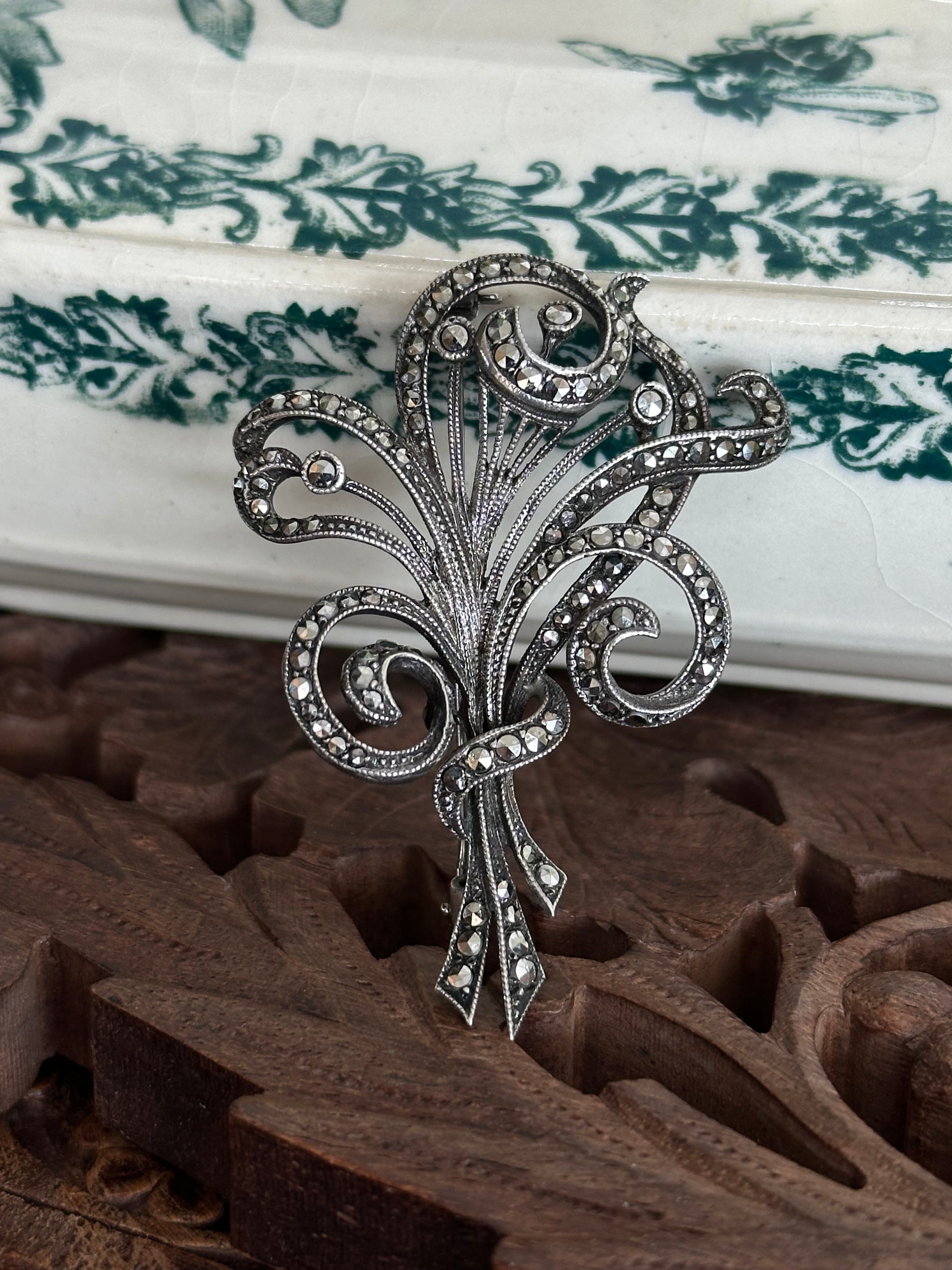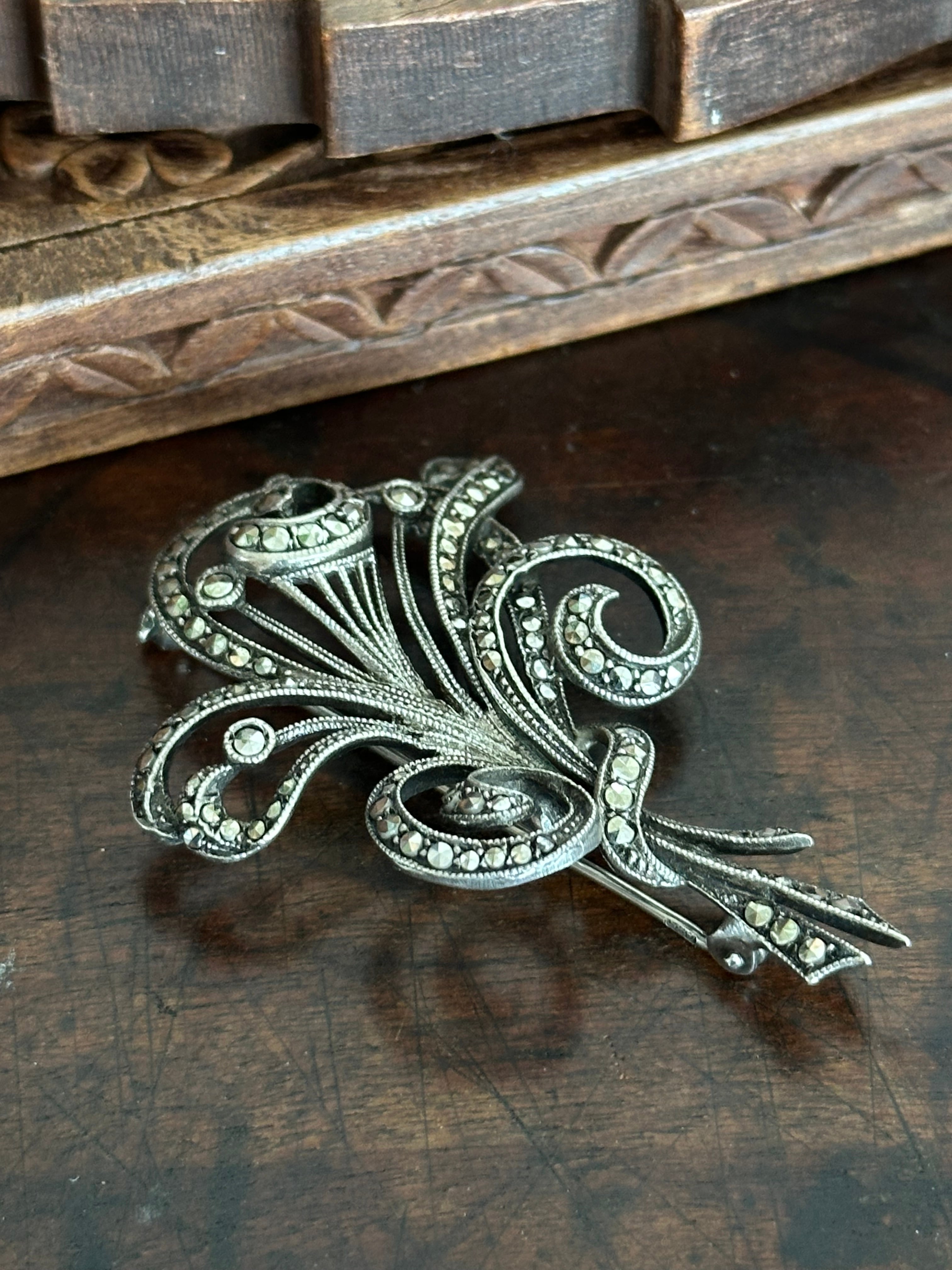 フランス蚤の市 ヴィンテージ 835シルバー マーカサイト ブローチ 植物モチーフ