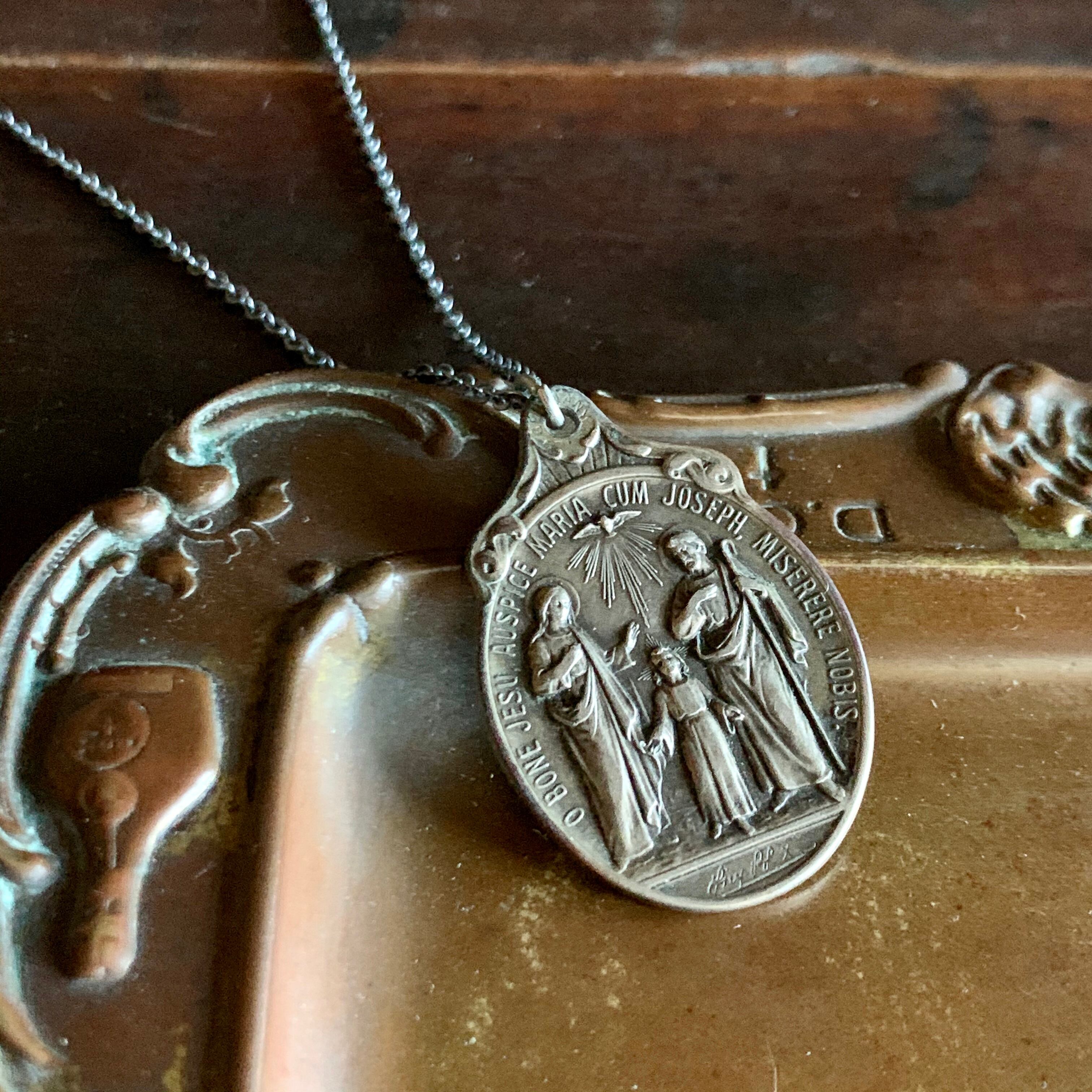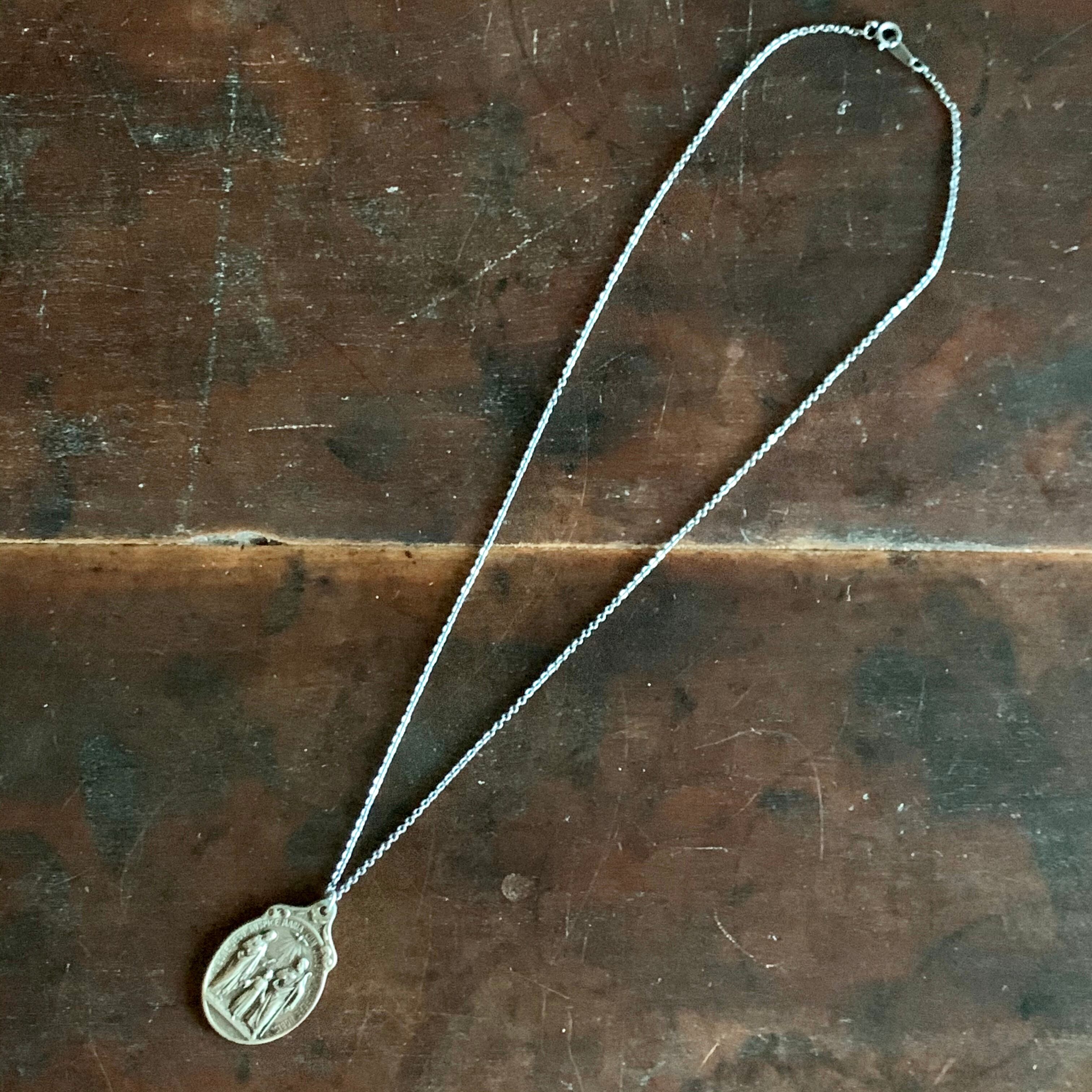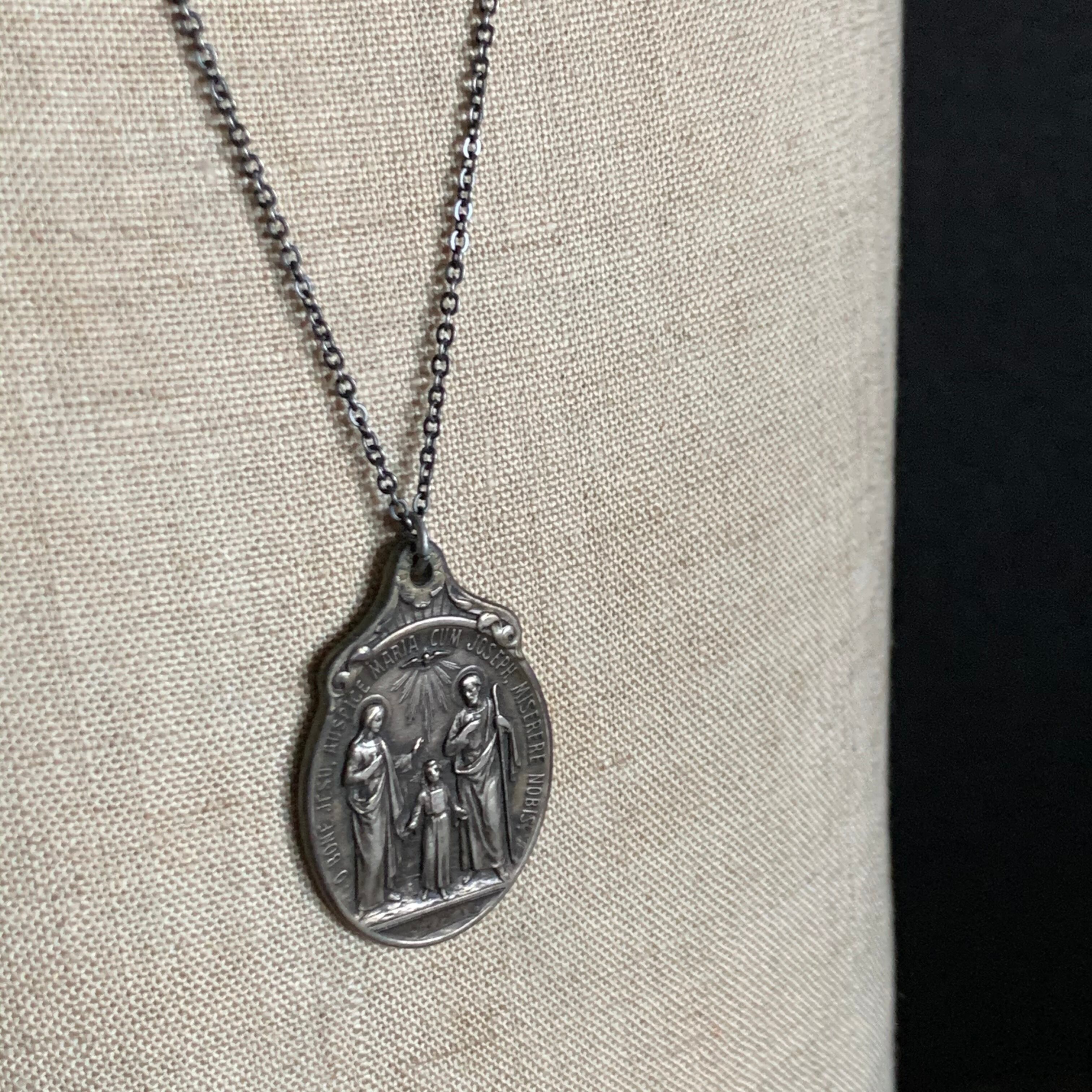 聖母マリアと聖ヨセフ、そして幼子イエスの家族の姿と、頭上に精霊の鳩が刻まれたメダイのネックレスです。