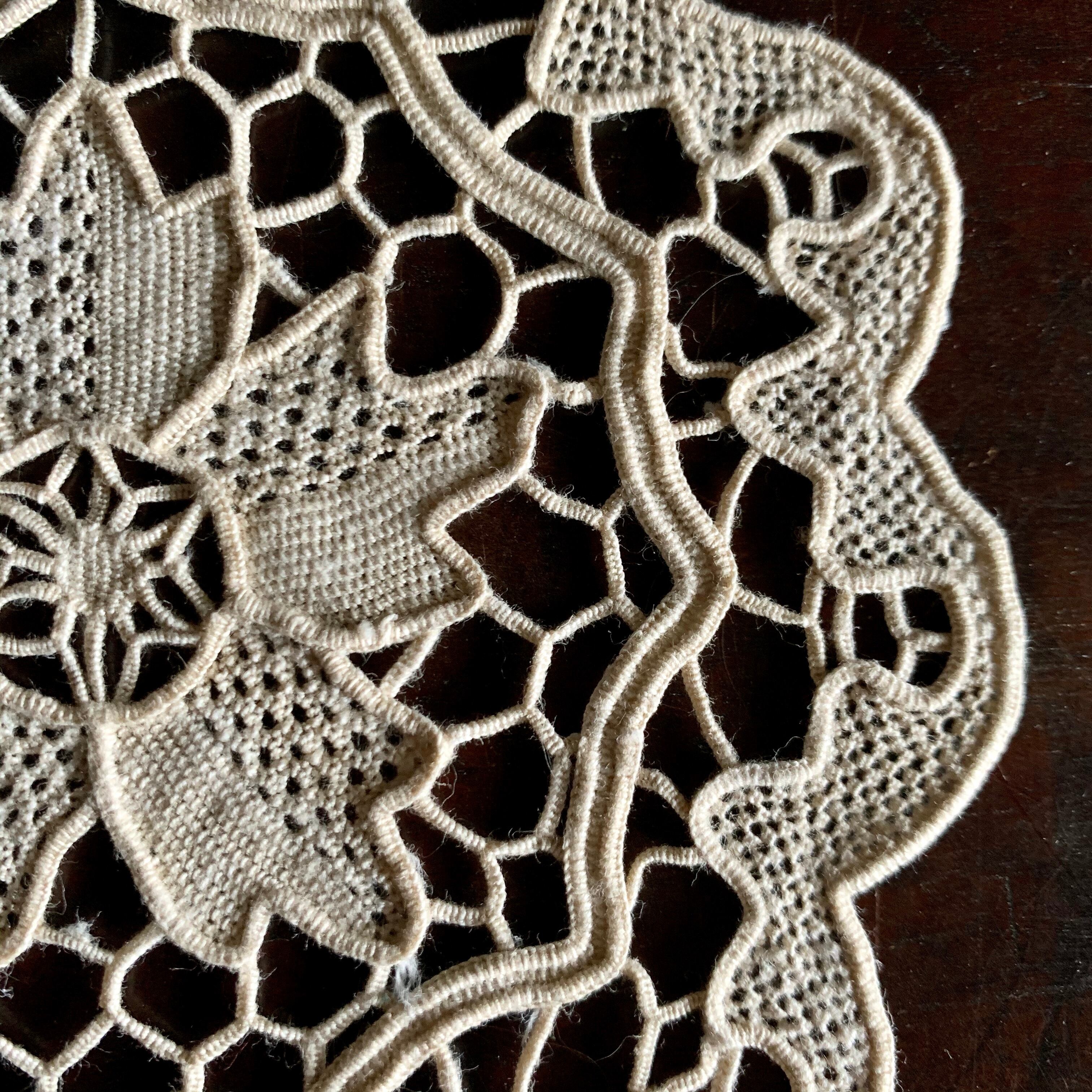 ベージュのコットンの細い糸で丁寧に手編みされた小さなニードルレース。