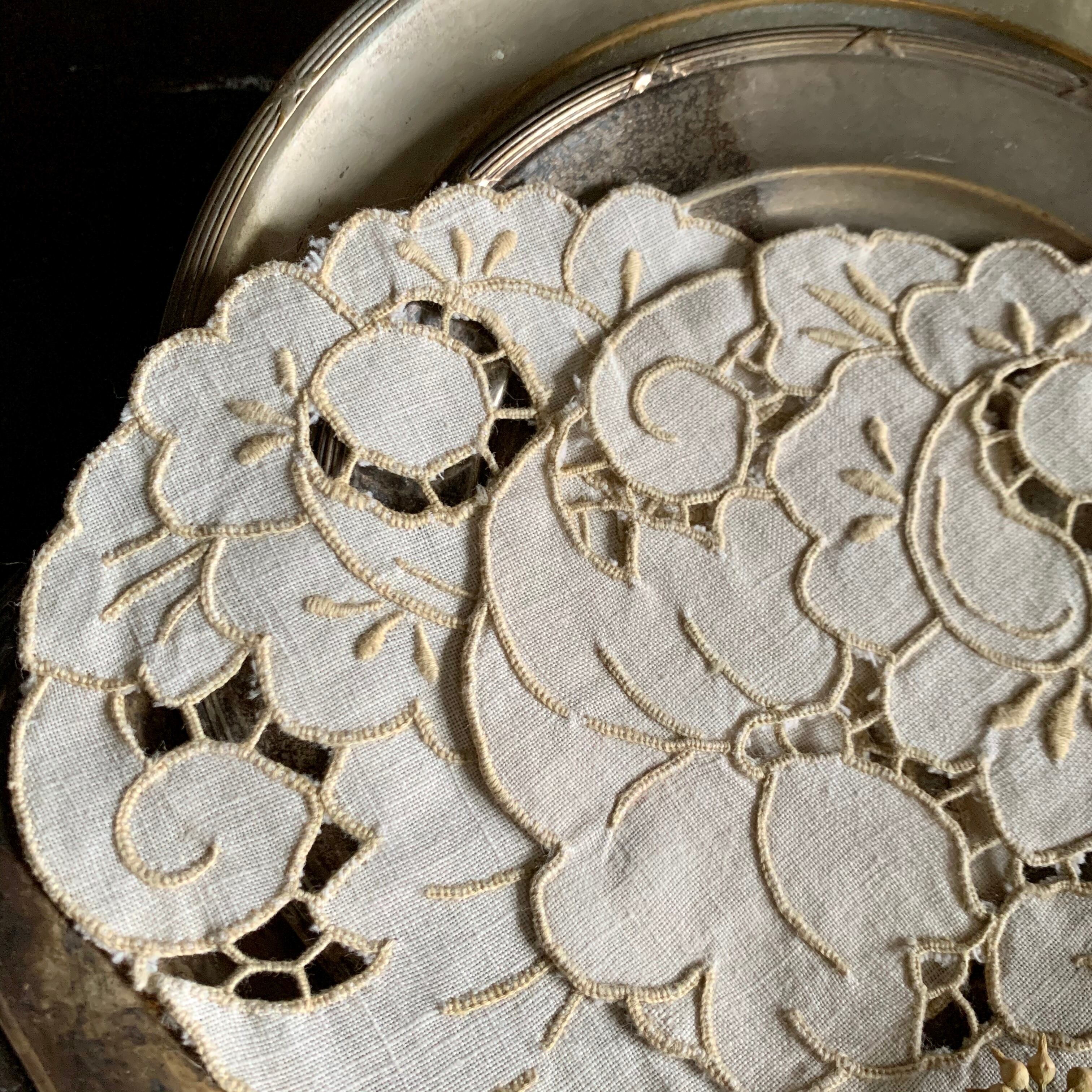 薄いベージュのリネン生地に少し濃い目のベージュの糸で丁寧に手刺繍が施され、生地と糸との濃淡と刺繍の凹凸感が美しくナチュラルな印象のドイリーレースです。