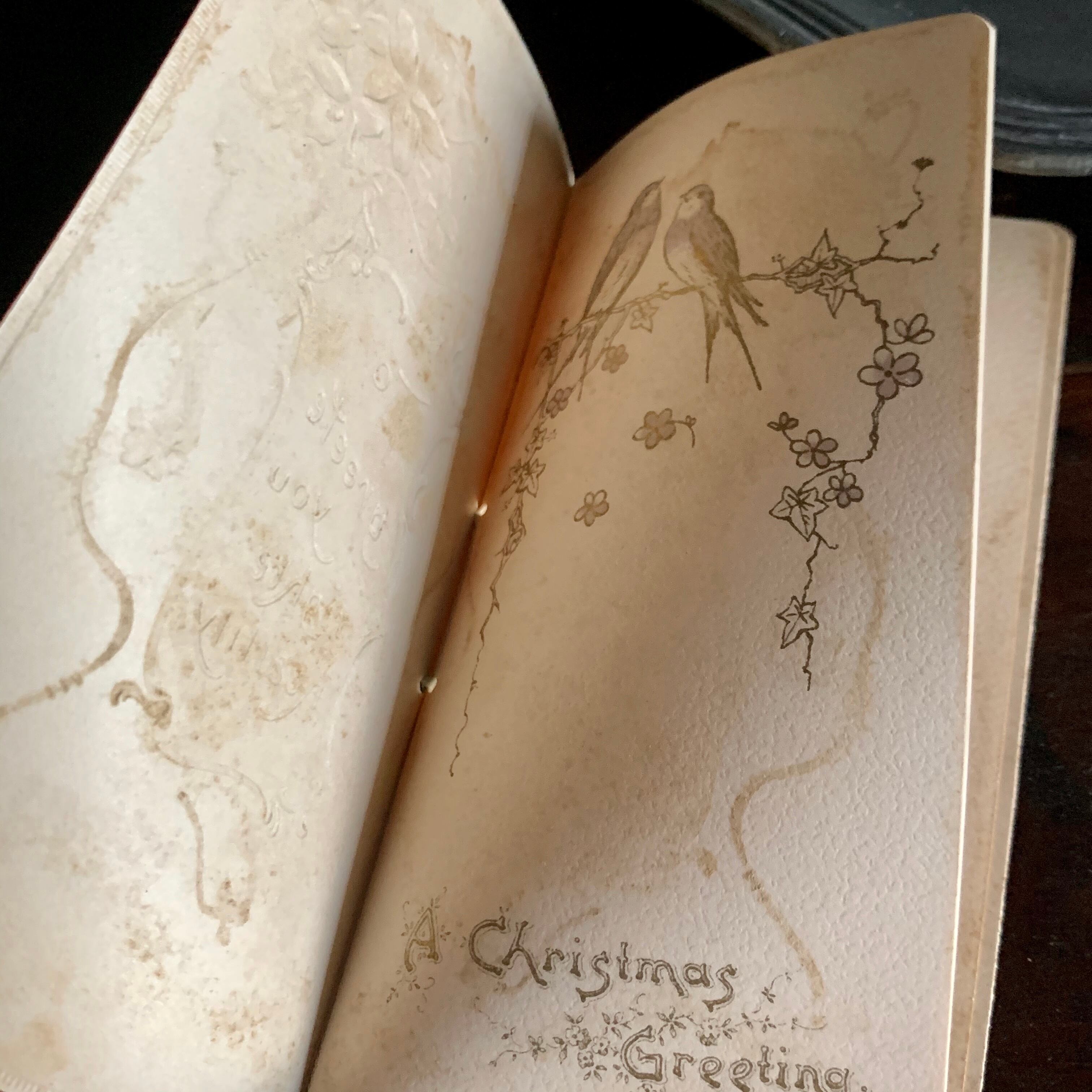 ブルーグレーに白いお花模様のグリーティングカードは冊子になっており、2羽の鳥が仲良く並んだ絵柄のページとメッセージのページがあり、