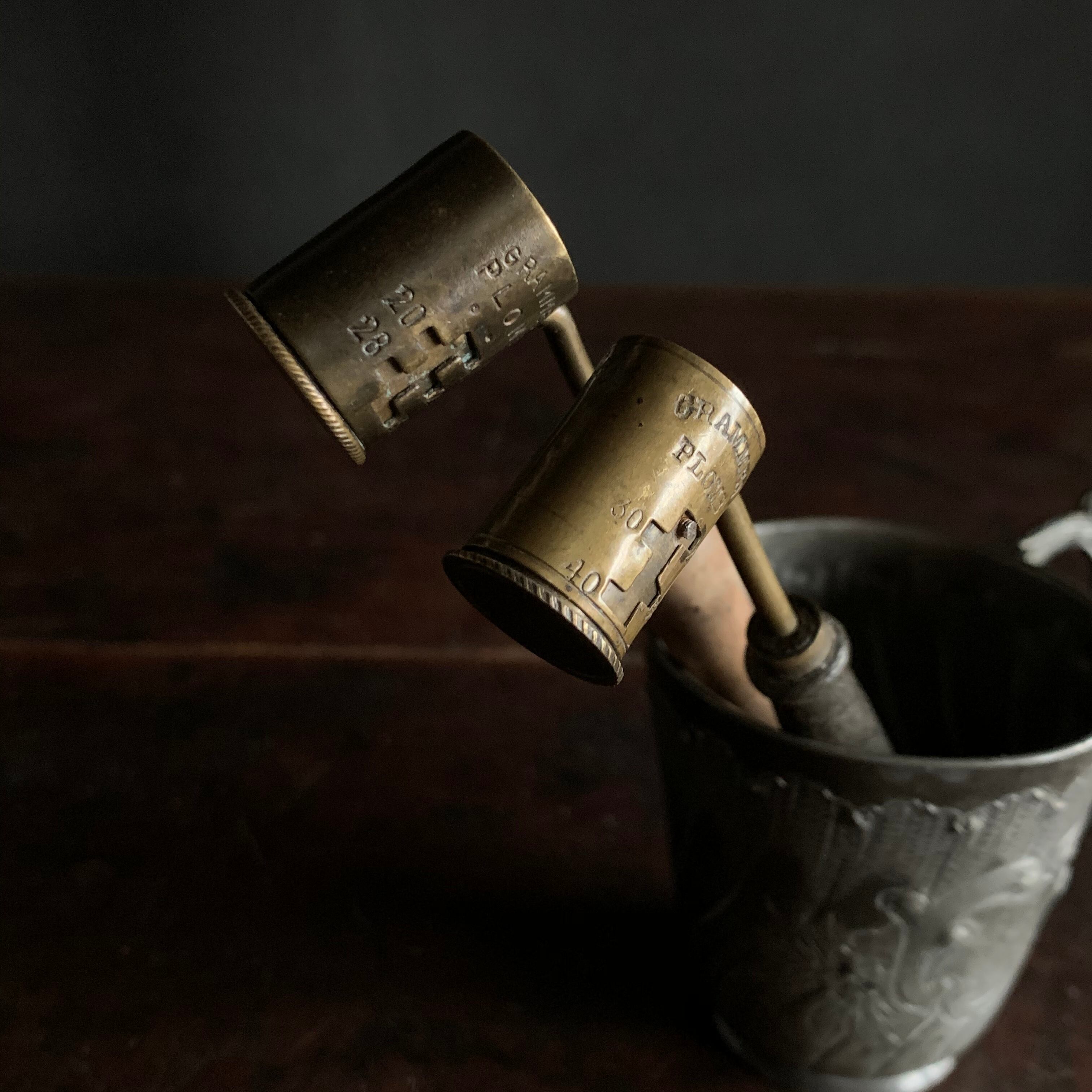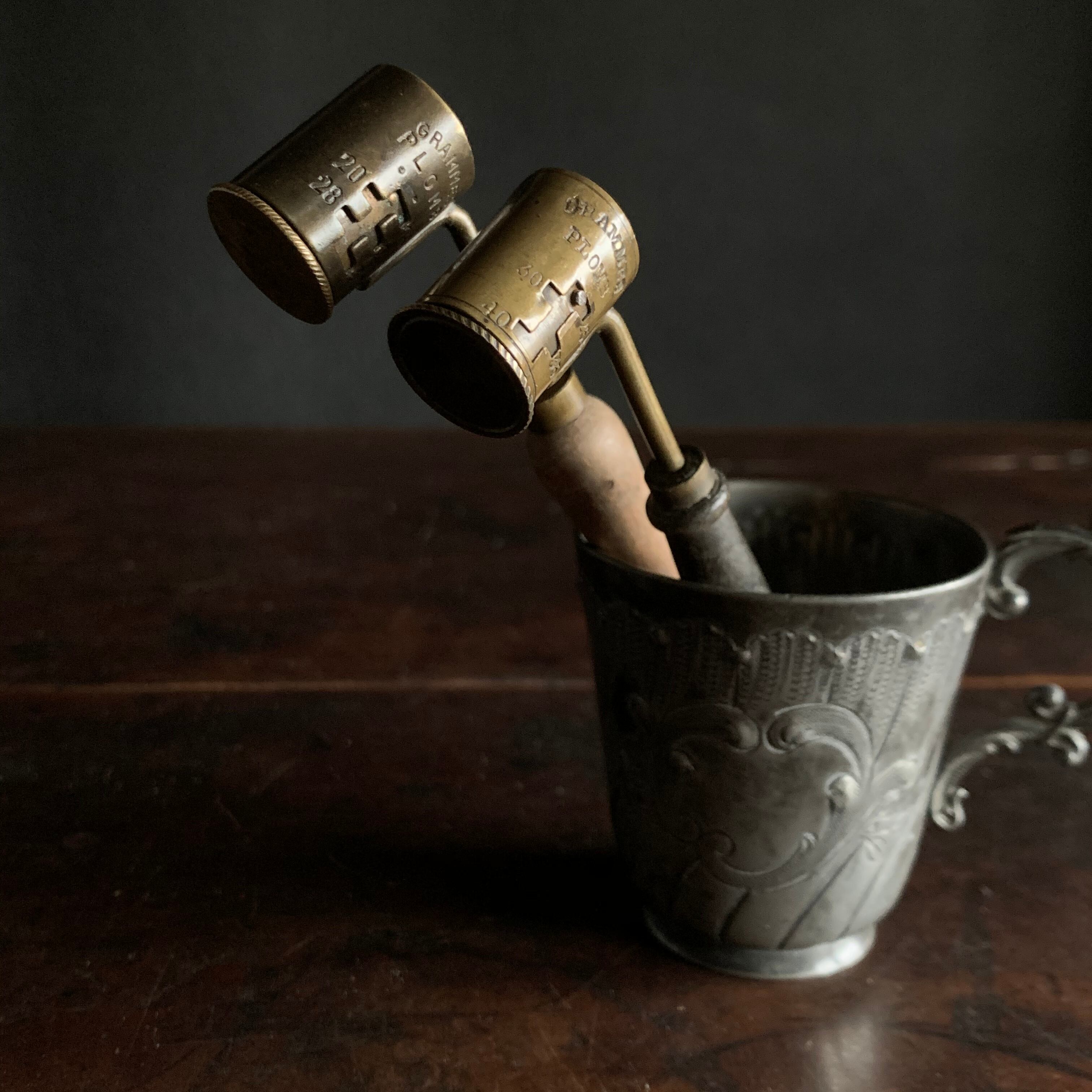 鉄砲に詰める火薬を計る古い計量器です。