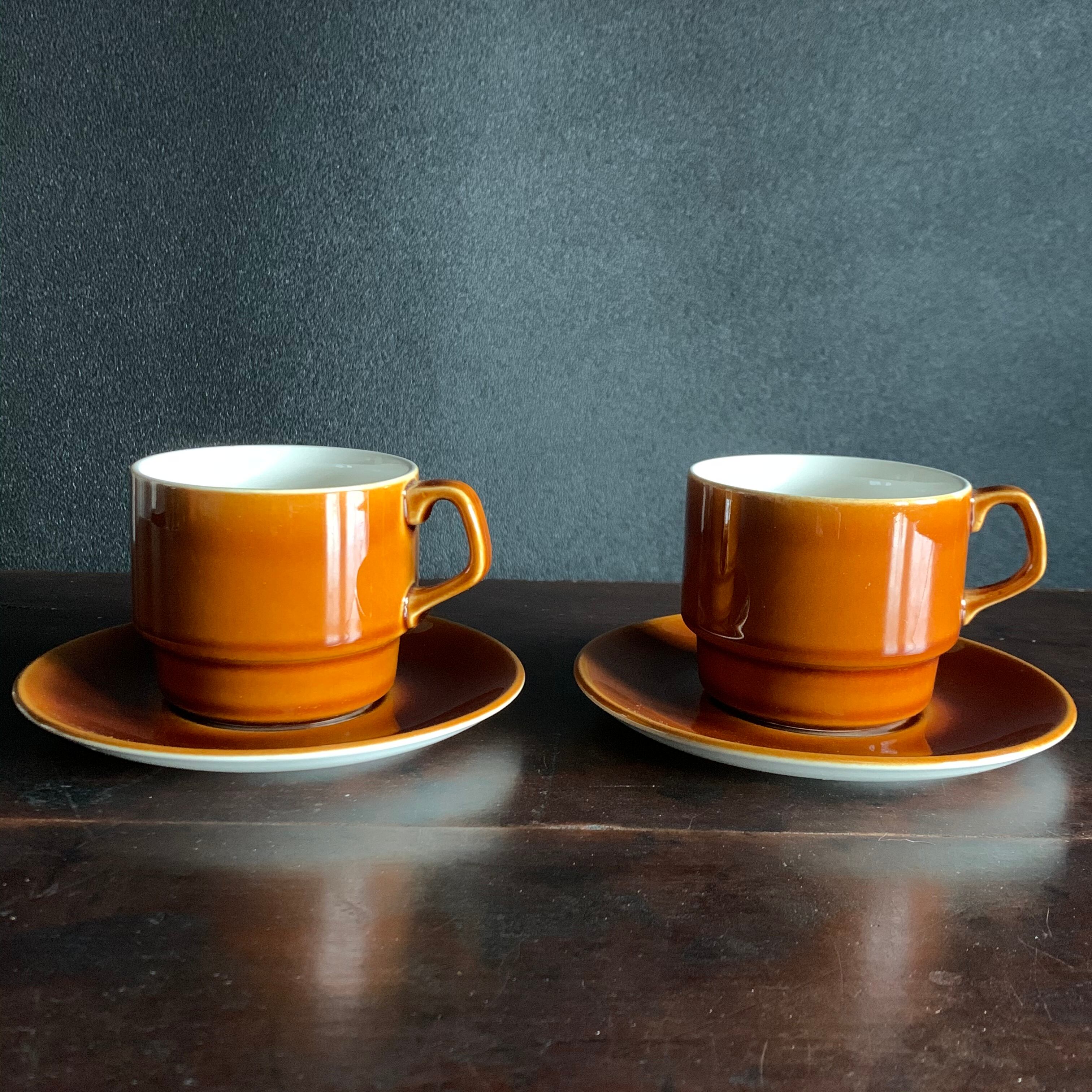 優しい飴色とカップ内の乳白色の色合いがとても美しく、カップ内側は乳白色なので、紅茶やコーヒーの色がきれいに見えますね。