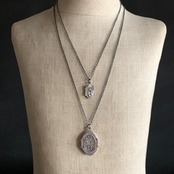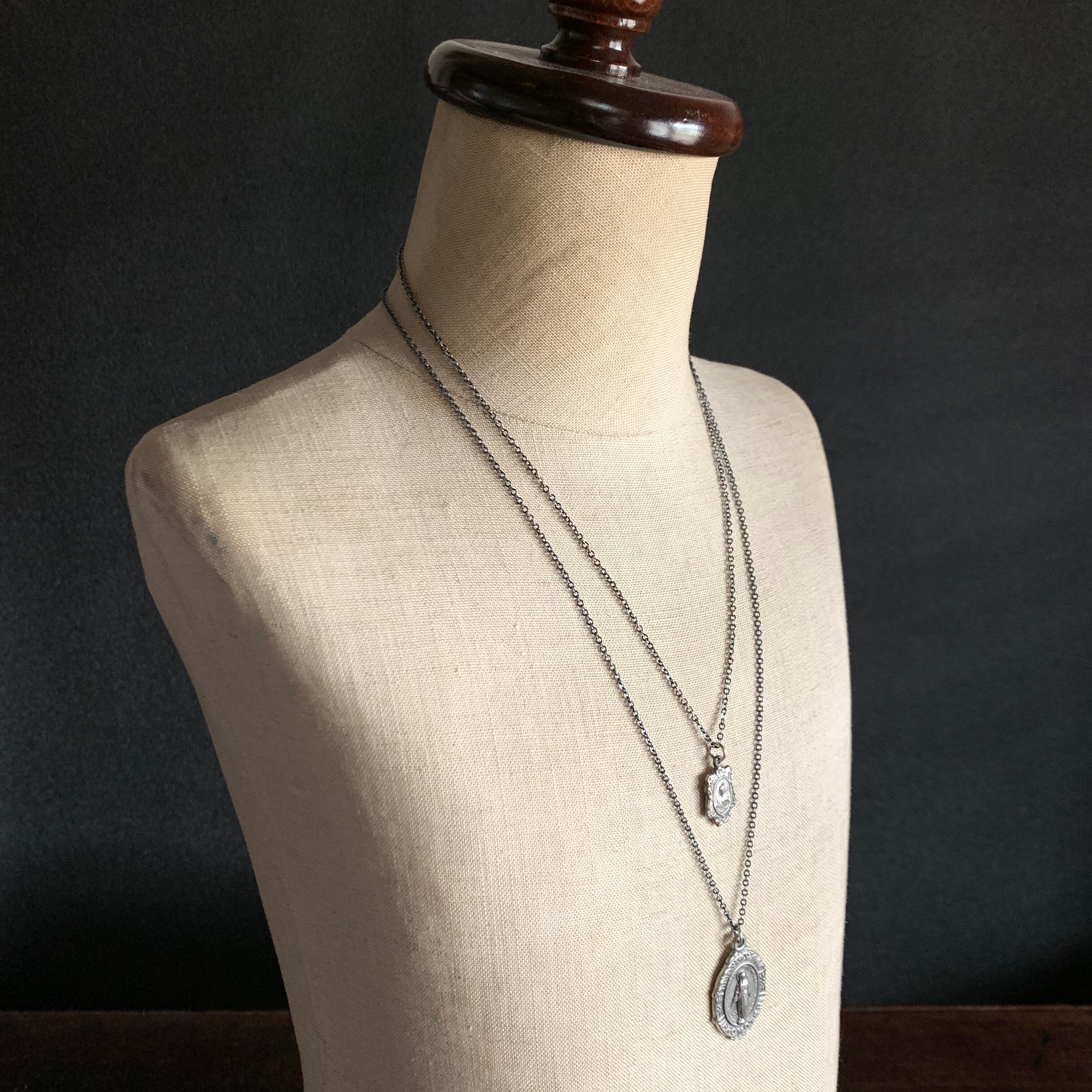 もう1つは、イエスと聖母子の小さなメダイをネックレスに。メダイの表面にはイエスの聖心と呼ばれるモチーフ、裏面にはの聖母マリアと幼いイエスキリストの聖母子像が描かれています。こちらも凹凸のある彫りが施されており、小さくても精巧なメダイです。