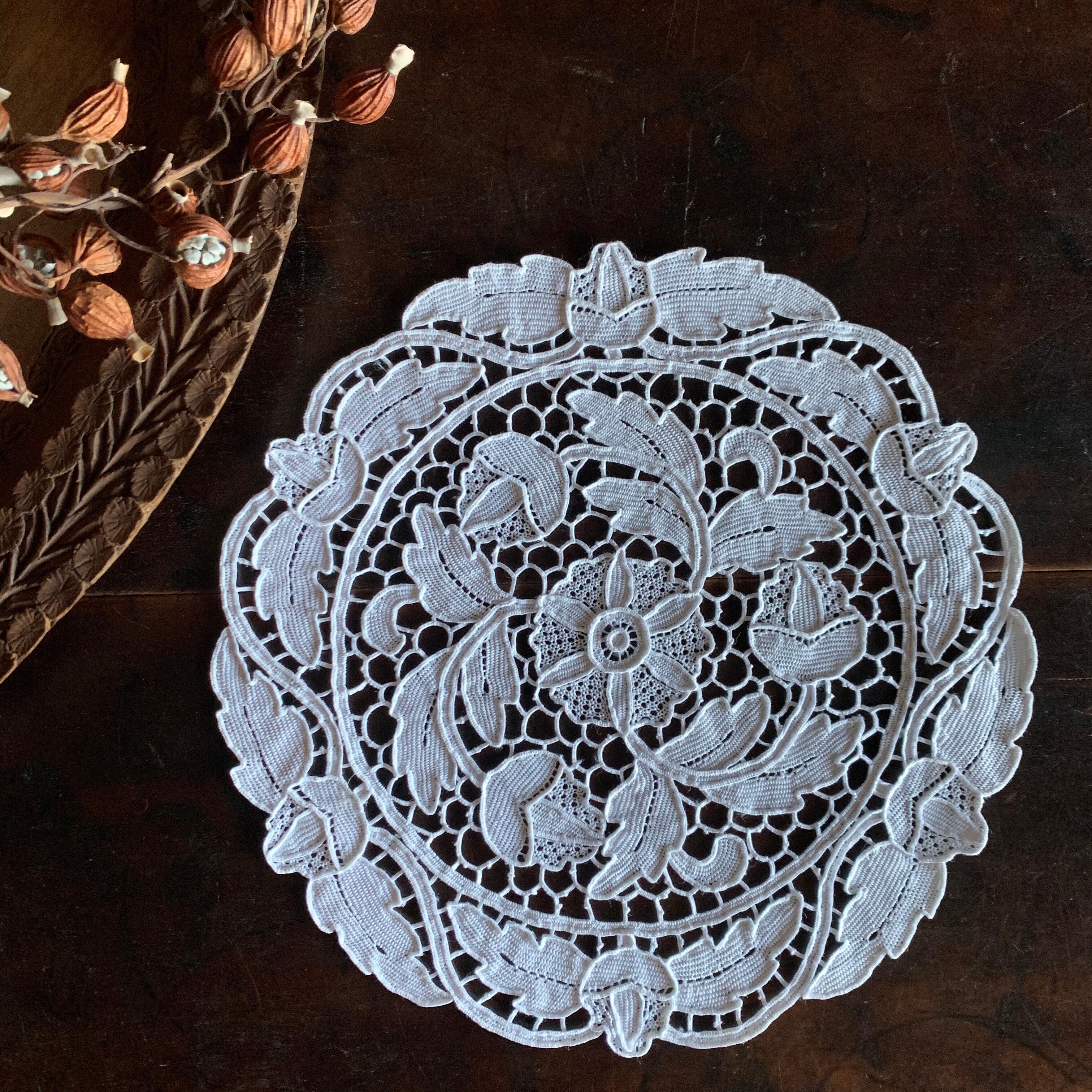 一目一目の網目がとても綺麗で、花や葉のモチーフの縁取りに凹凸があり立体感が感じられます。光にかざすとモチーフが浮かび上がるような素敵なレースですね。
