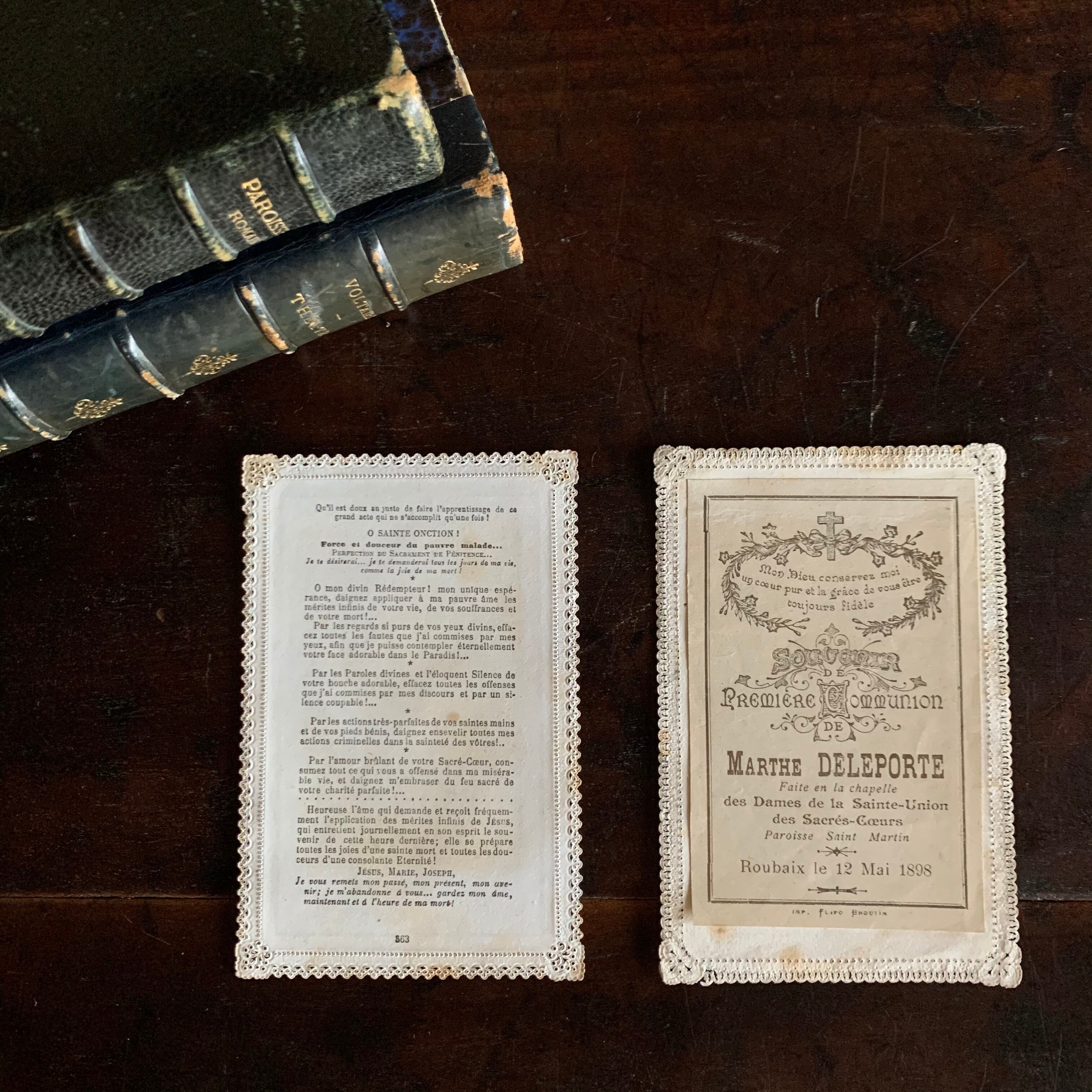 こちらはカニヴェ (canivet) と言われるレース状の透かし模様が入ったカードで、縁取りに緻密な透かしが施され、モノトーンの繊細なイラストが美しく描かれております。