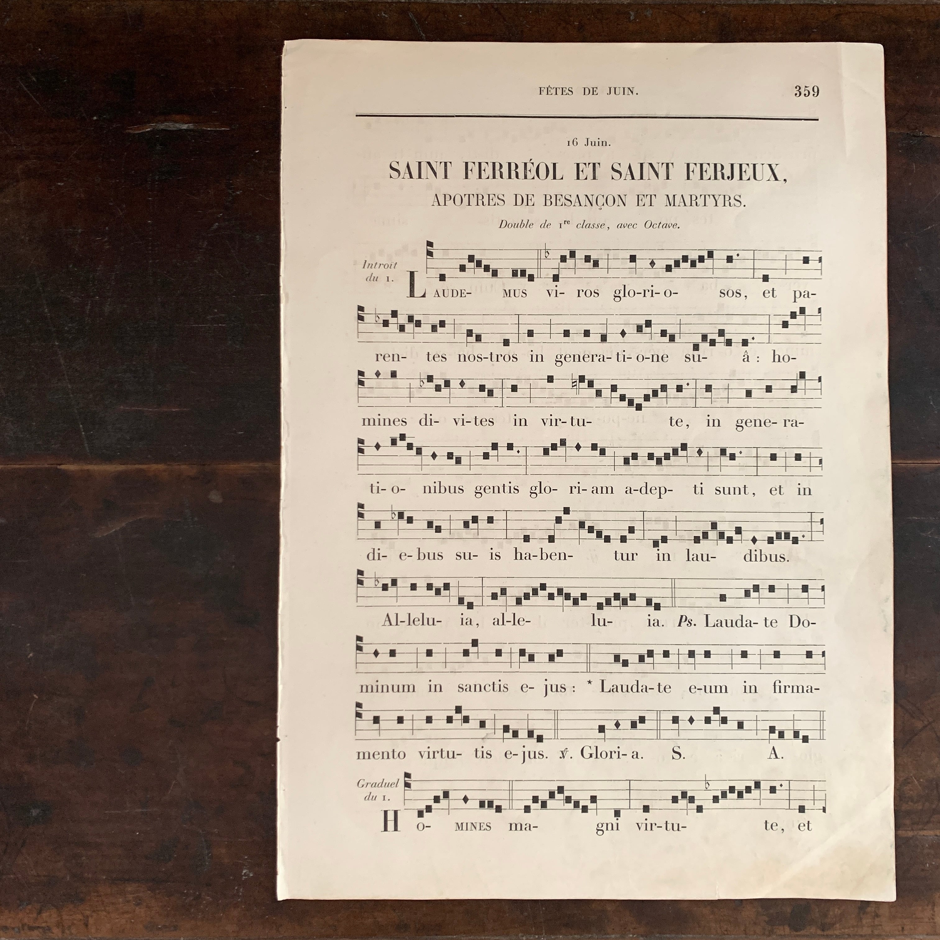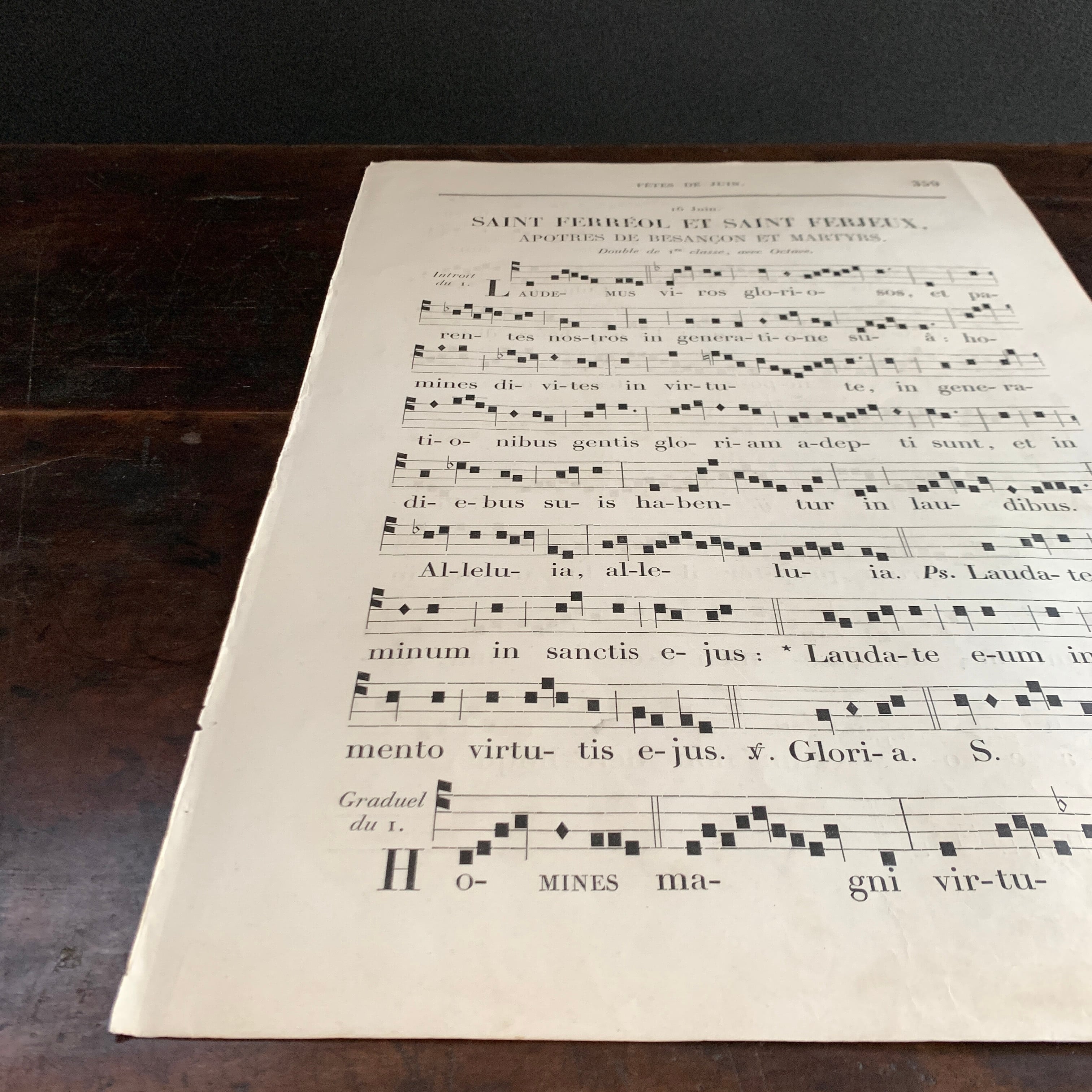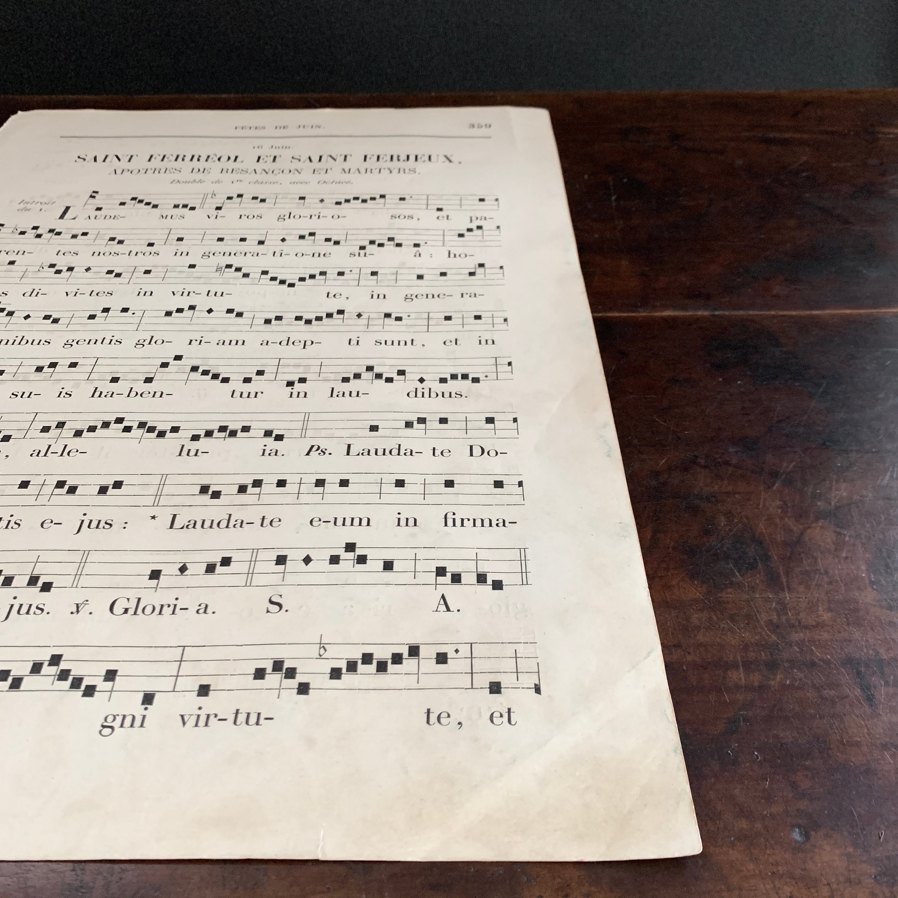 こちらのネウマ譜は大きな聖歌本を切り取ったと思われる両面印刷の紙の楽譜になります。