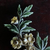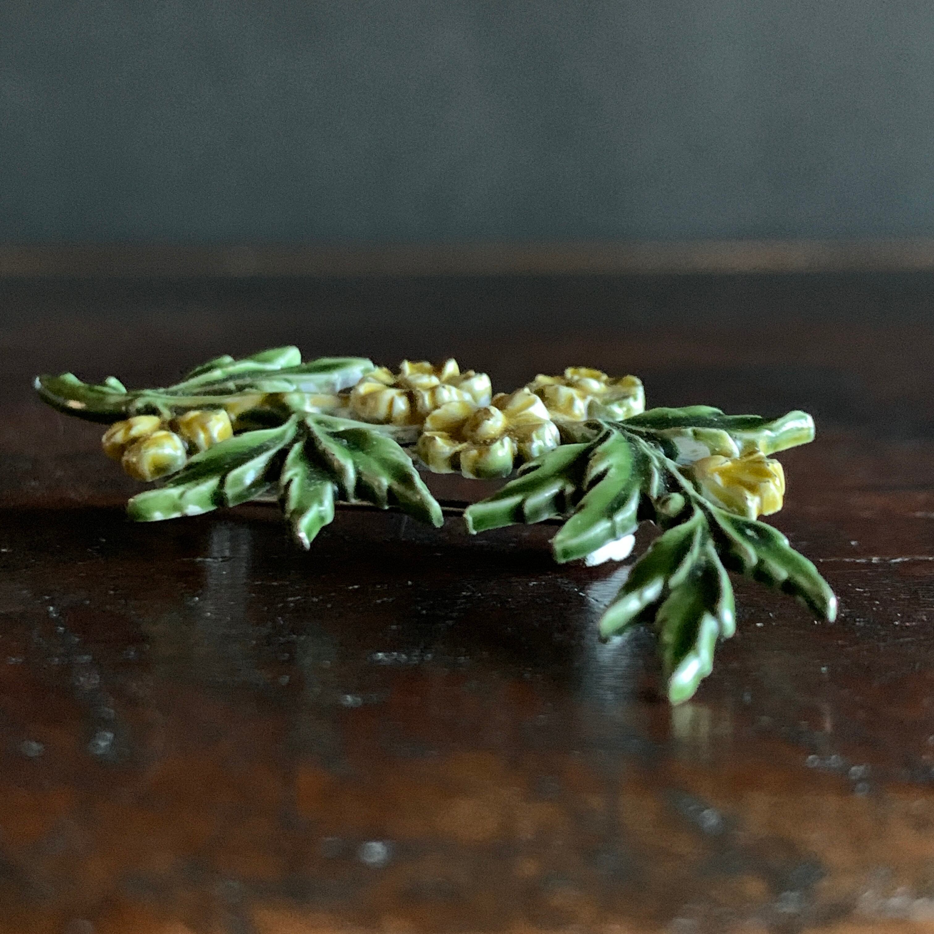 淡いグリーンの葉と優しいイエローの小花で艶のある質感に色付けされています。