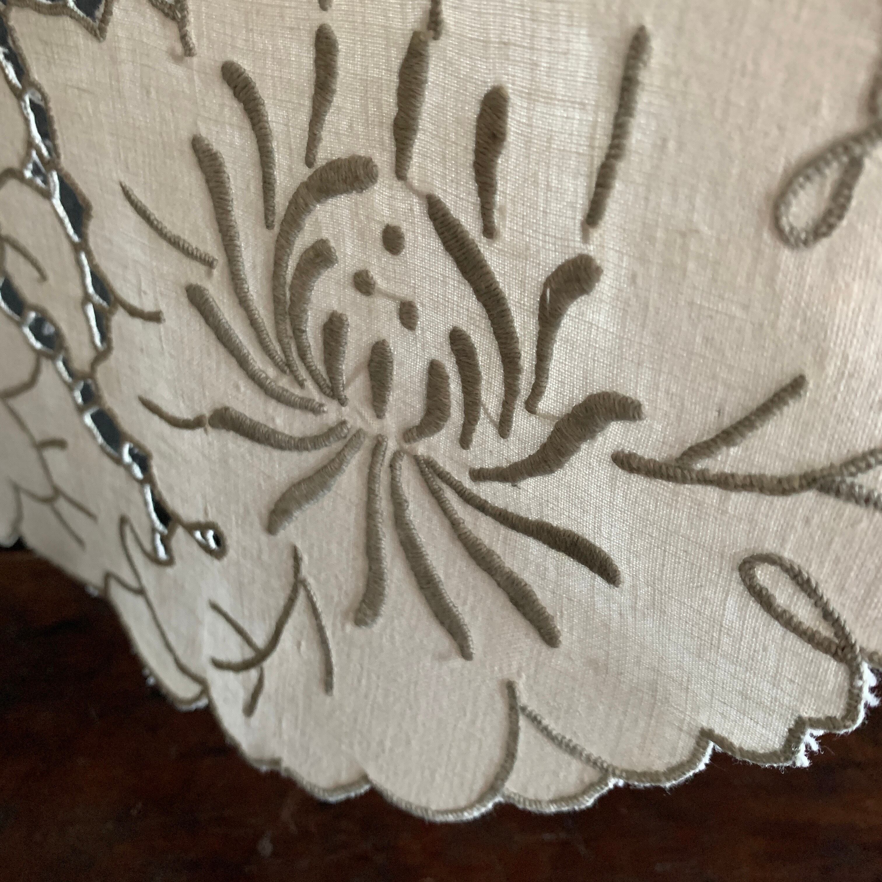 薄いベージュのコットン生地にグレーの糸で丁寧に手刺繍が施され、生地と糸との濃淡と刺繍の凹凸感が美しくナチュラルな印象のドイリーレースです。