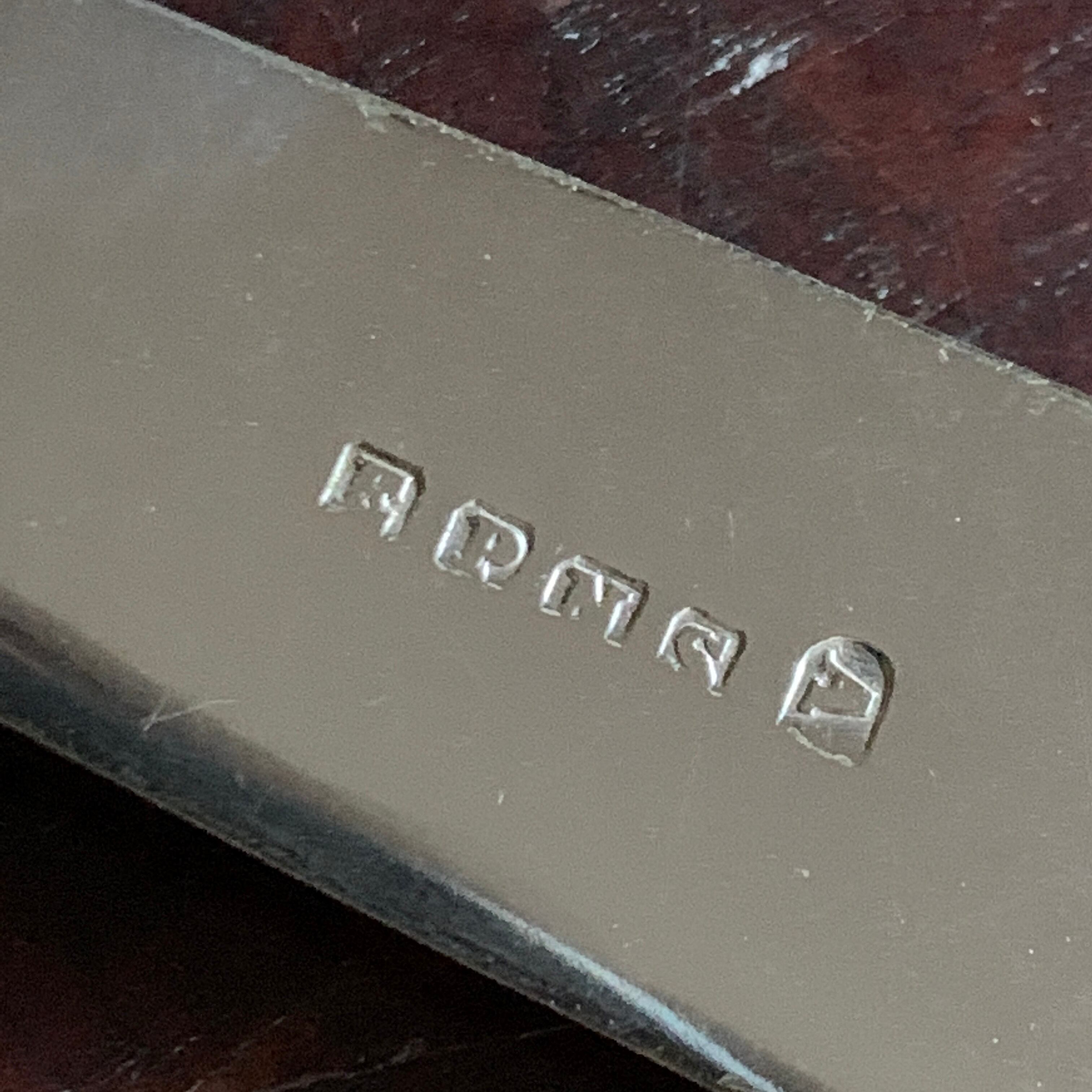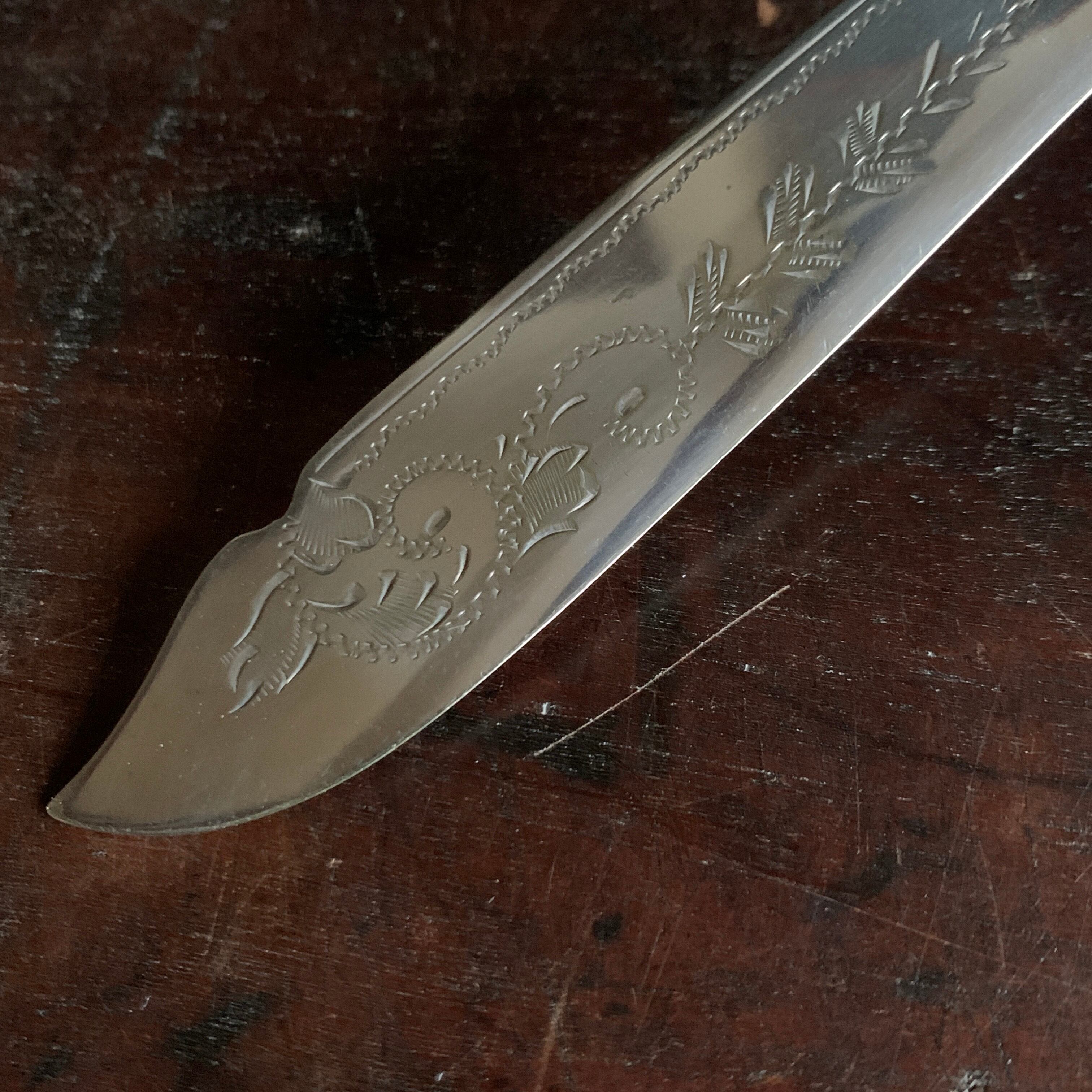 また、シルバープレートの刃の部分には、熟練の職人によるハンドエービング(手彫り)装飾が見事に施され、つなぎの部分にも細かな装飾がありとても美しい1品です。