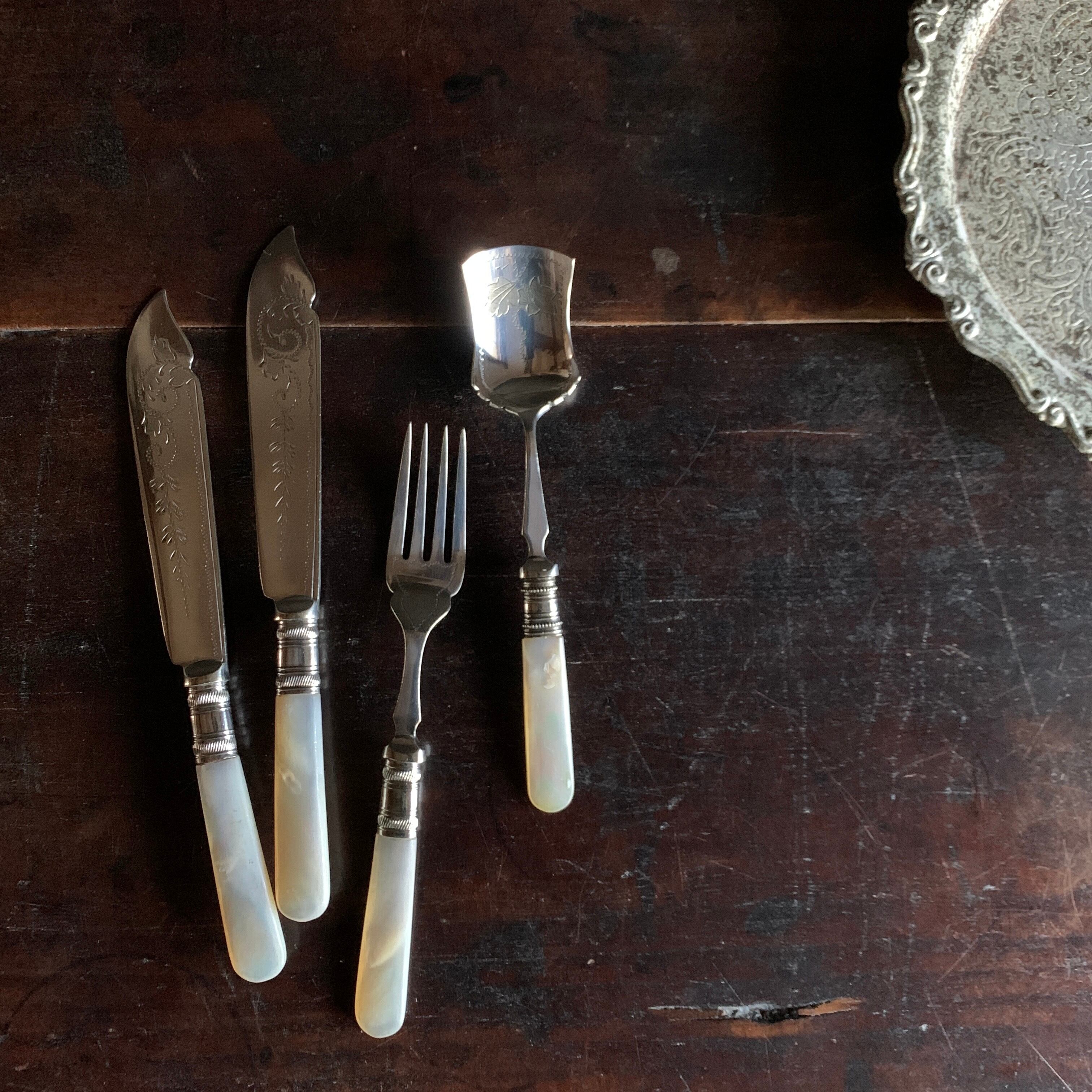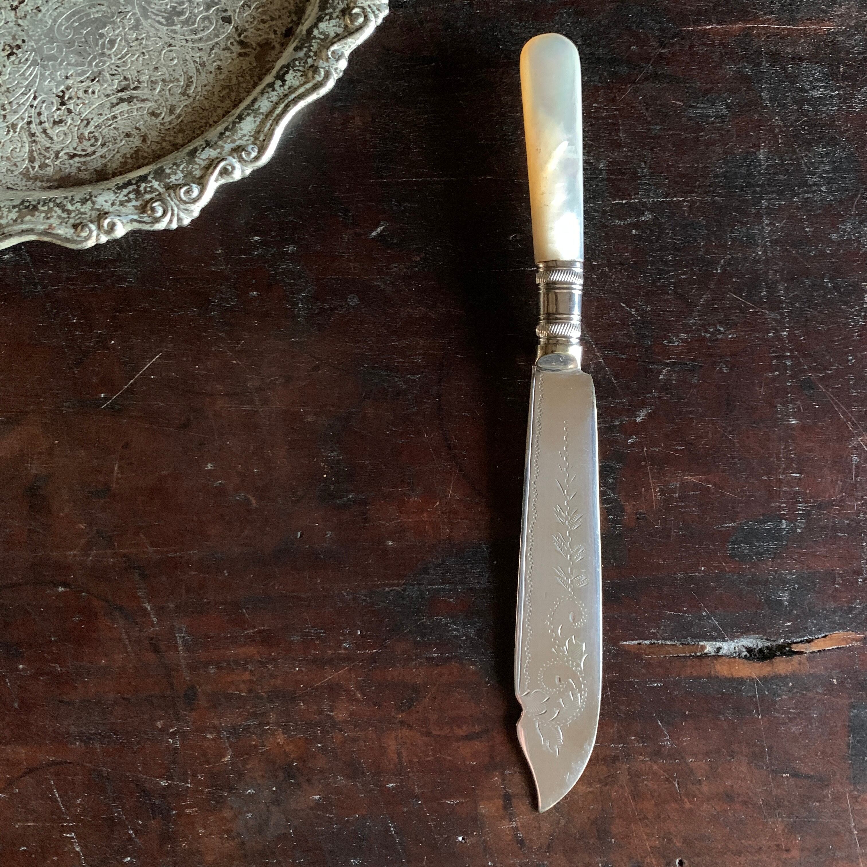 シルバープレートとマザーオブパール・白蝶貝がハンドルのヴィンテージのナイフです。