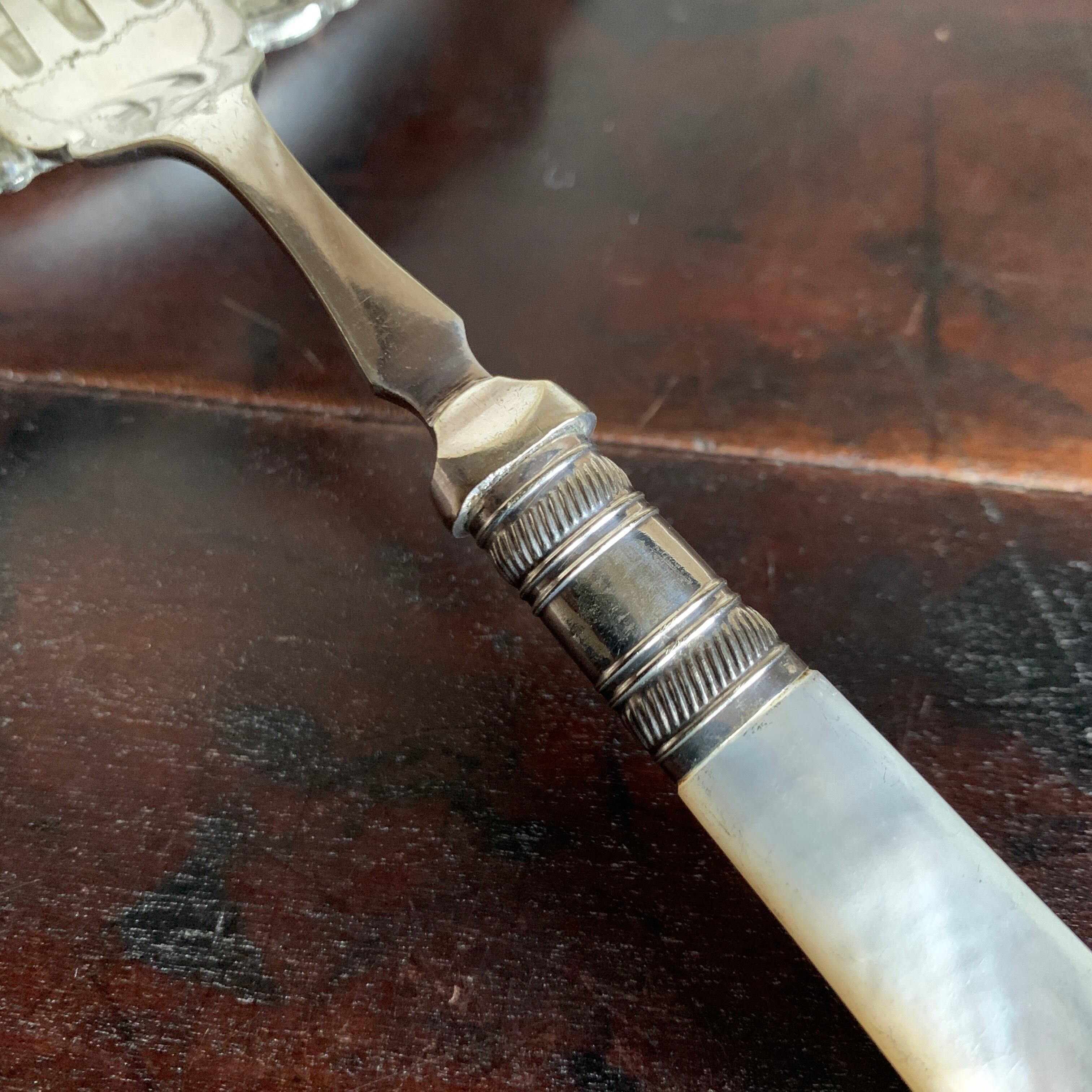 シルバープレートとマザーオブパール・白蝶貝のハンドルのヴィンテージ・デザートフォークです。