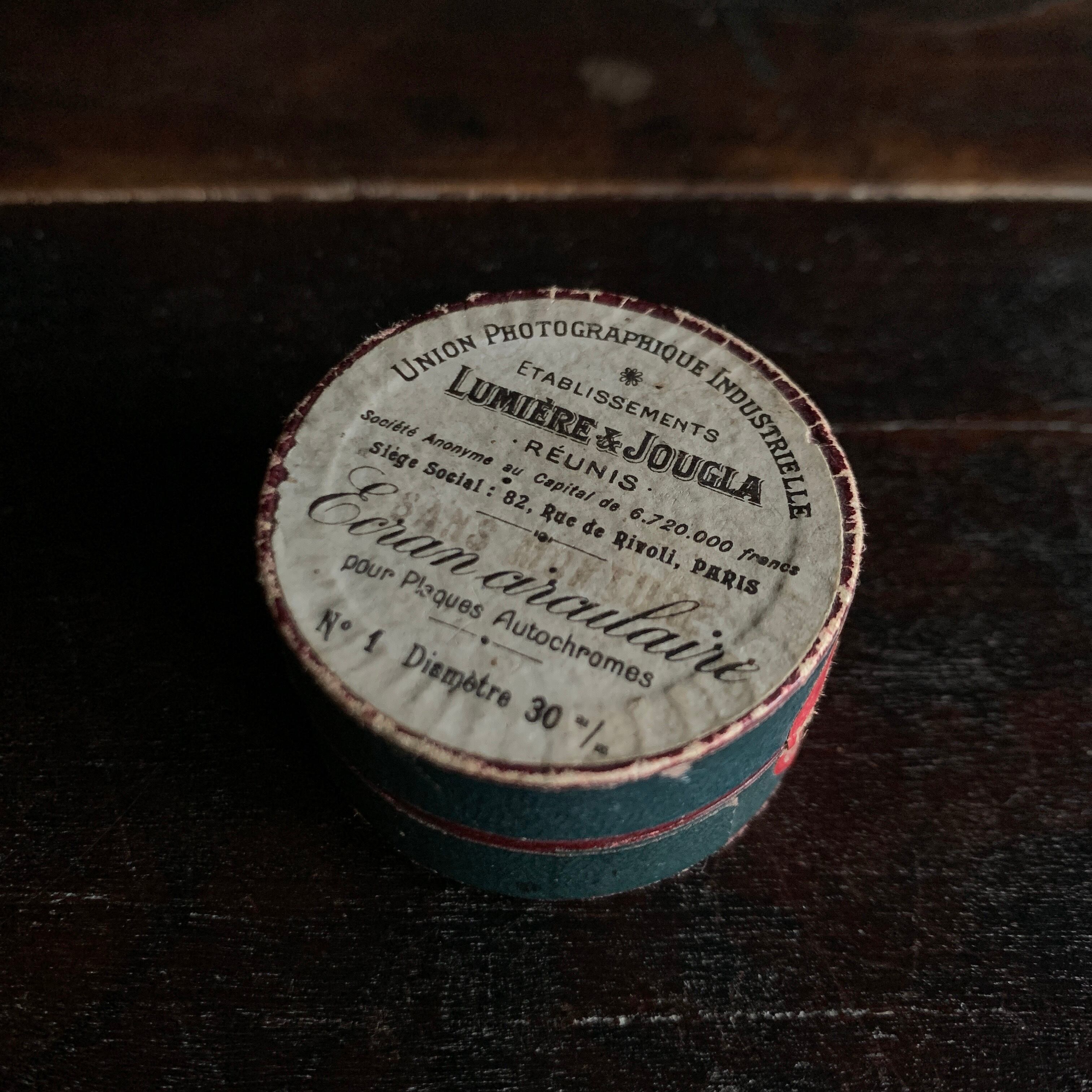 こちらは、フランスのリュミエール兄弟によって1903年に発明された、オートクローム(世界で初めて作られたカラー写真)のレンズが入っていたと思われる紙箱です。