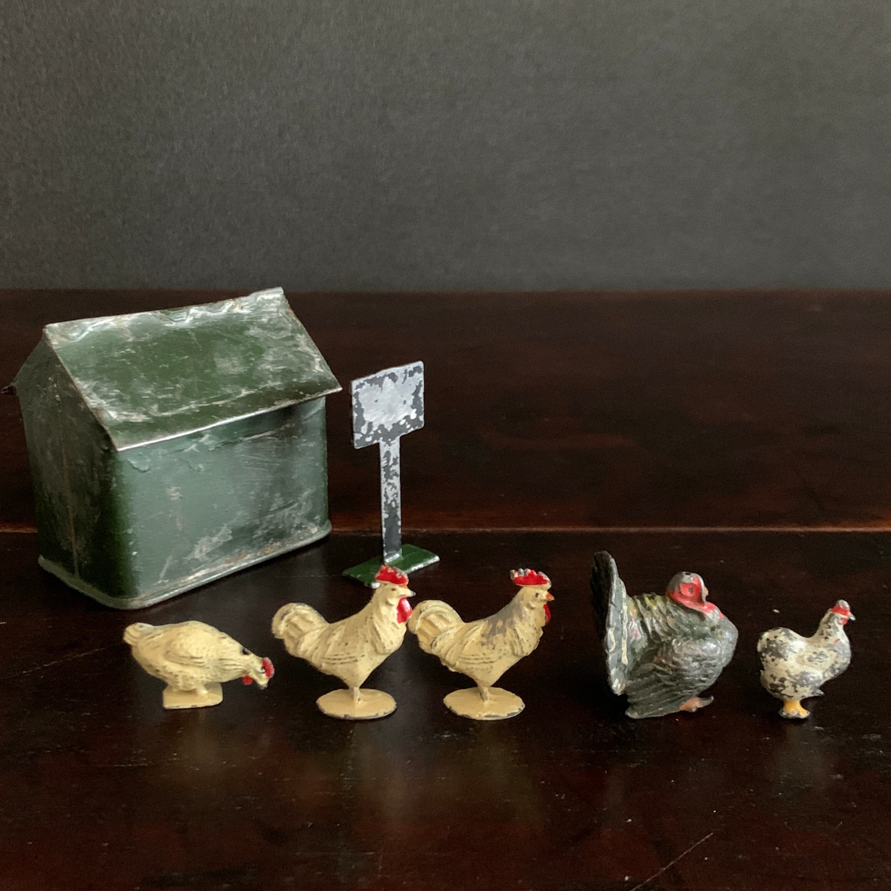 イギリスの蚤の市で見つけたミニチュアセット。ニワトリと鶏小屋、スタンドのセットです。