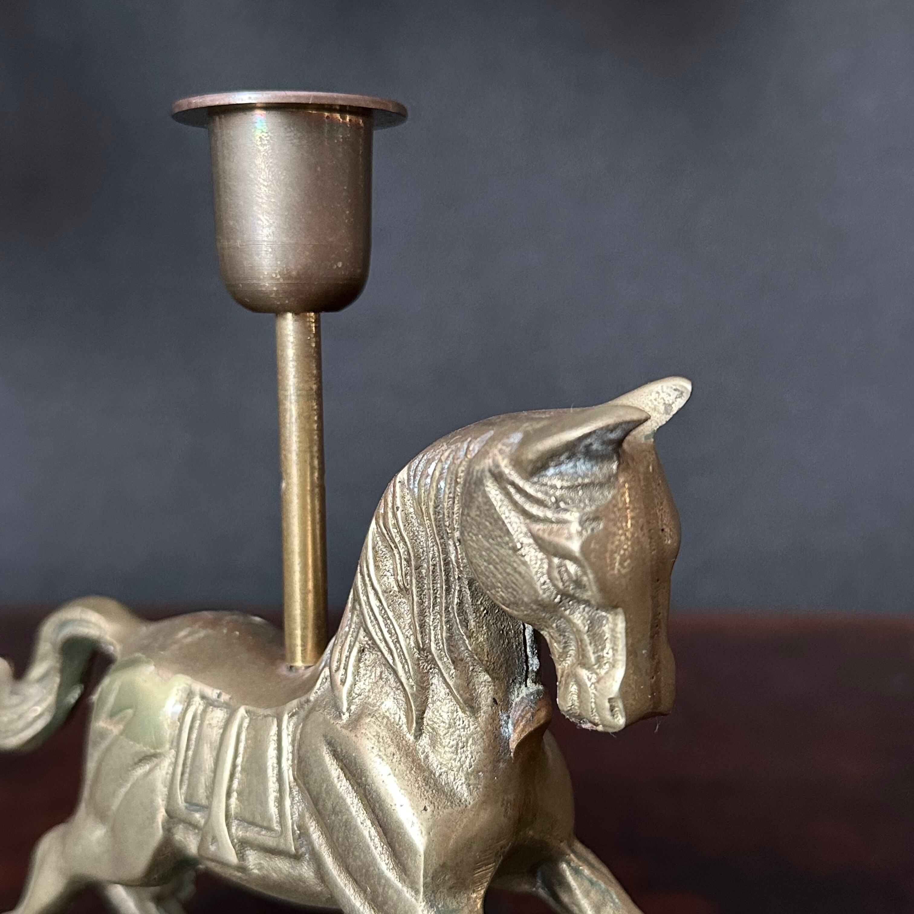 真鍮製でずっしりとした重厚感と存在感があります。ロッキングホースのようなデザインとなっておりますが、こちらはキャンドルスタンドのためゆらゆらとは揺れず、しっかり立つ作りになっております。