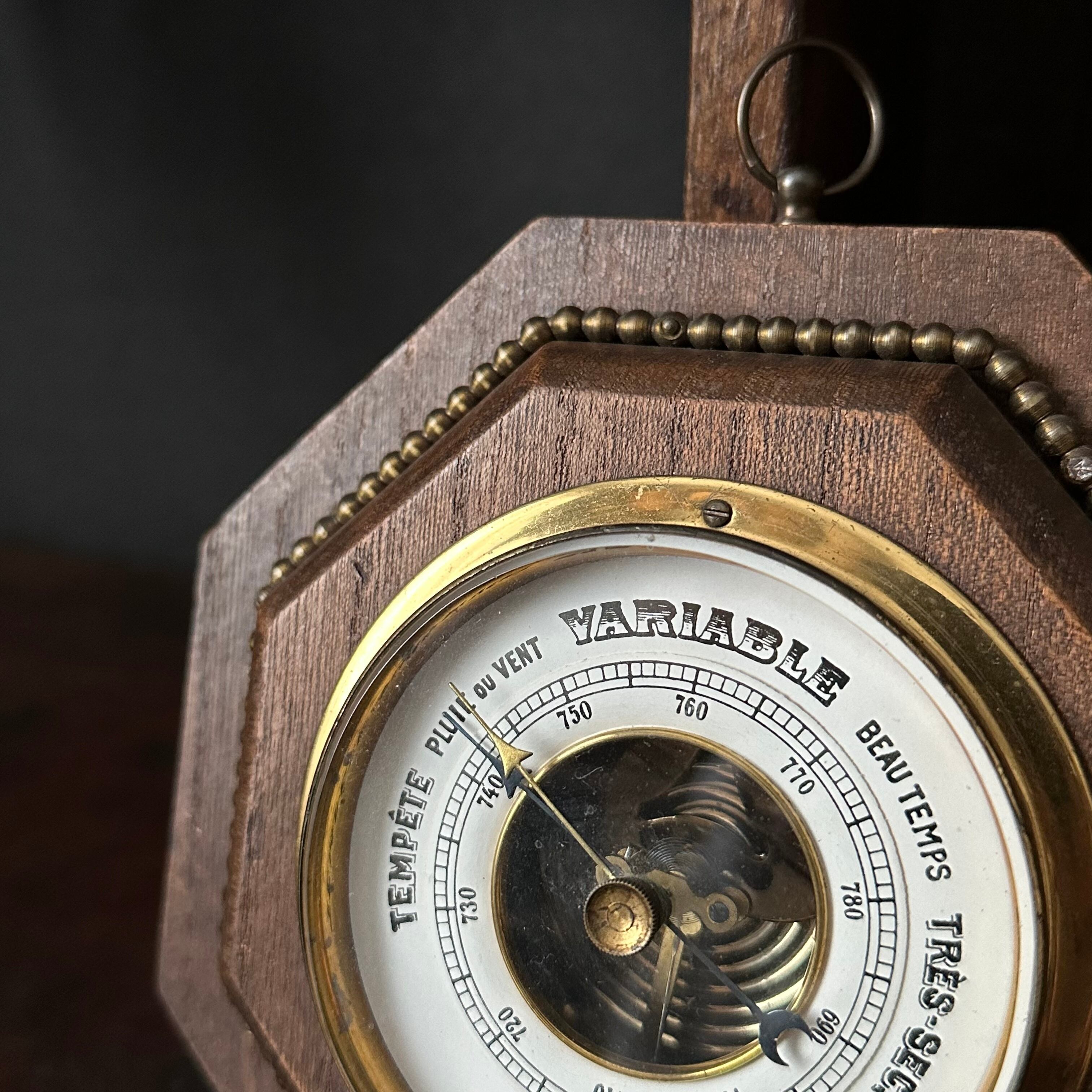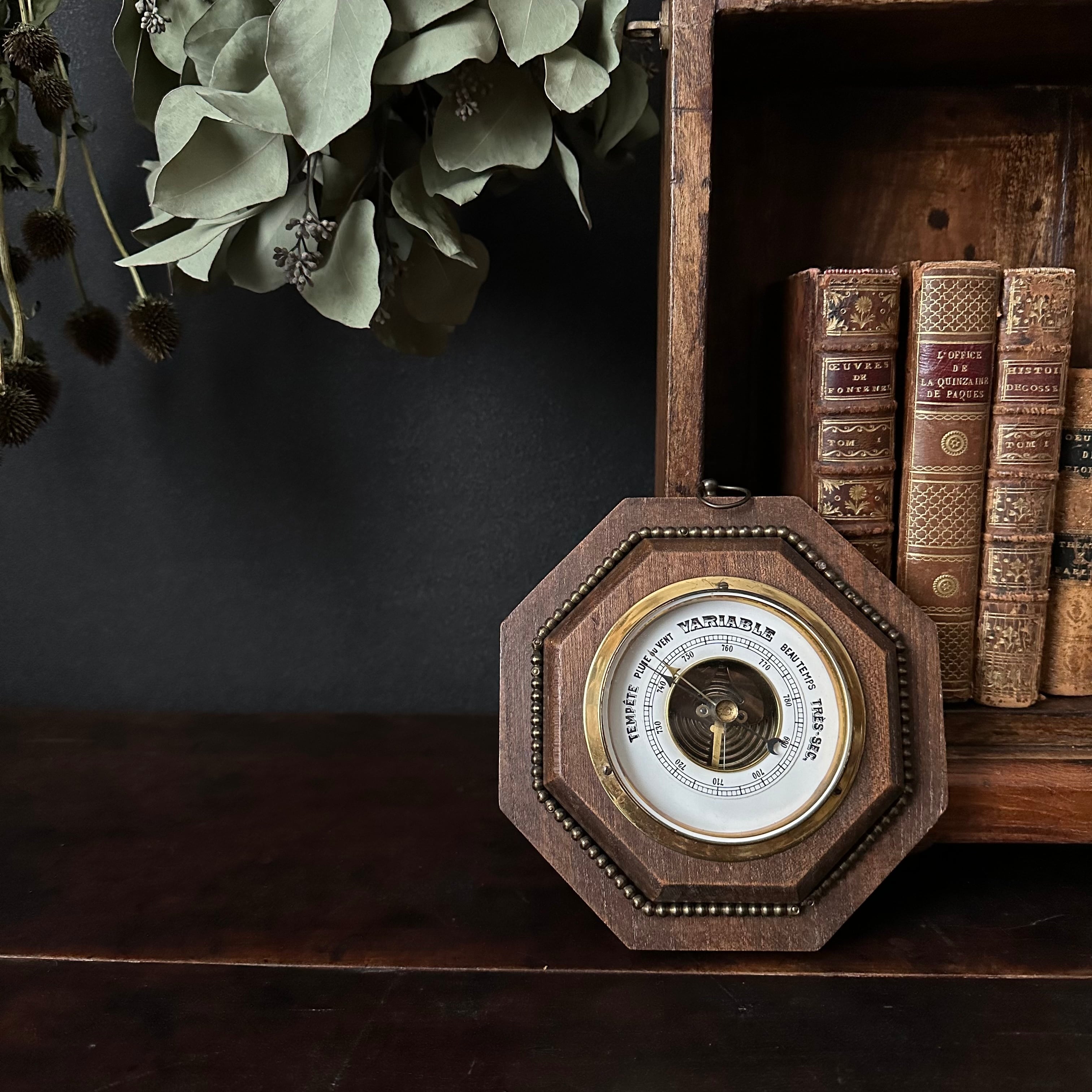 八角形の気圧計は珍しい形状で、木枠にはとても硬い素材の木材が使われており、経年により味わい深い色合いとなっております。