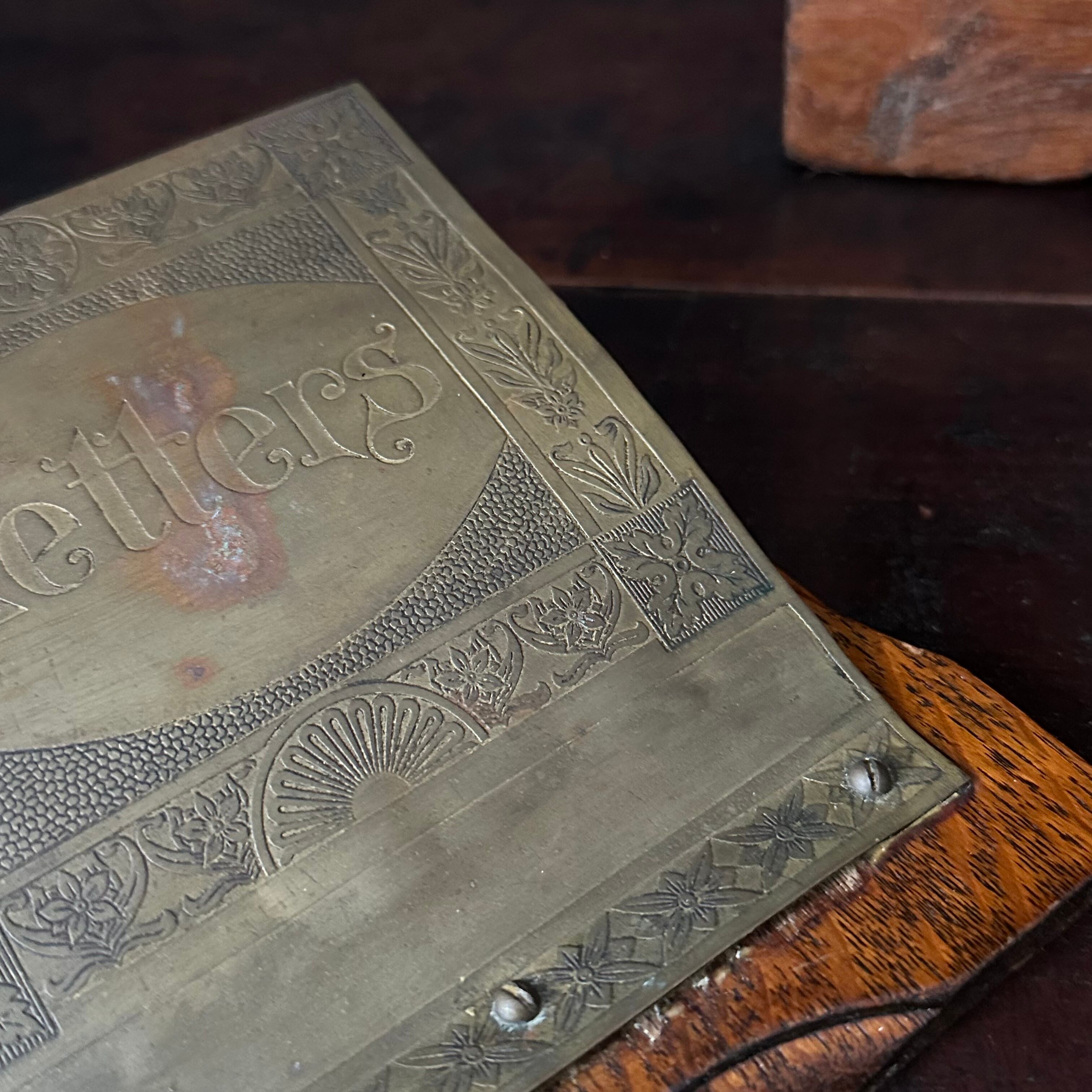 背面の木製の板に真鍮のパネルとフック用の金具がついた壁掛けのレターラックです。
