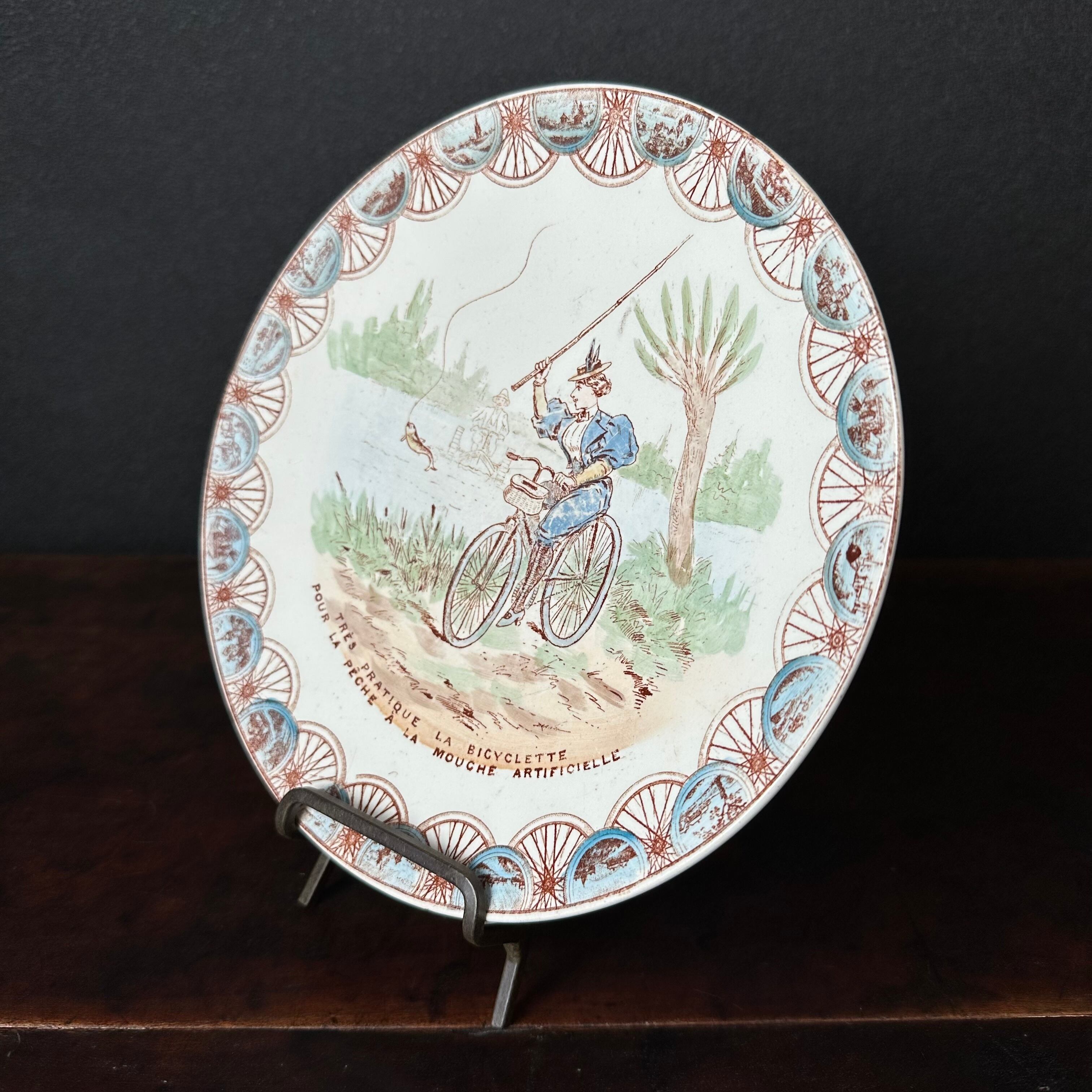 プレート表面にはフランス語で「Très pratique la bicyclette pour la pêche à la mouche artificielle」と書かれております。直訳すると「人工フライフィッシングにとても便利な自転車」。