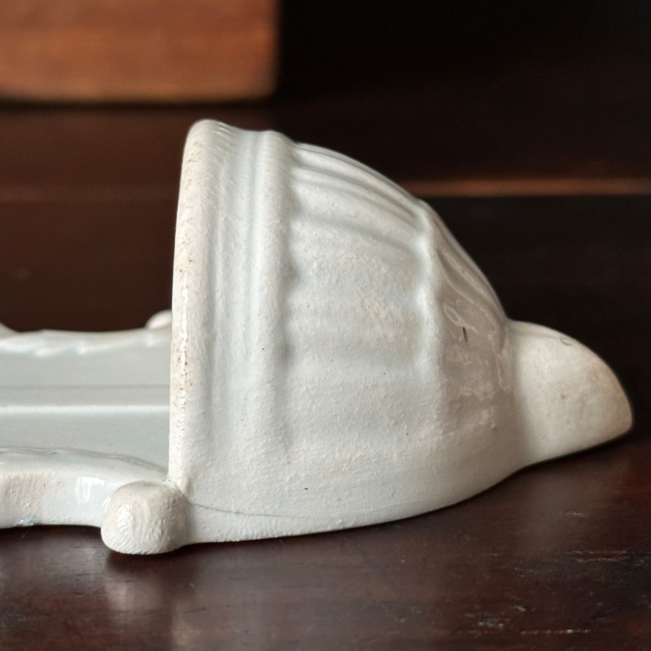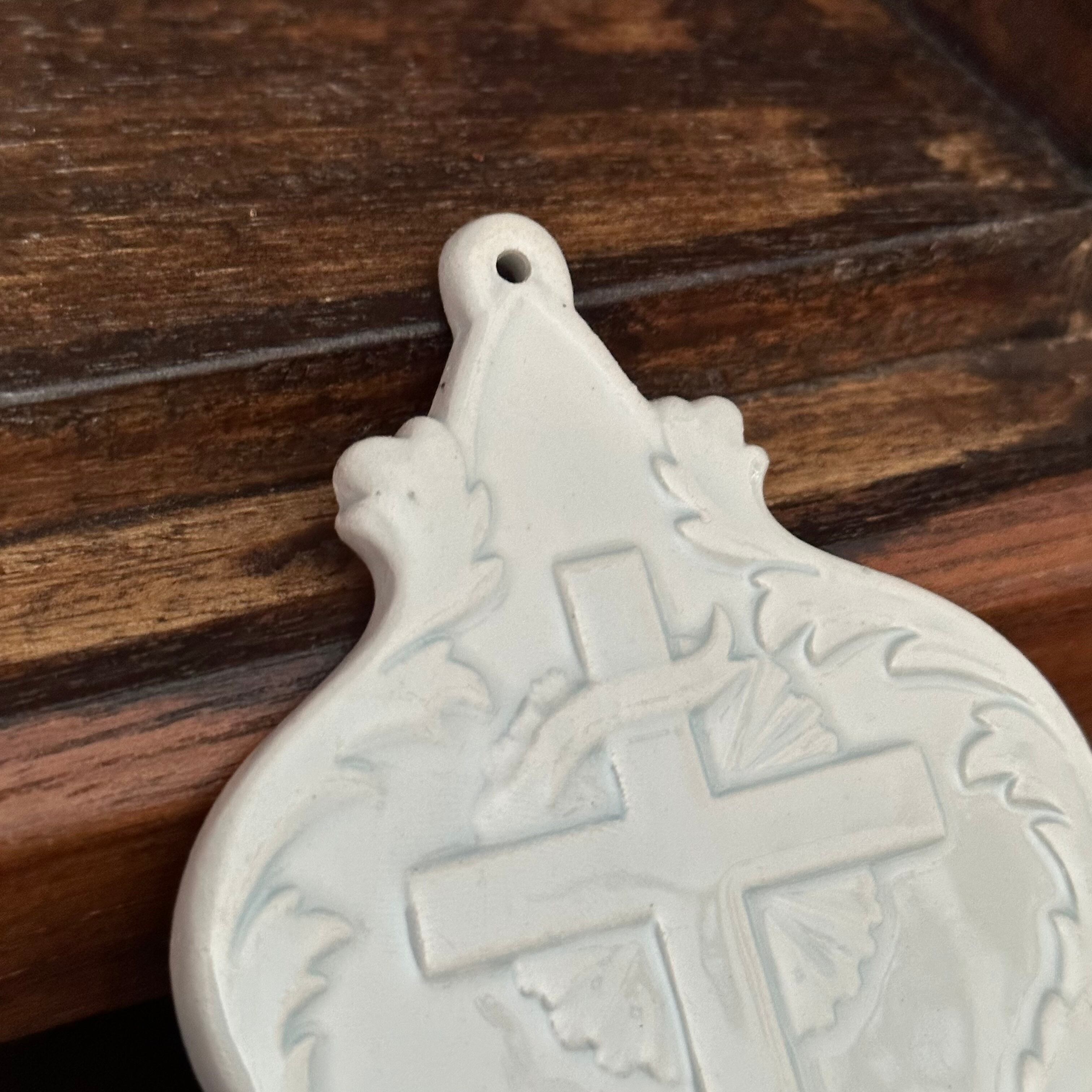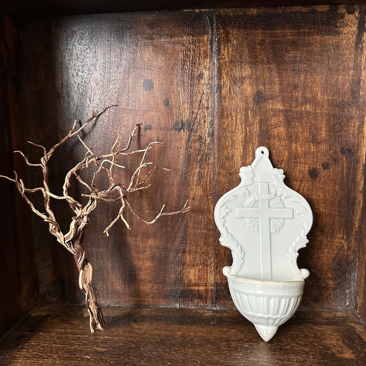 こちらは真っ白な下地にほんのり青みのある釉薬かけられた美しい白さの聖水盤で、十字架や植物のレリーフ装飾に釉薬の艶やかさが加わり立体感のあるデザイン。そのまま壁にかけて飾っても素敵なインテリアとなりそうです。
