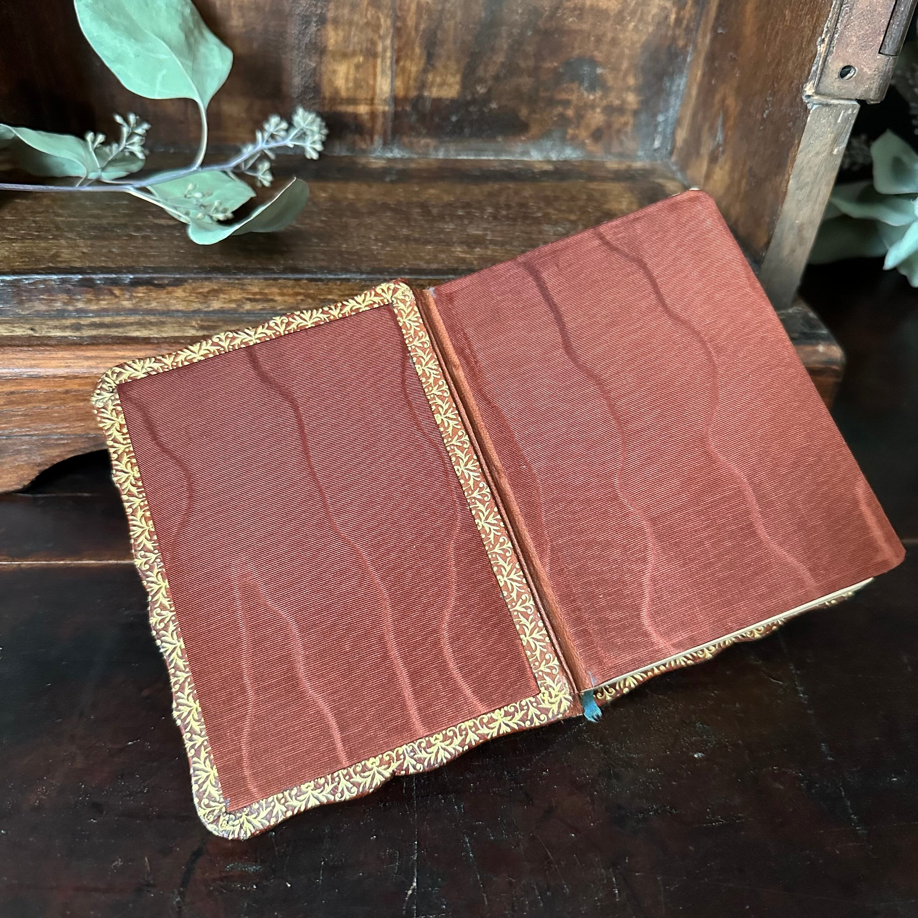 茶色い革張りで花模様の金彩装飾、見返しは布張り、小口にも金彩が施され高級感を漂わせています。