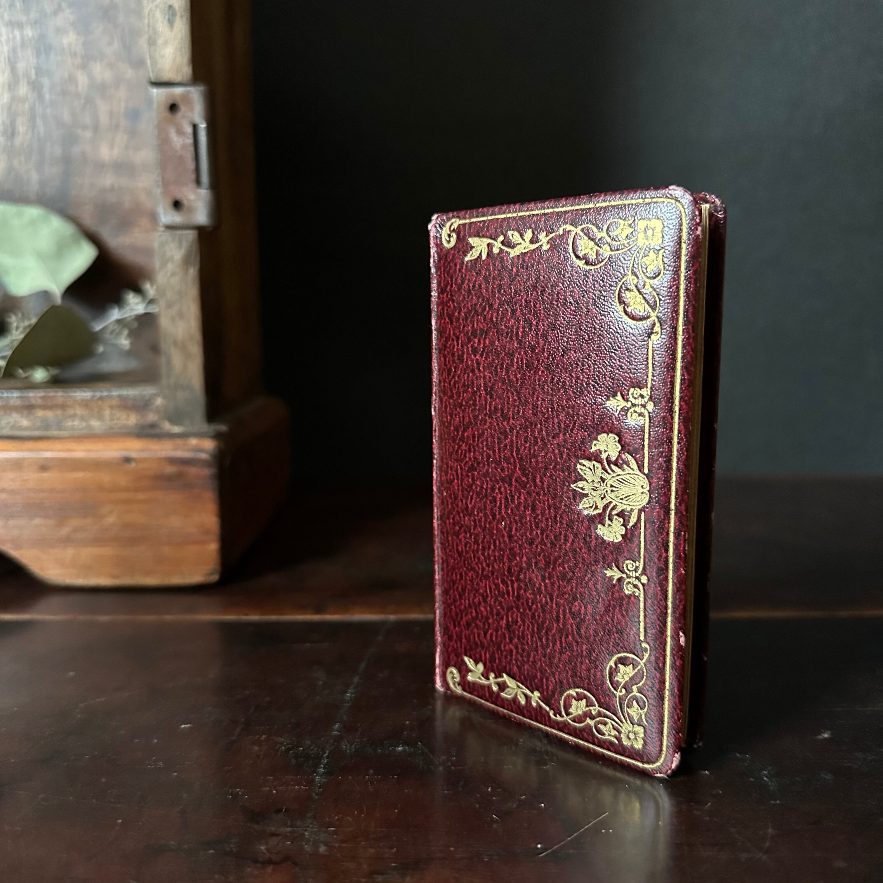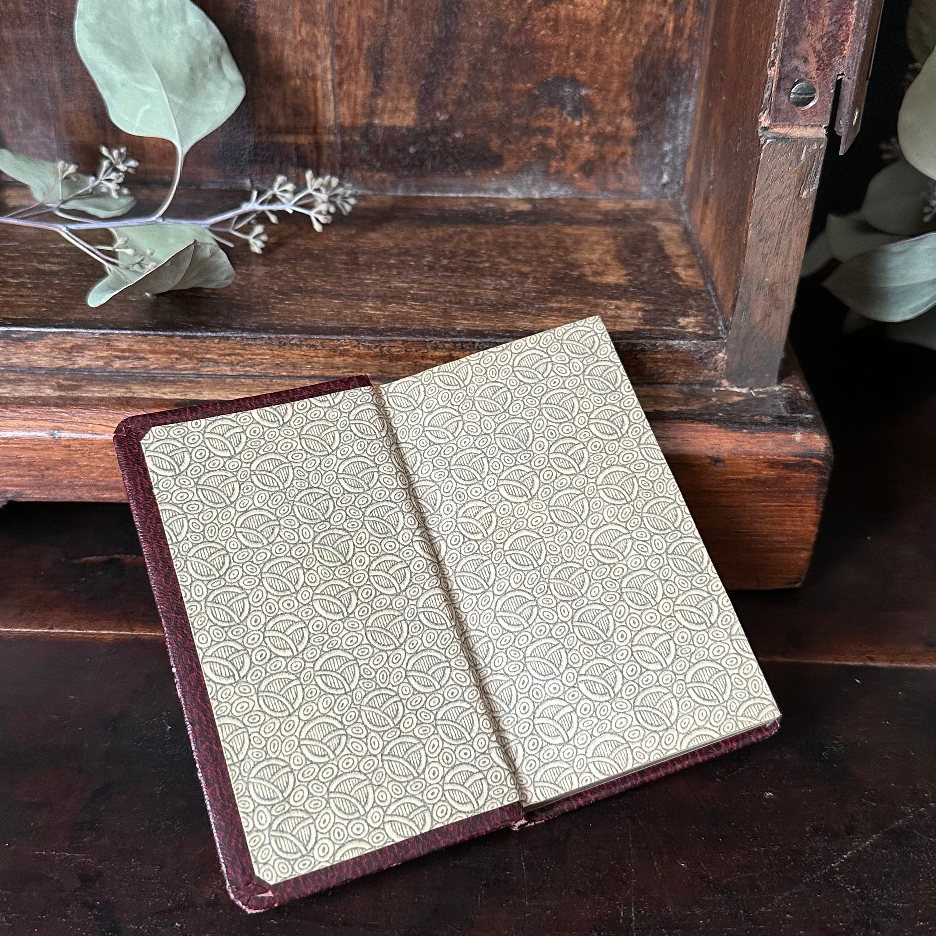 エンジ色(赤茶)の革張りで花模様の金彩装飾、見返しは可愛らし柄の紙が貼られており、小口には赤みのかかった金彩が施され高級感を漂わせてくれています。