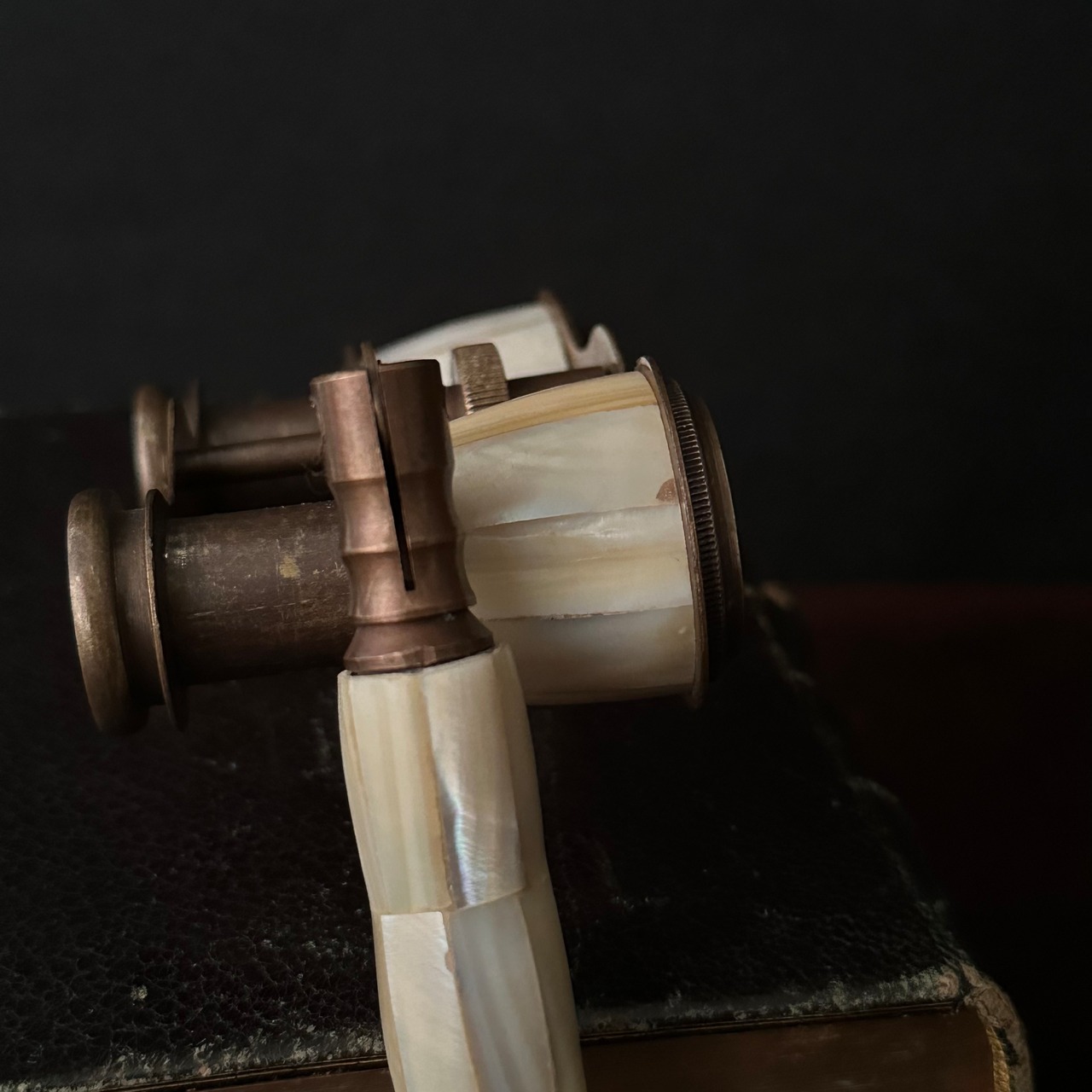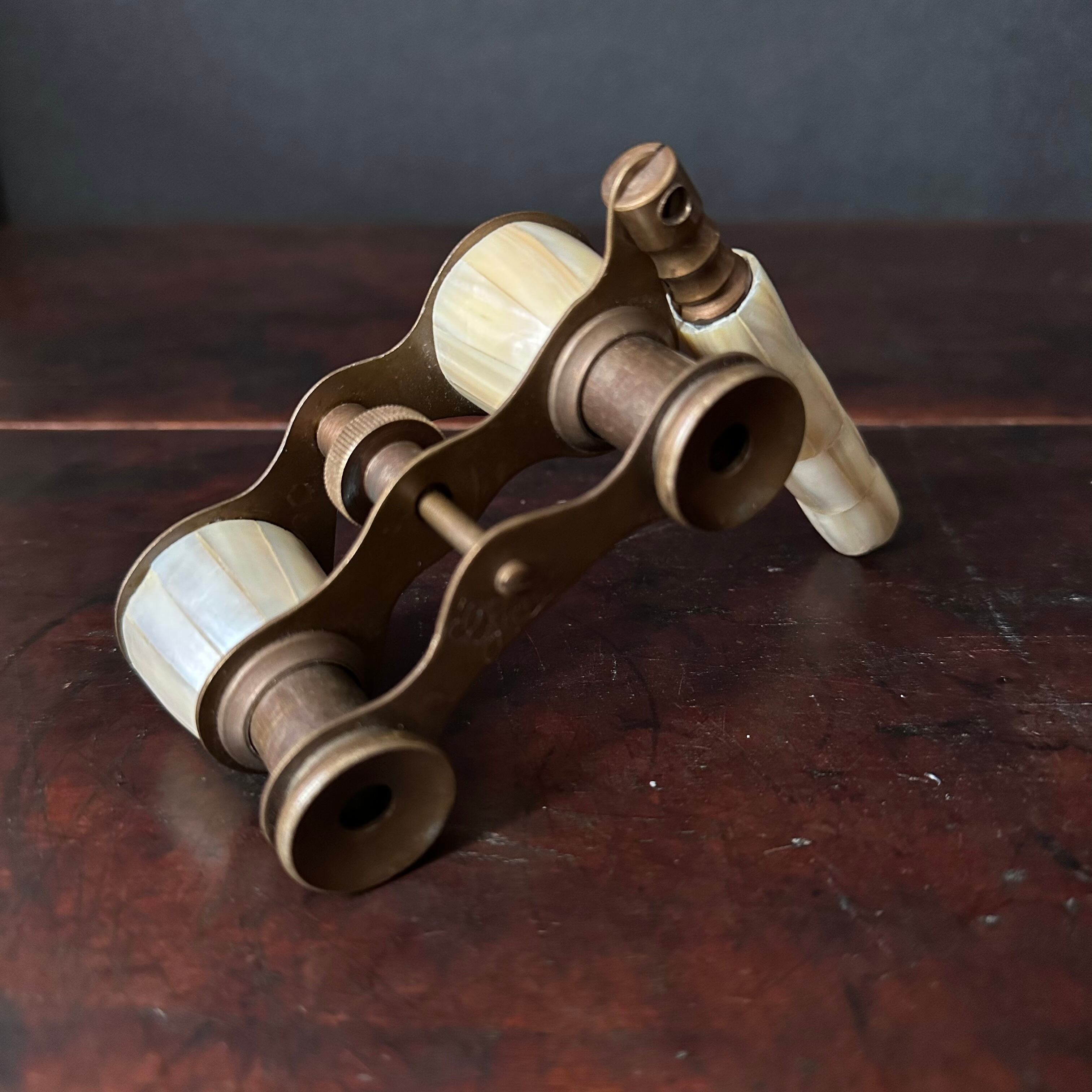 美しい色艶のマザーオブパール(白蝶貝)と経年のくすみ具合が印象的な真鍮のオペラグラスです。カットして施されたマザーオブパールは1枚ずつ色や輝きが異なり模様の様にも見えます。ハンドルが付いた上品で優雅なデザインの一品です。