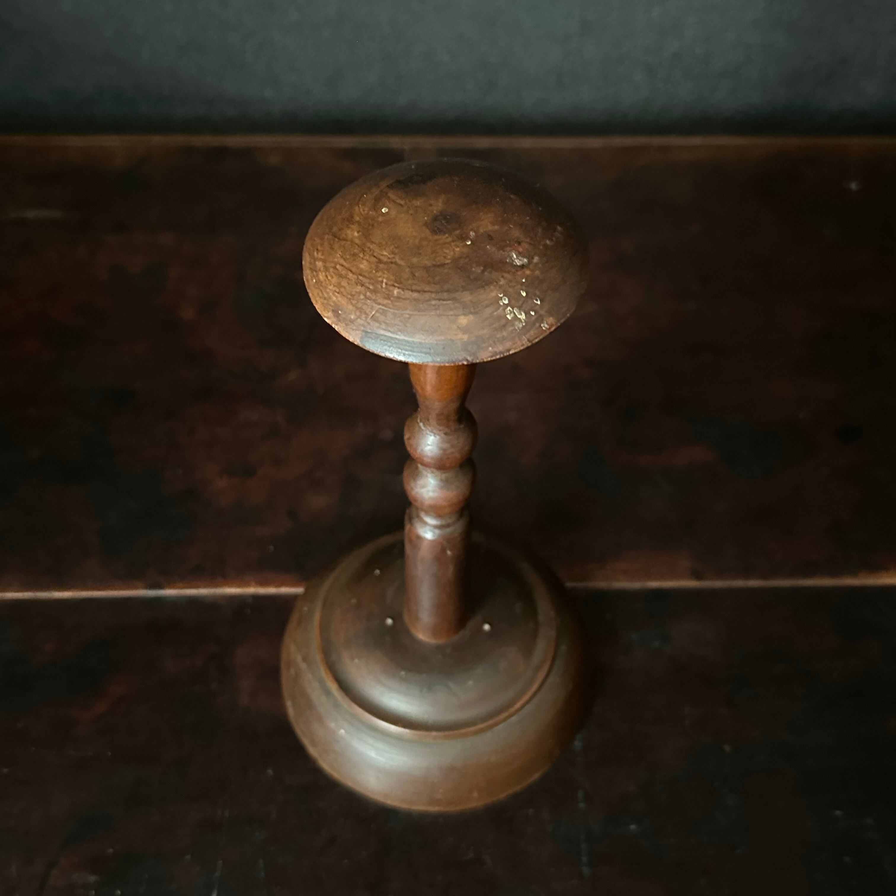 ダークなブラウンの色合いに経年によるくすみ感が相まって渋さのあるスタンドはヘッドが小さめ、ベースはコロンと丸みのあるしっかりとした安定感があります。