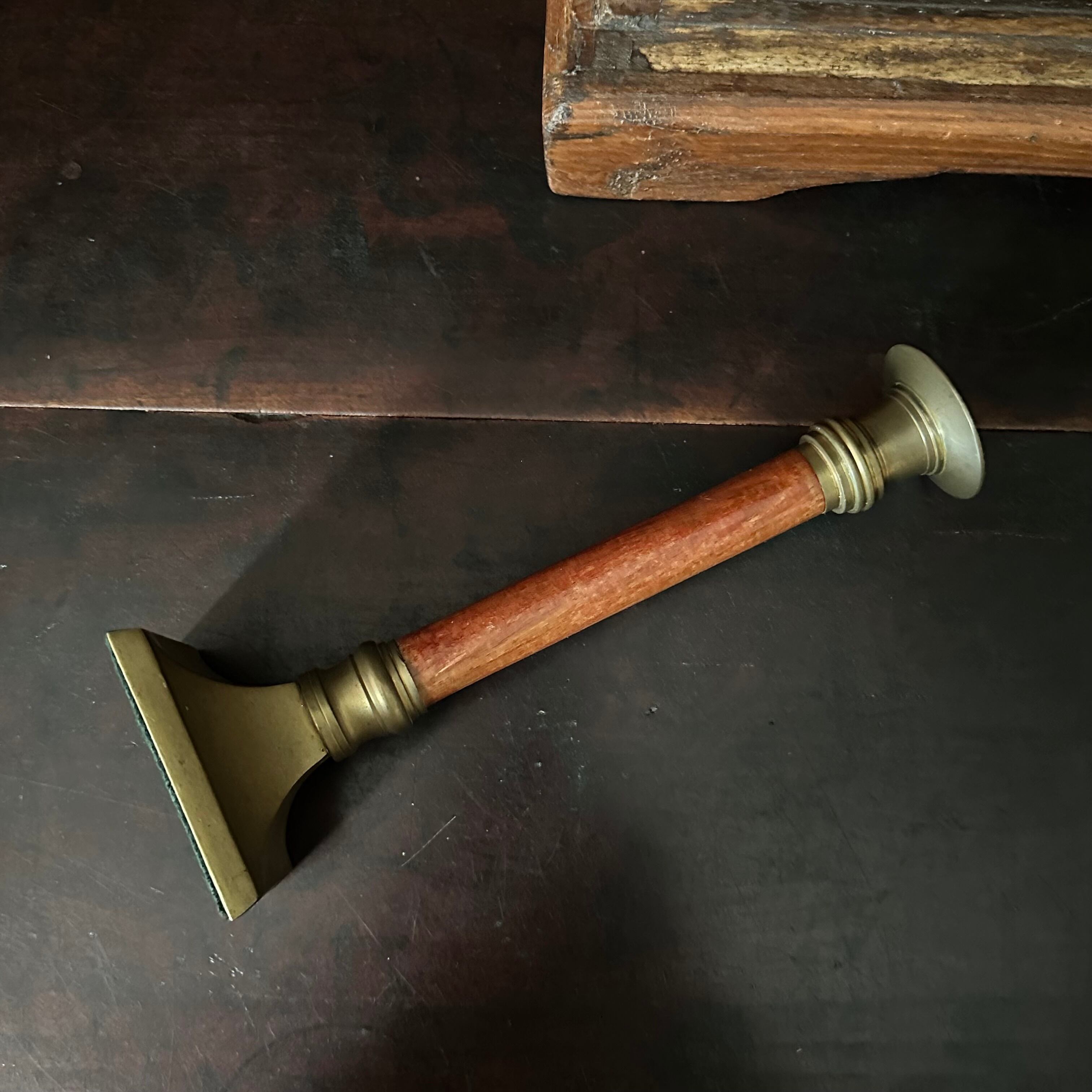 真鍮と木の珍しい組み合わせで真鍮は経年によるくすみでマットな質感、木部はやや艶のある質感です。木部はマホガニーのような赤みのあるブラウンで高級感が漂う佇まい。優雅なお部屋作りのワンポイントとなりそうなお品ですね。