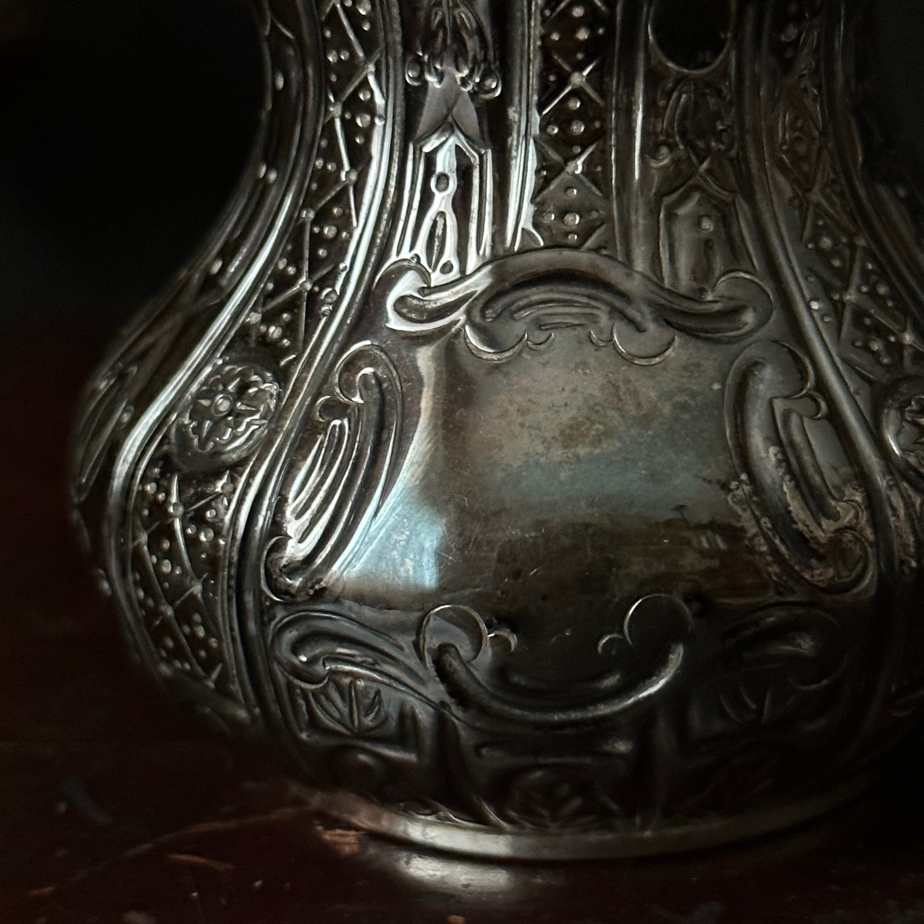 丸みのある柔らかなフォルムや縦のラインの中に植物模様や幾何学模様が連なる型押しの装飾、取手の滑らかな曲線、経年による色の変化など、どこを見ても華やかさを感じる逸品ではないでしょうか。