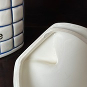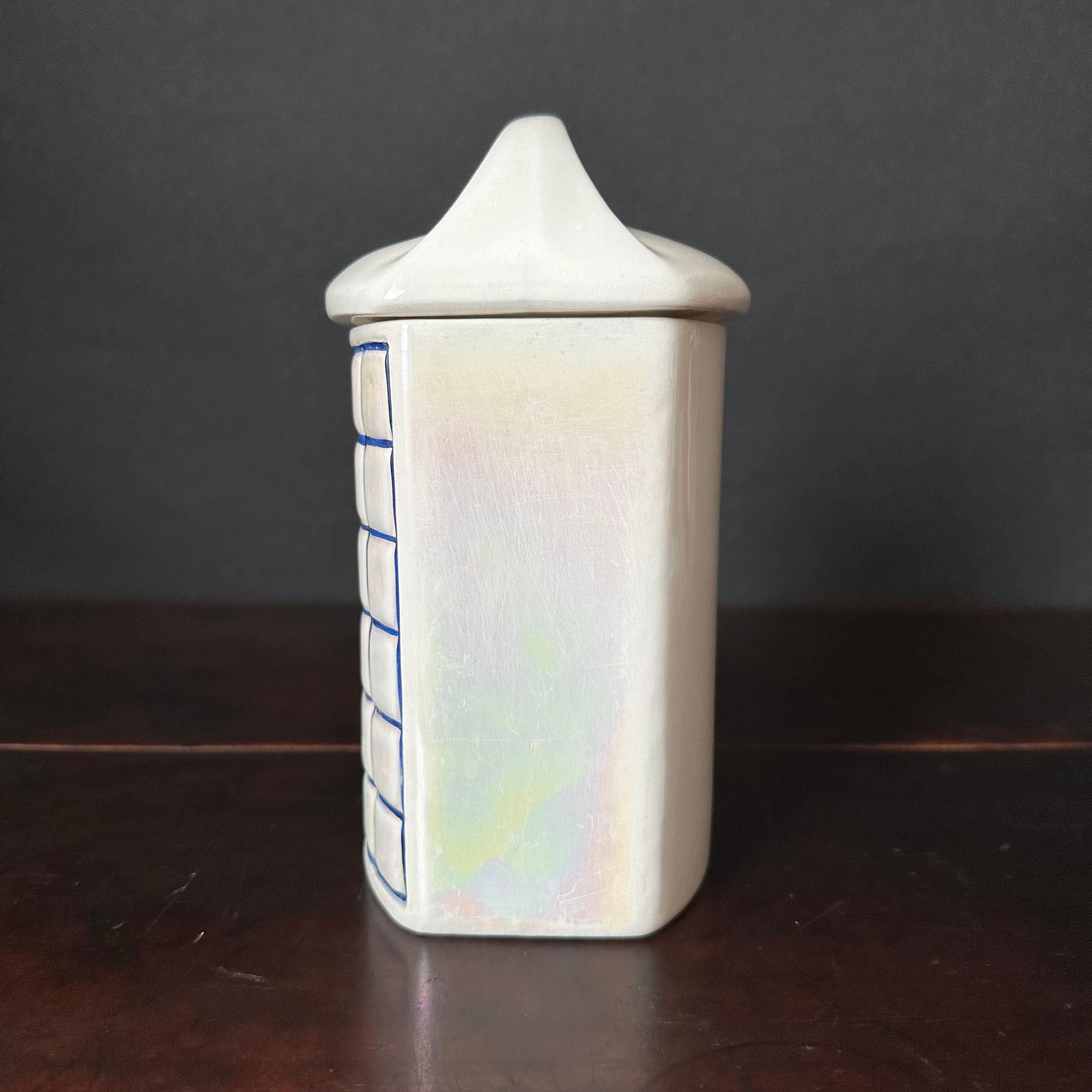 前面と側面の3面には真珠のような虹色の釉薬が施されております。前面ブルーの縁取りに格子状の模様はふっくらとした凹凸があり、虹色の輝きと合間って上品な美しさです。