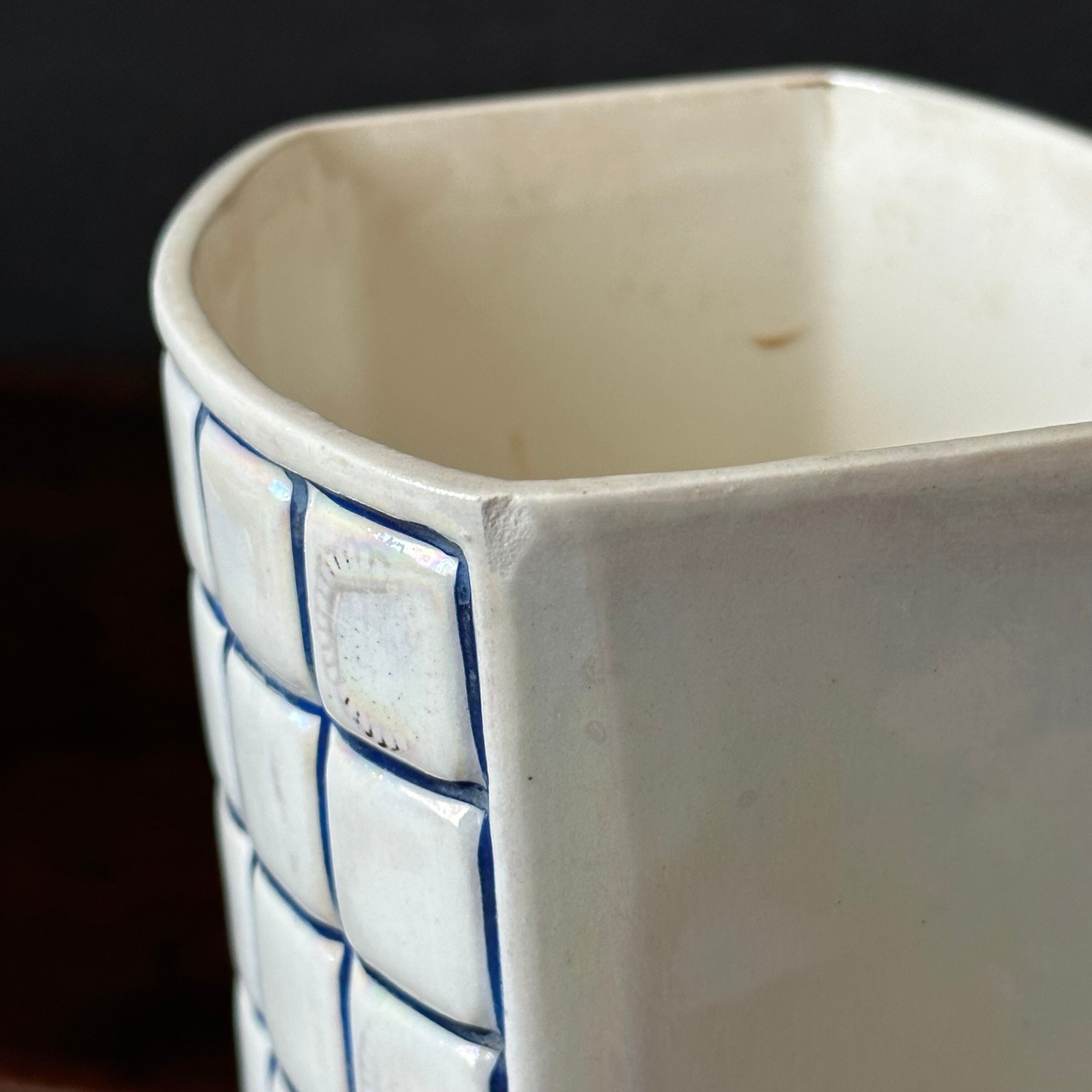 前面と側面の3面には真珠のような虹色の釉薬が施されております。前面ブルーの縁取りに格子状の模様はふっくらとした凹凸があり、虹色の輝きと合間って上品な美しさです。