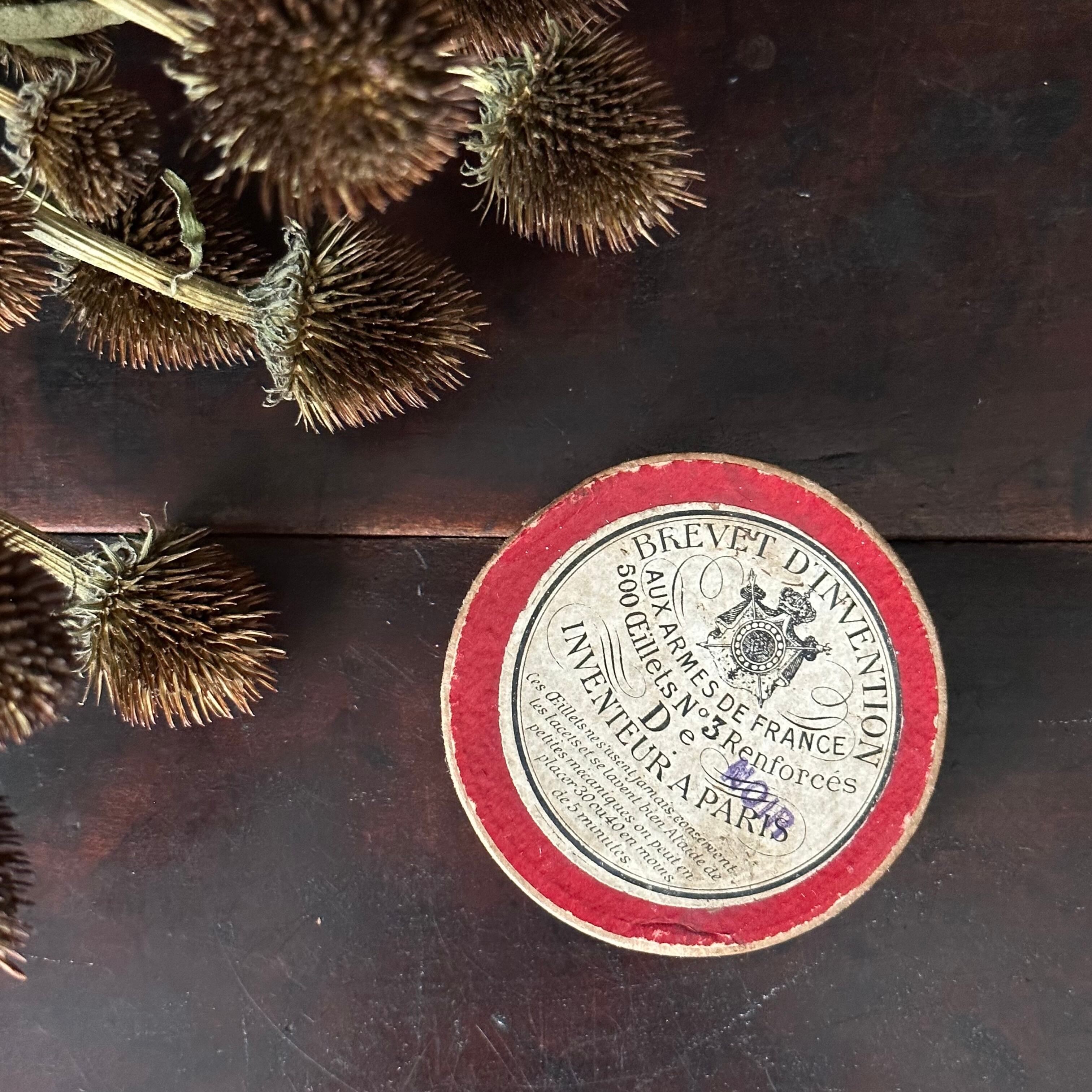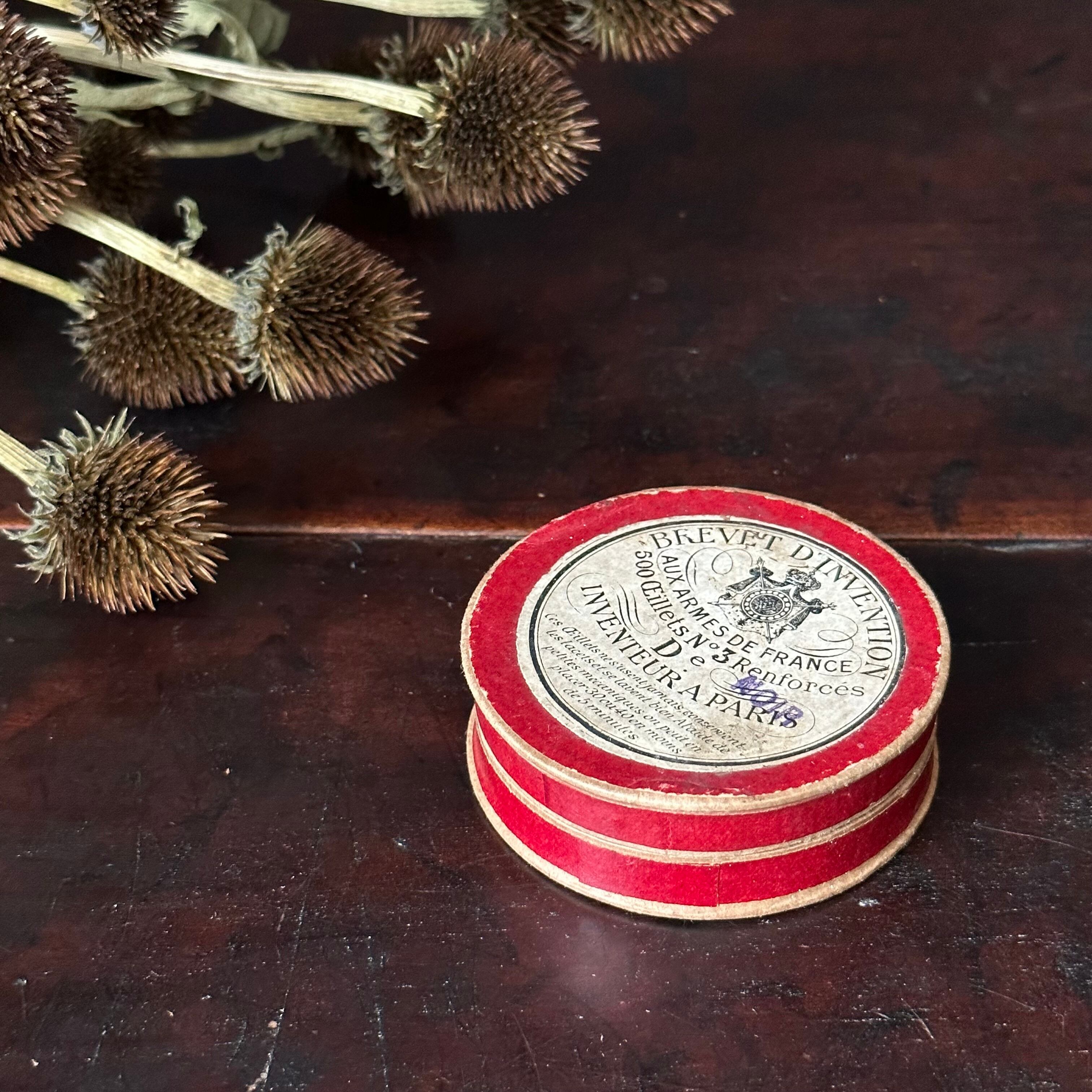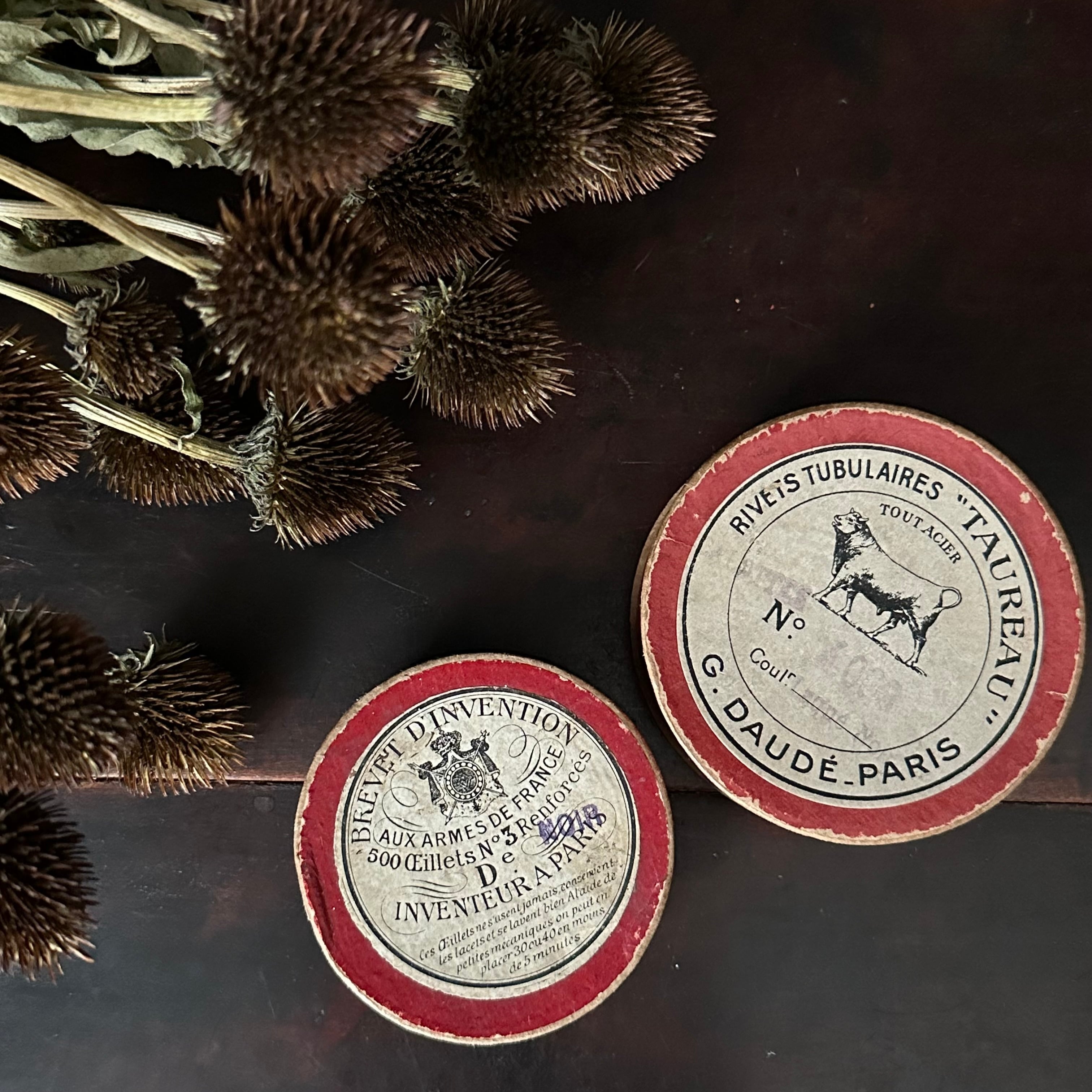 パリの蚤の市で見つけたラウンド型でラベルが素敵な紙箱。