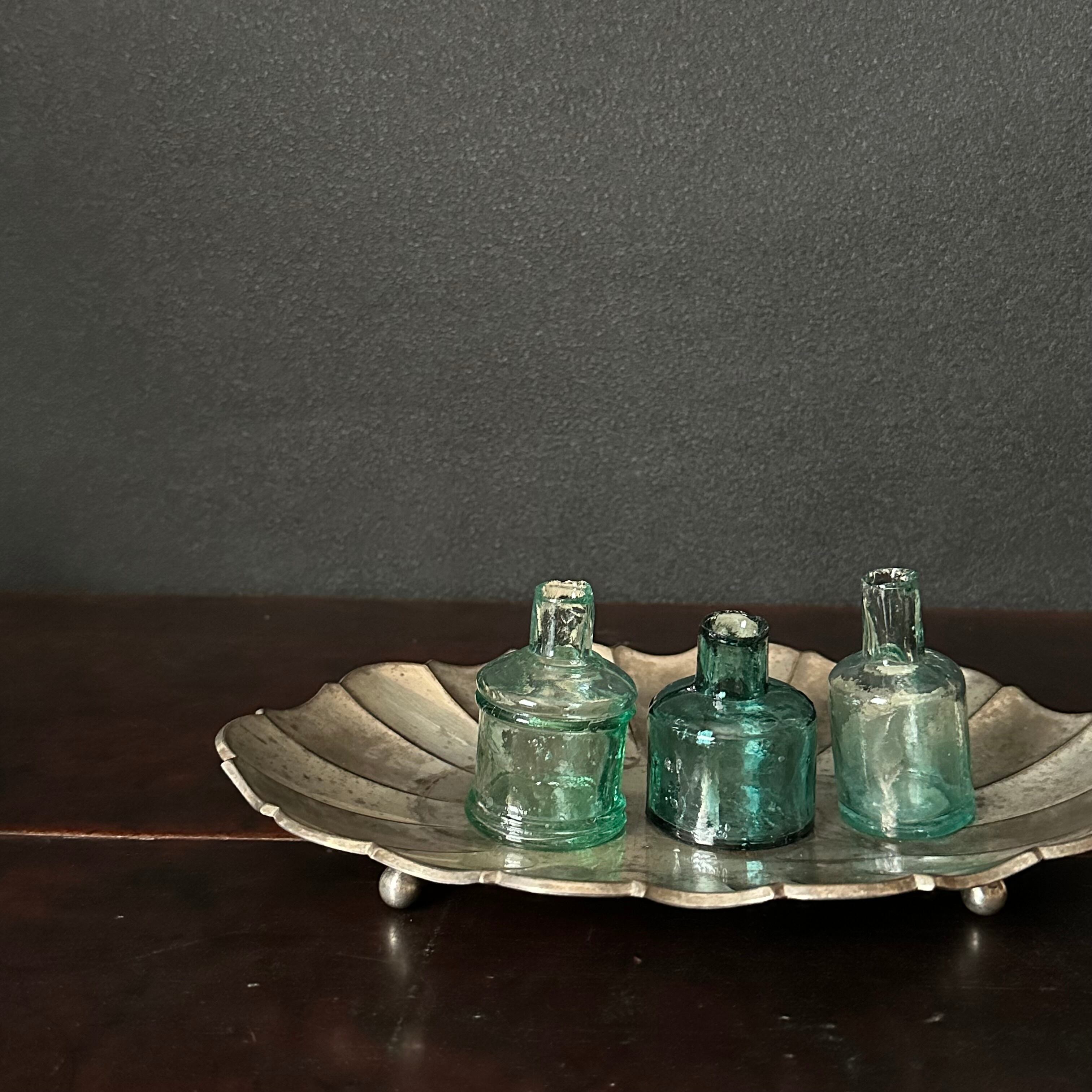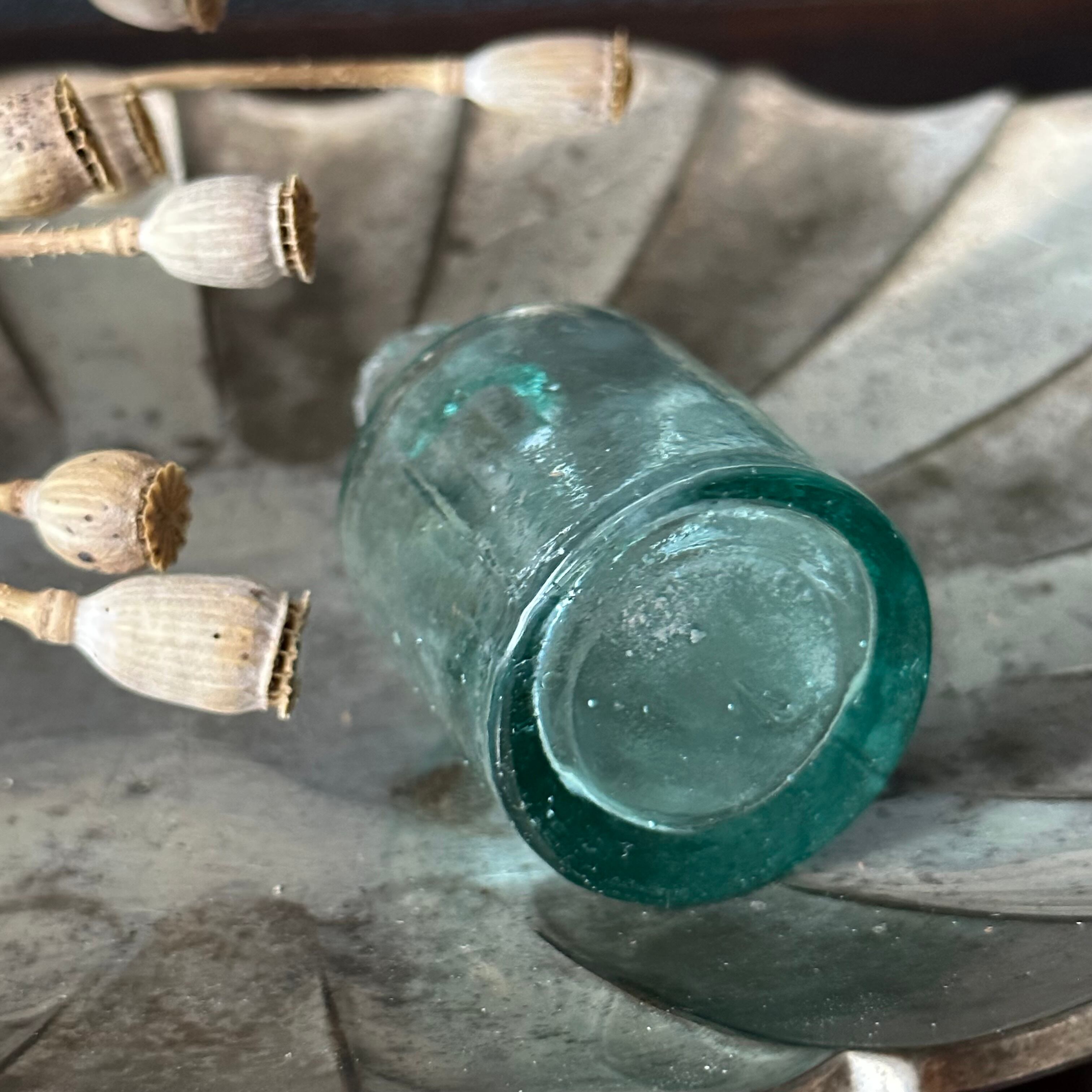 グリーンとブルーが合わさったような鮮やかな色合いのインクボトルはとても古いもの。たくさんの気泡が入っていたり、形の歪さやギザギザの口に愛嬌を感じます。1つ1つ微妙に異なる色味や形に個性があり、自分好みを探すのも面白いアイテムなのではないでしょうか。