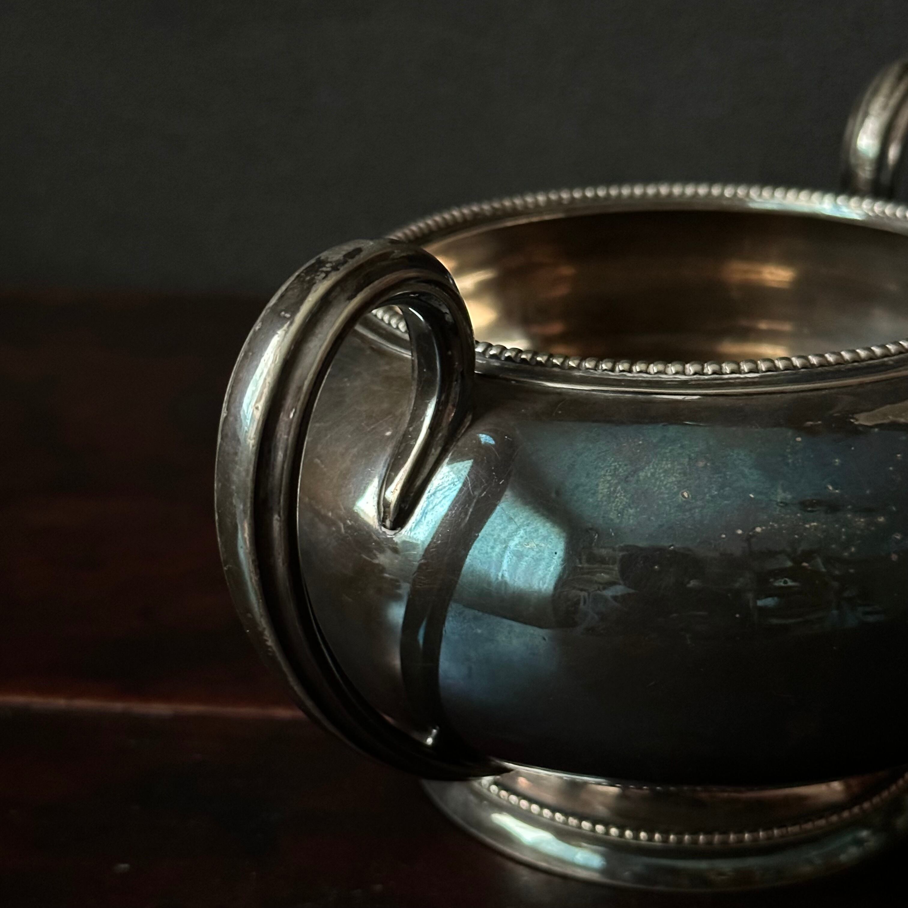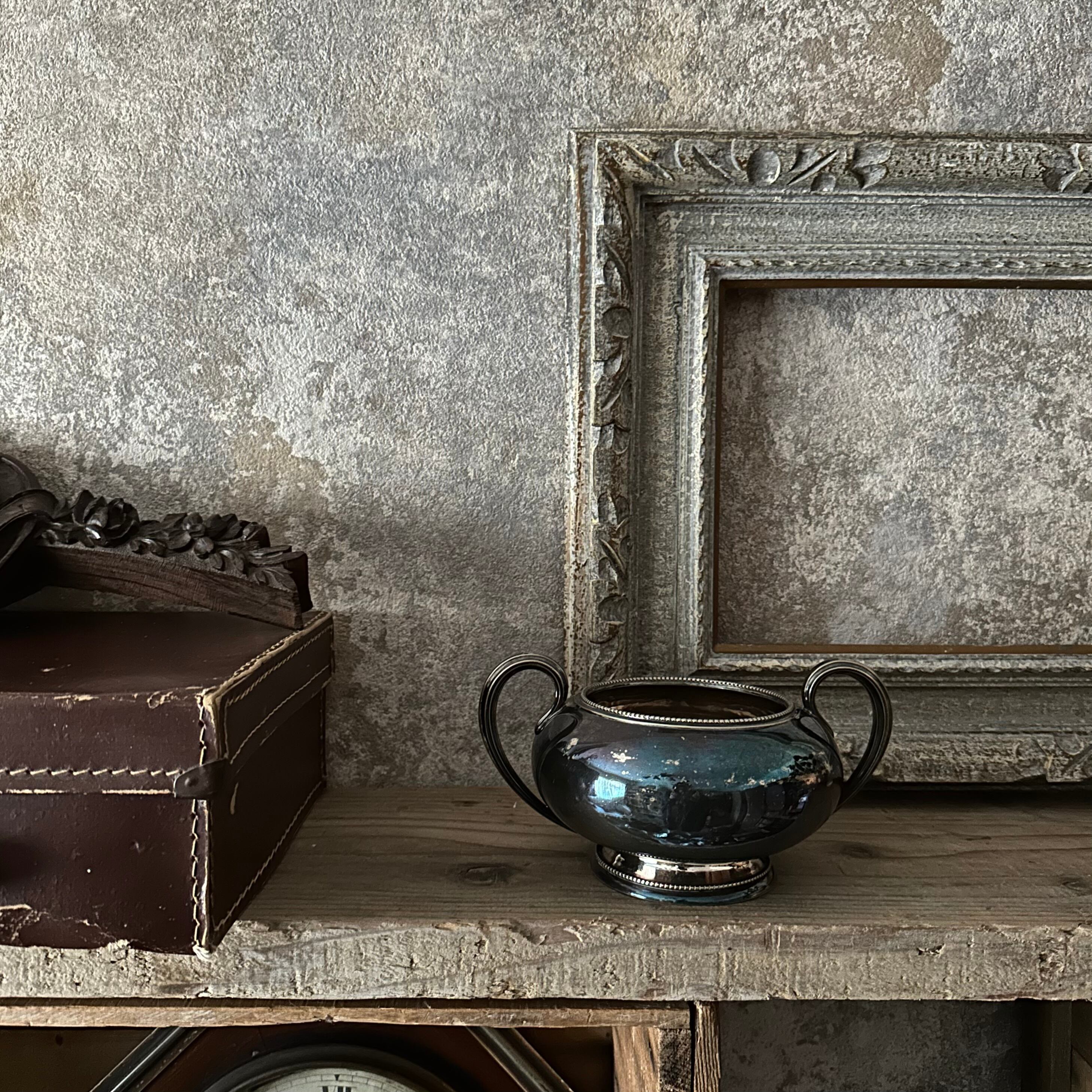 経年によるシルバープレート独特の青みがかった色の変化はきれいに磨くことも出来ますが、時間が作りだした美しさでもあり、あえてそのままにしています。見る角度によりブルー、グレー、パープルなどたくさんの発色をお楽しみいただけます。
