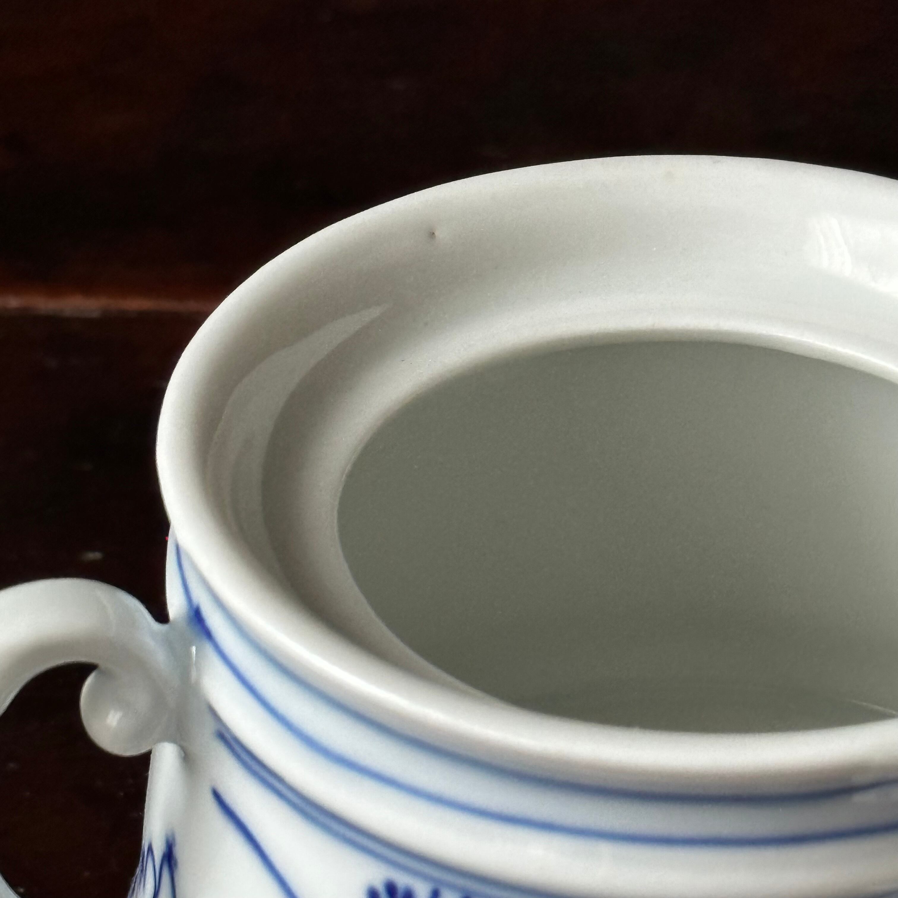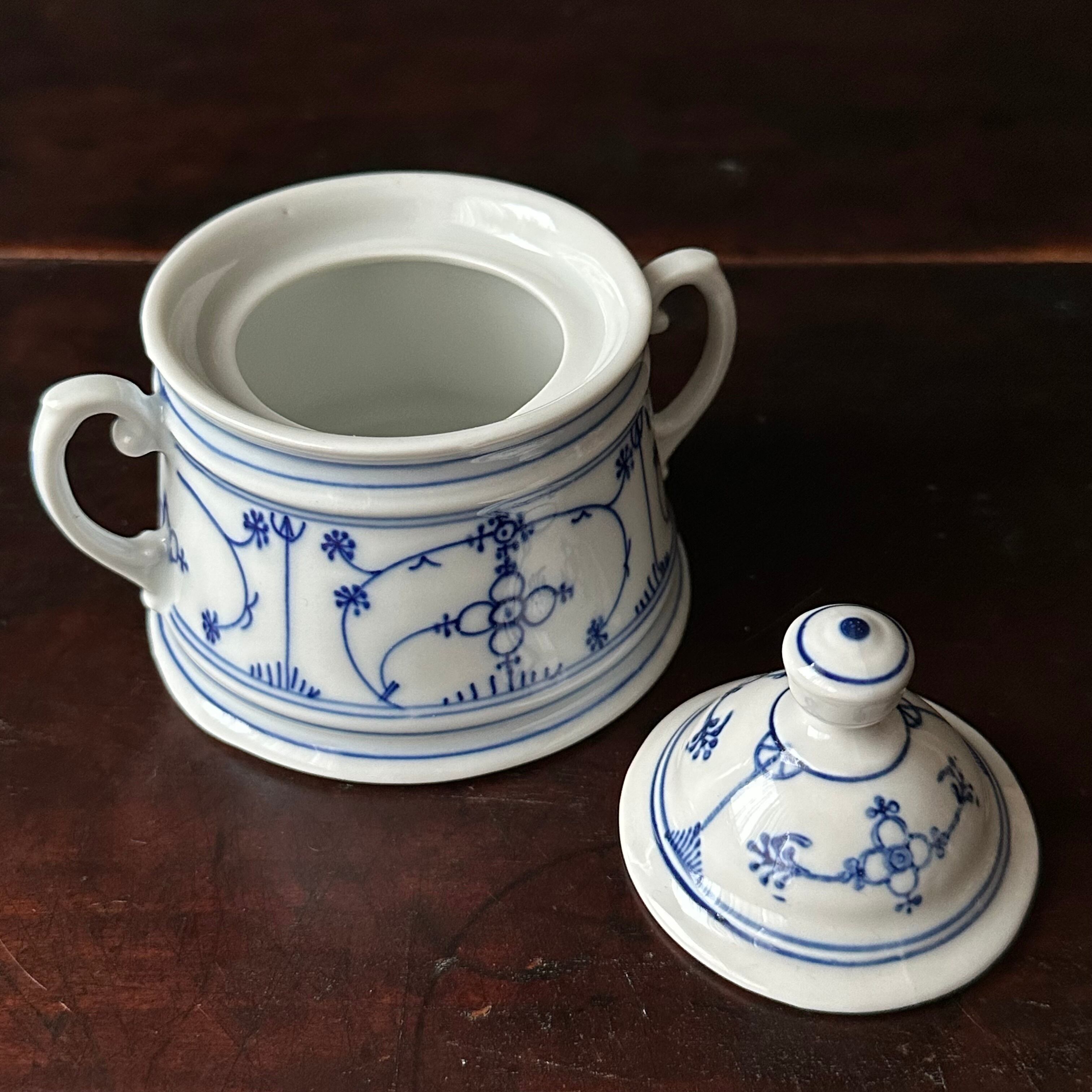 白地にブルーの爽やかなサキソニー柄がきれいなシュガーポット。